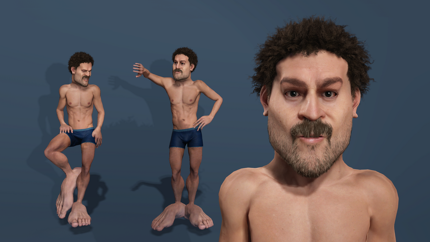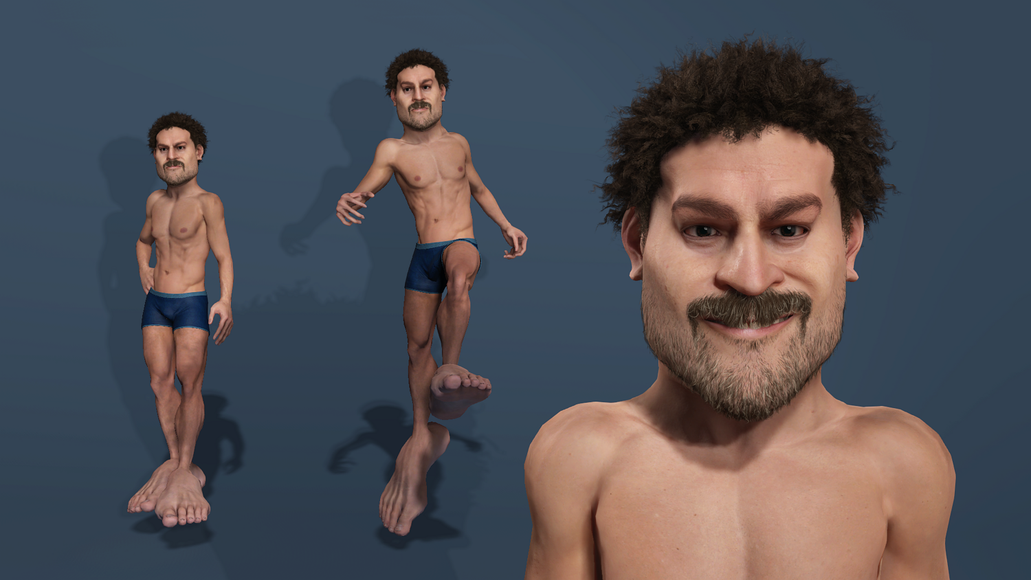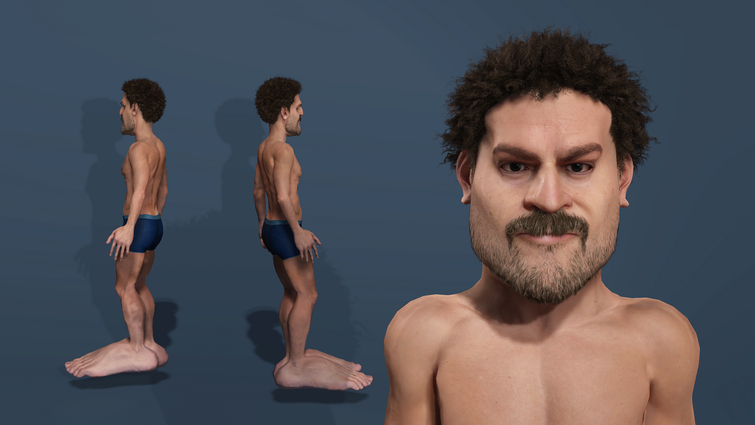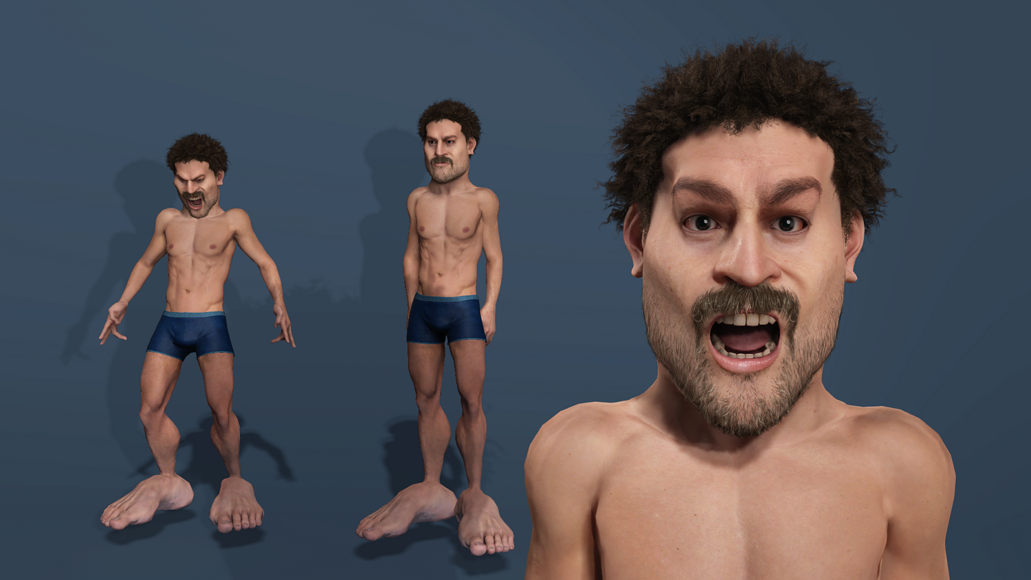 Introducing a unique, stylized 3D character model: the "Stylized Big-Foot Man". This model is expertly crafted with a distinctive, exaggerated aesthetic, featuring a square jawline, curly hair, and most notably, comically oversized feet. This character is designed to stand out in any project.
