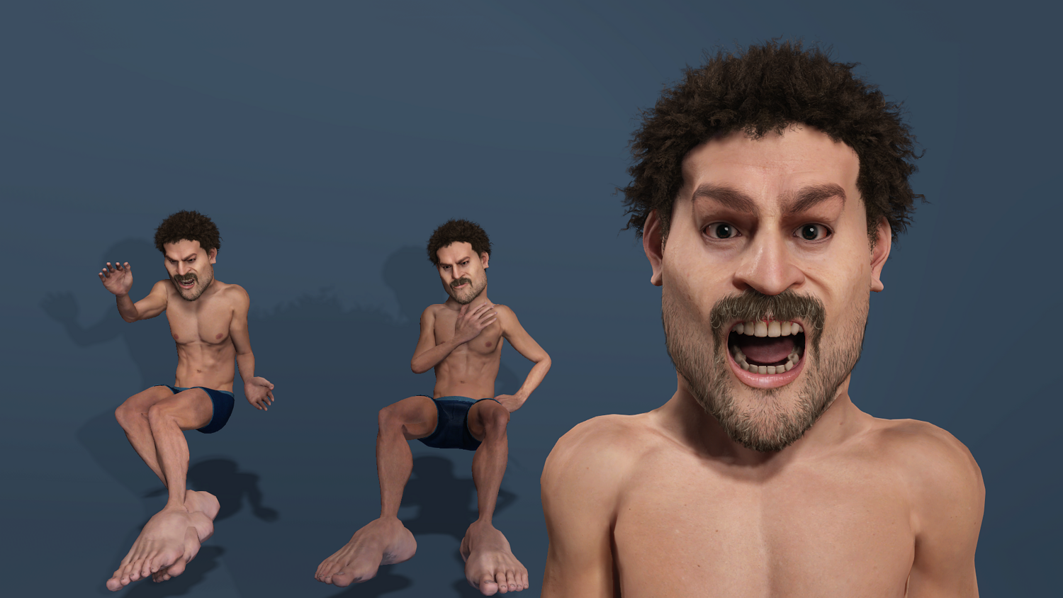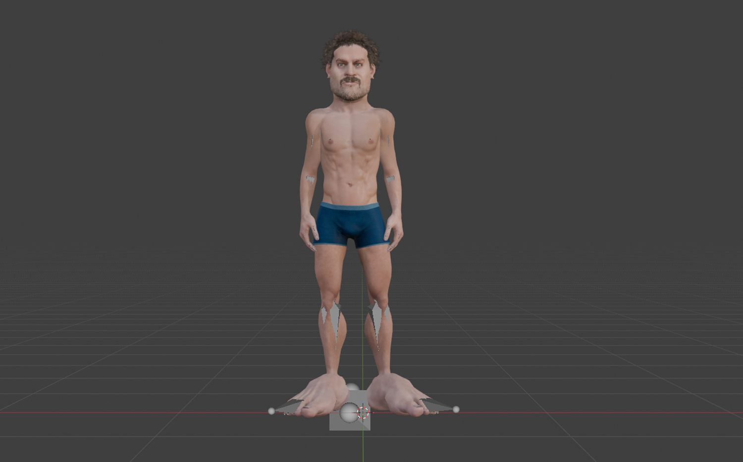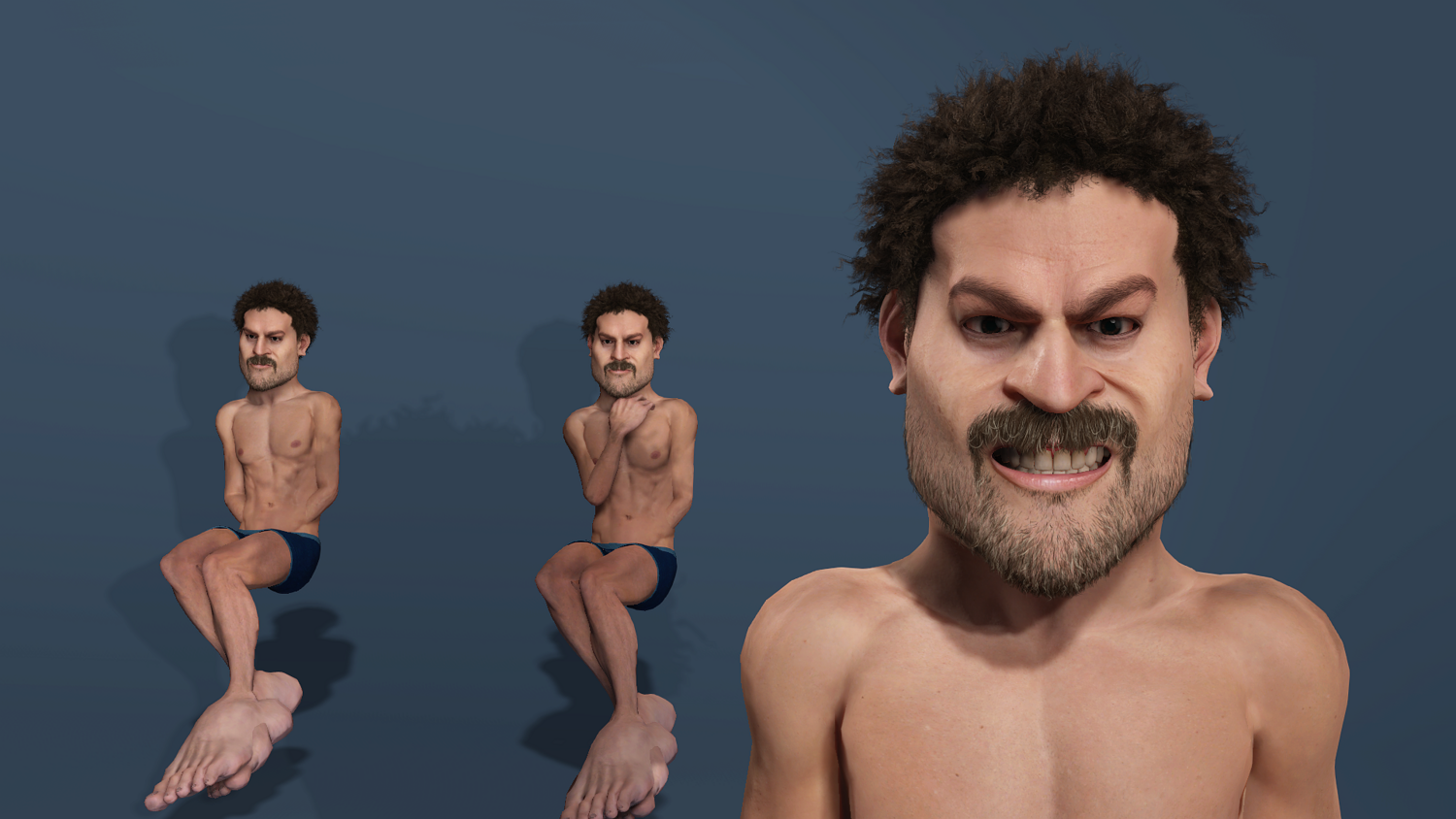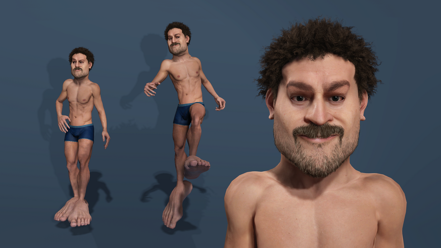 Introducing a unique, stylized 3D character model: the "Stylized Big-Foot Man". This model is expertly crafted with a distinctive, exaggerated aesthetic, featuring a square jawline, curly hair, and most notably, comically oversized feet. This character is designed to stand out in any project.