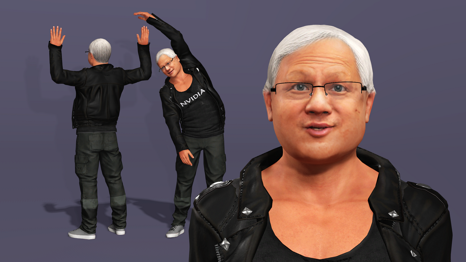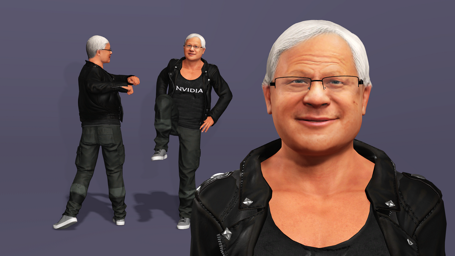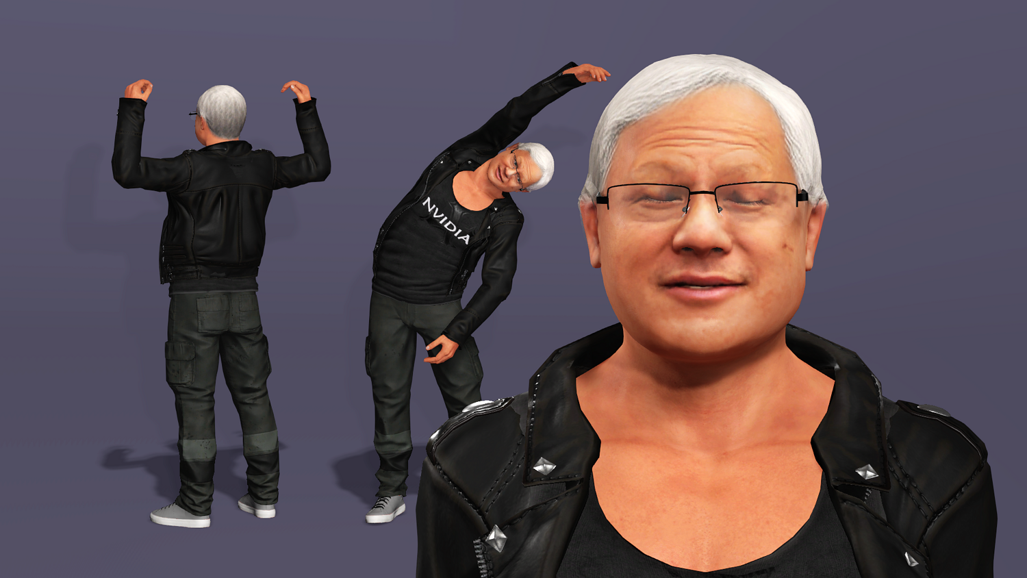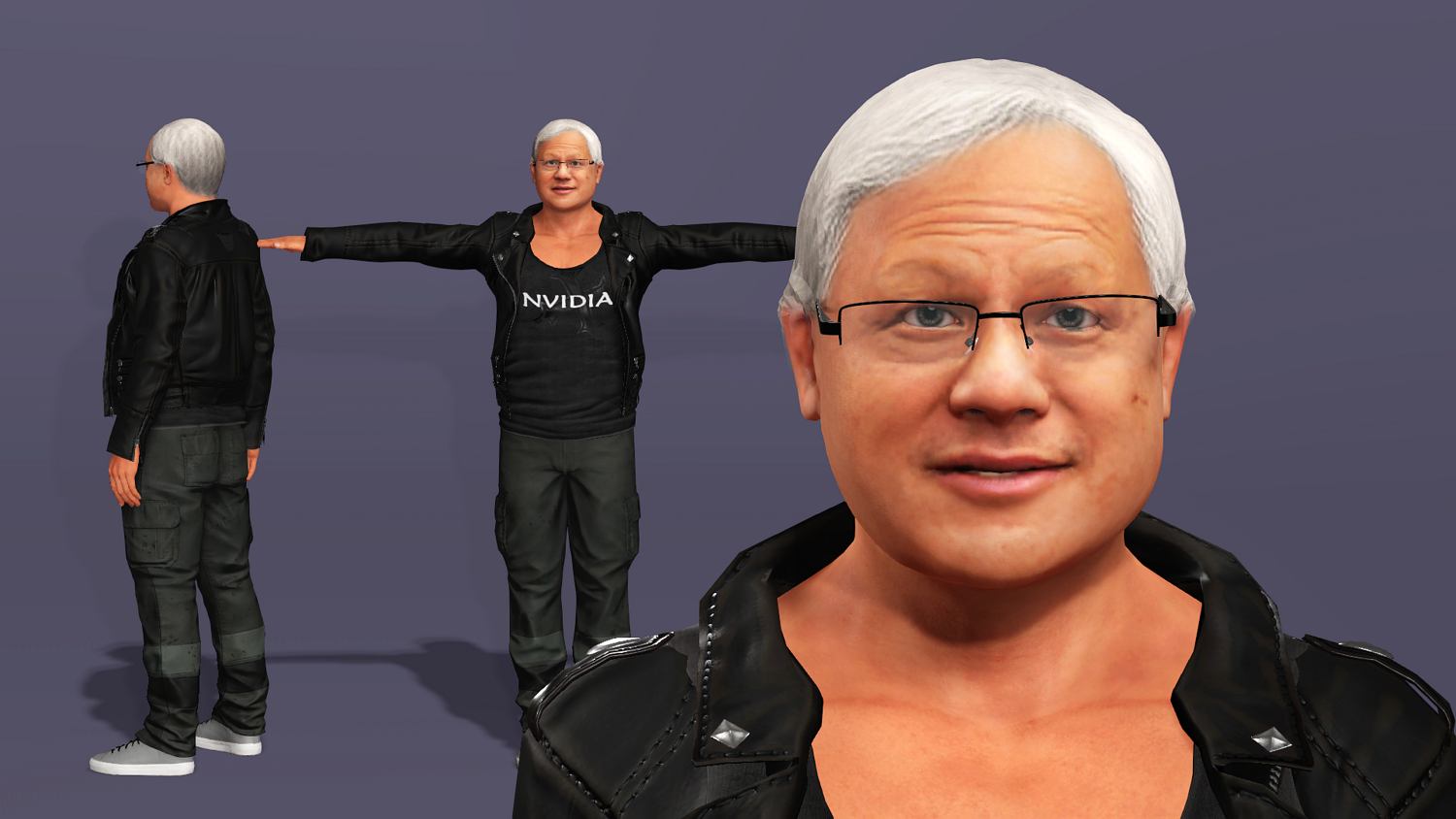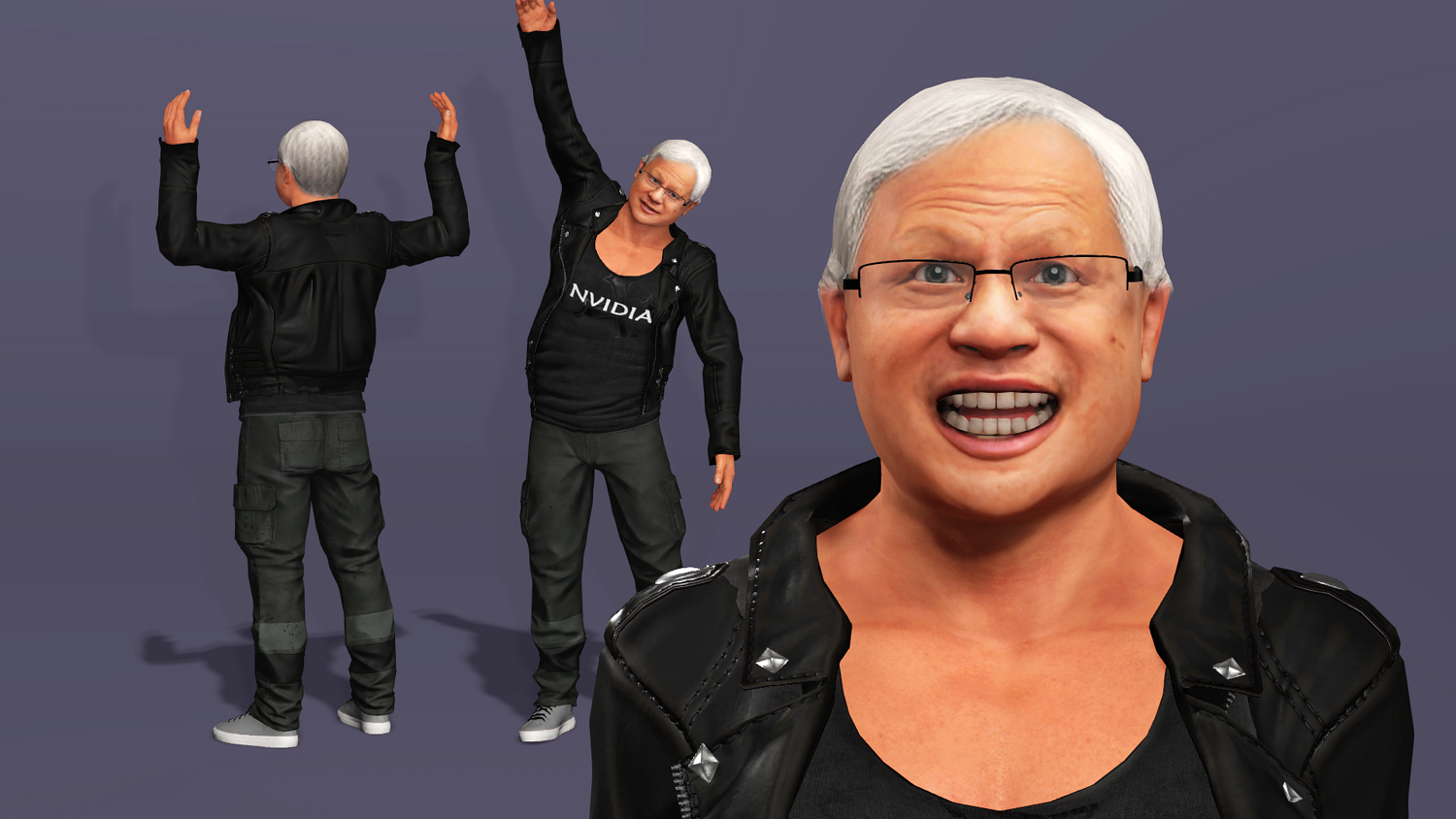 This is a high-quality realistic 3D model of Jensen Huang, vividly recreating the iconic look of NVIDIA’s founder and CEO – leather jacket, jeans, and his energetic stage presence.