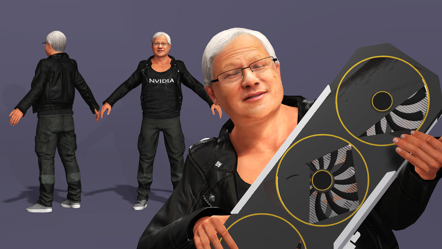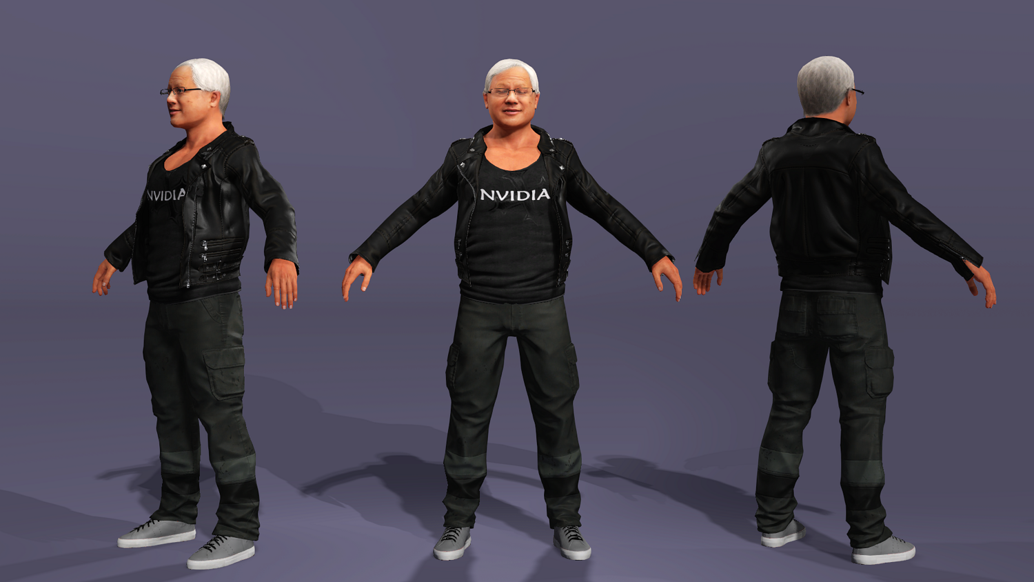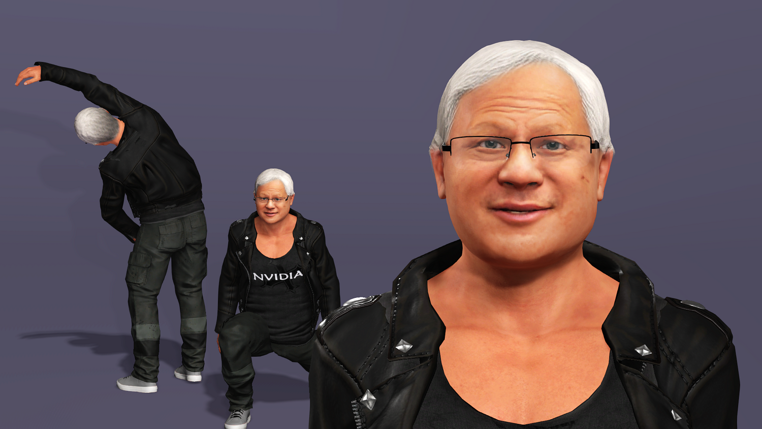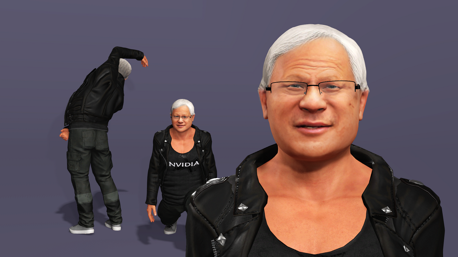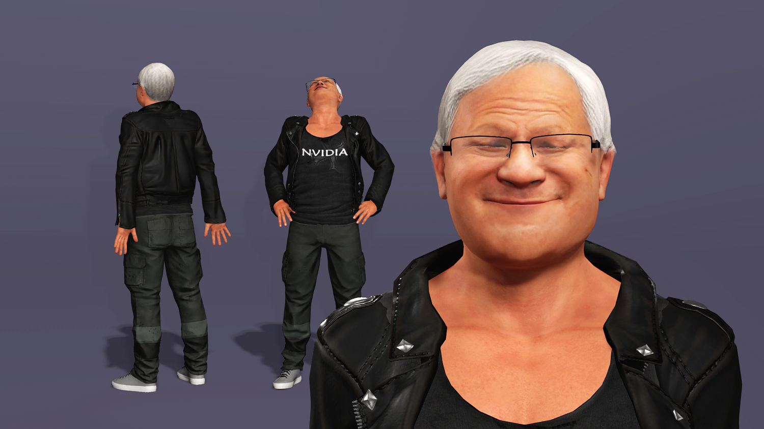 This is a high-quality realistic 3D model of Jensen Huang, vividly recreating the iconic look of NVIDIA’s founder and CEO – leather jacket, jeans, and his energetic stage presence.