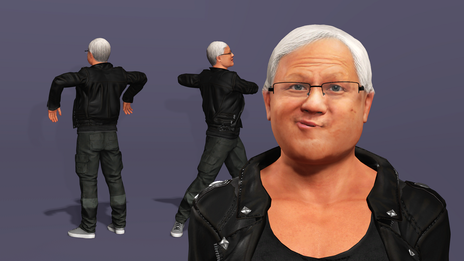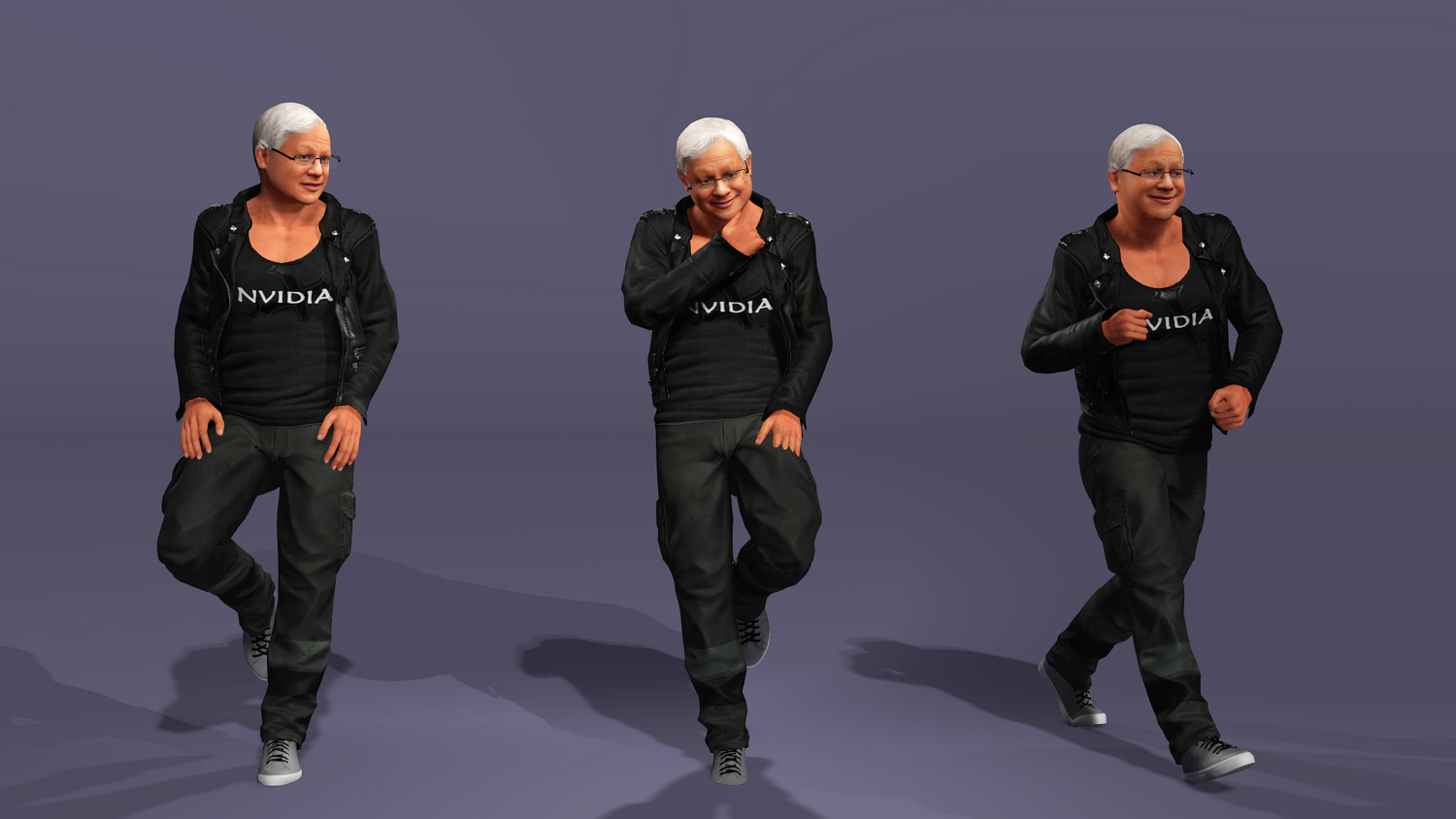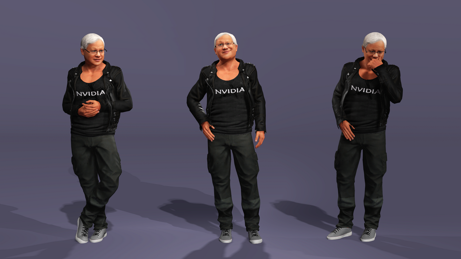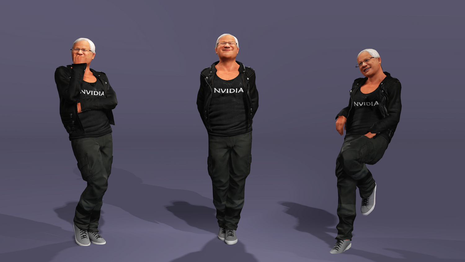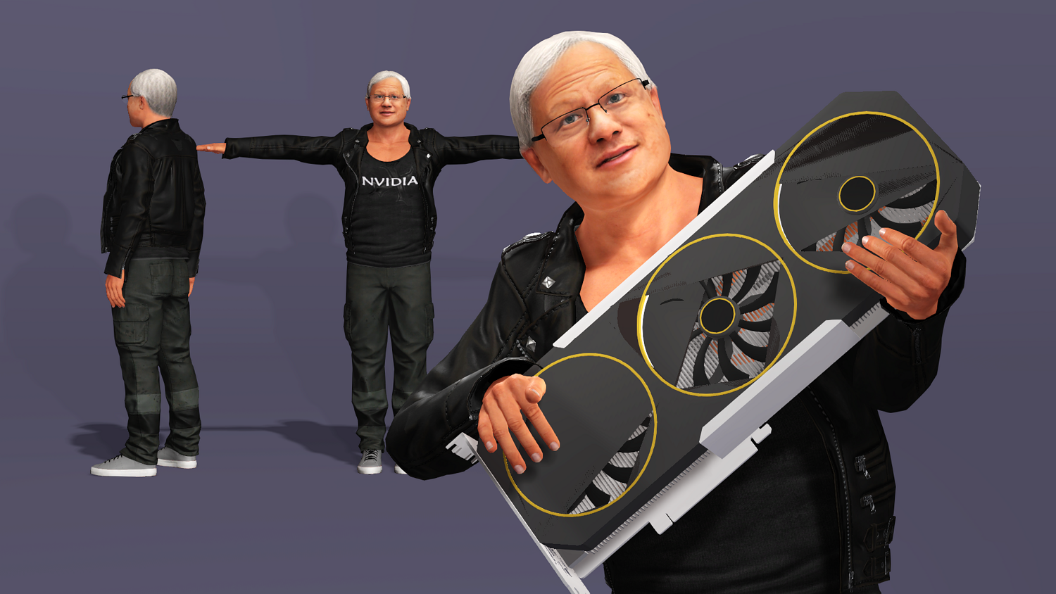 This is a high-quality realistic 3D model of Jensen Huang, vividly recreating the iconic look of NVIDIA’s founder and CEO – leather jacket, jeans, and his energetic stage presence.