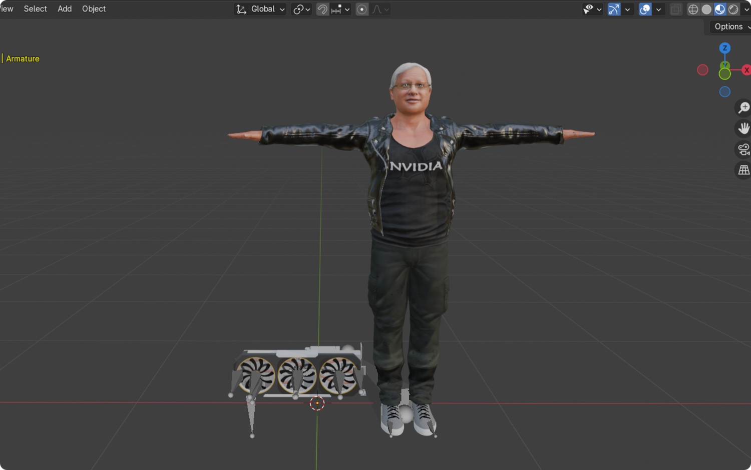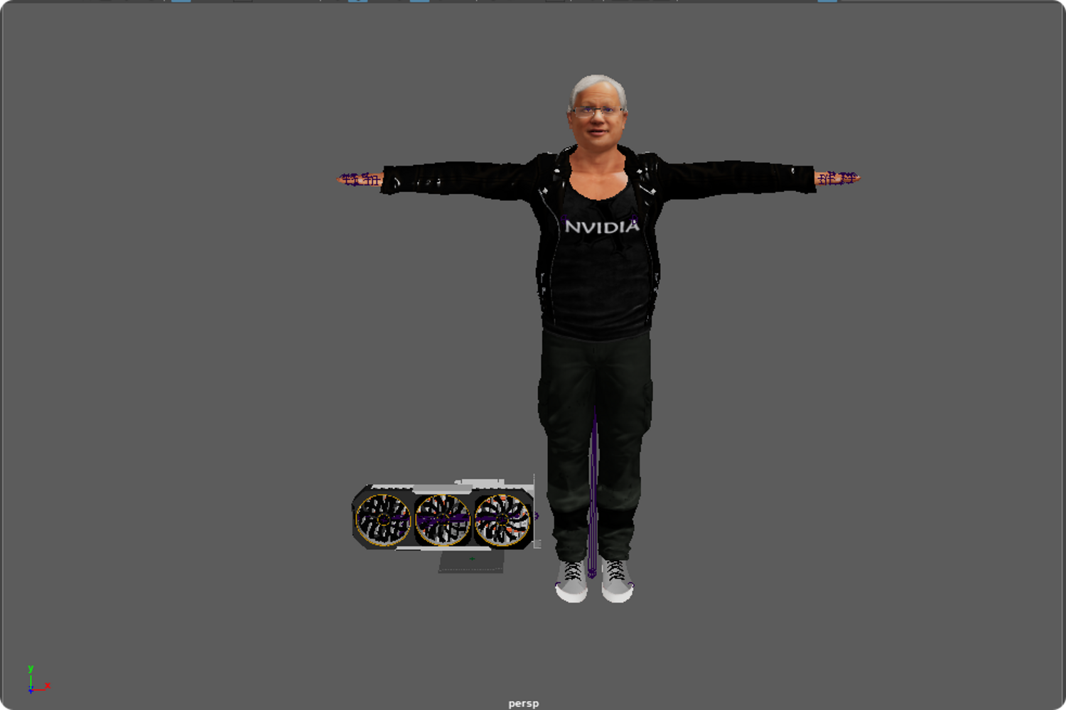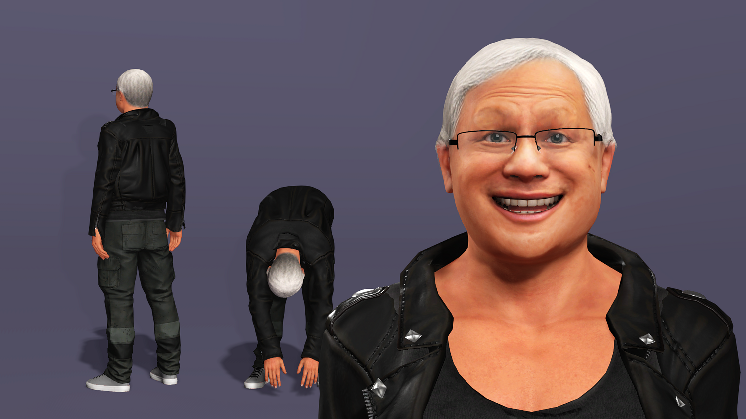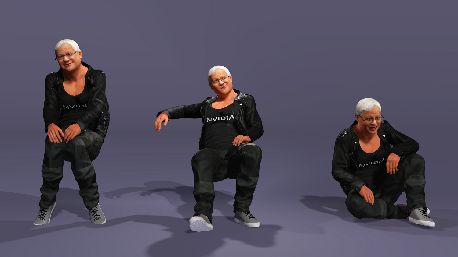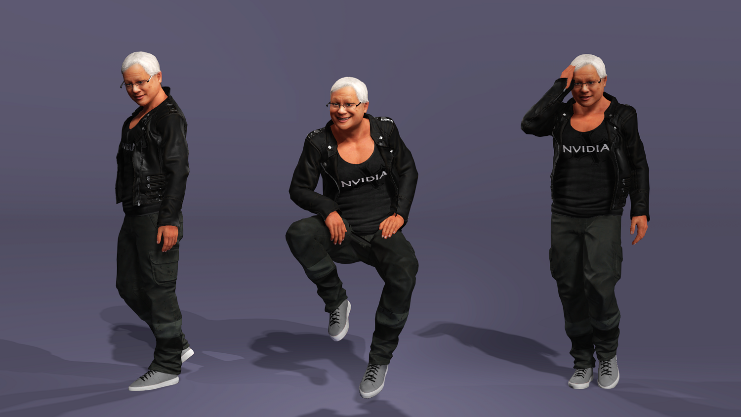 This is a high-quality realistic 3D model of Jensen Huang, vividly recreating the iconic look of NVIDIA’s founder and CEO – leather jacket, jeans, and his energetic stage presence.