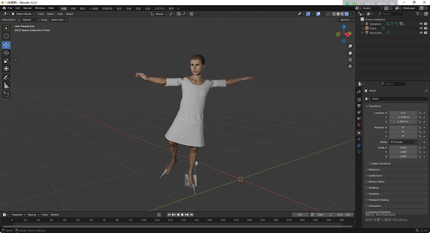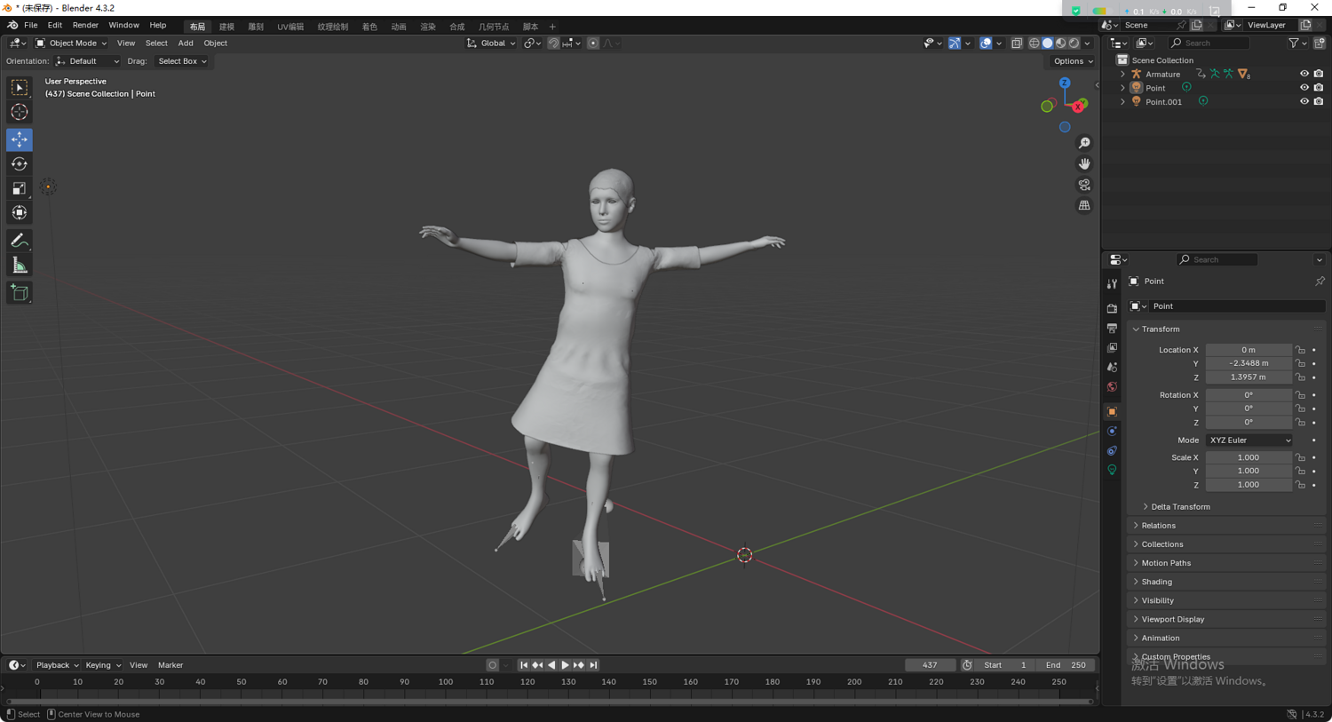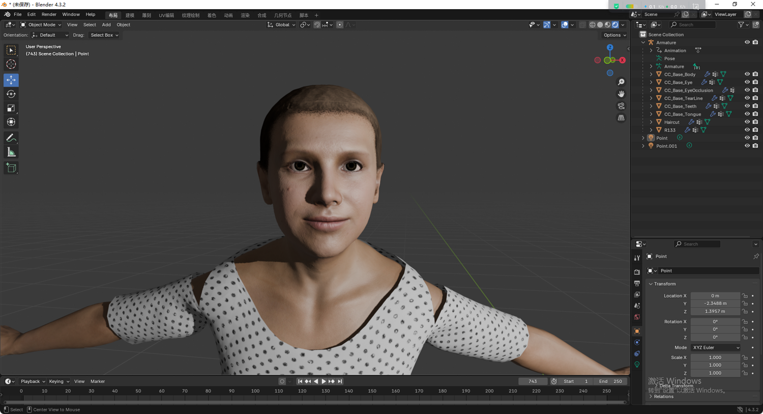 模型包含完整的全身骨骼绑定与面部表情绑定,支持复杂肢体动作与丰富表情演绎,并附带一段芭蕾舞动作演示,便于快速测试动画表现。