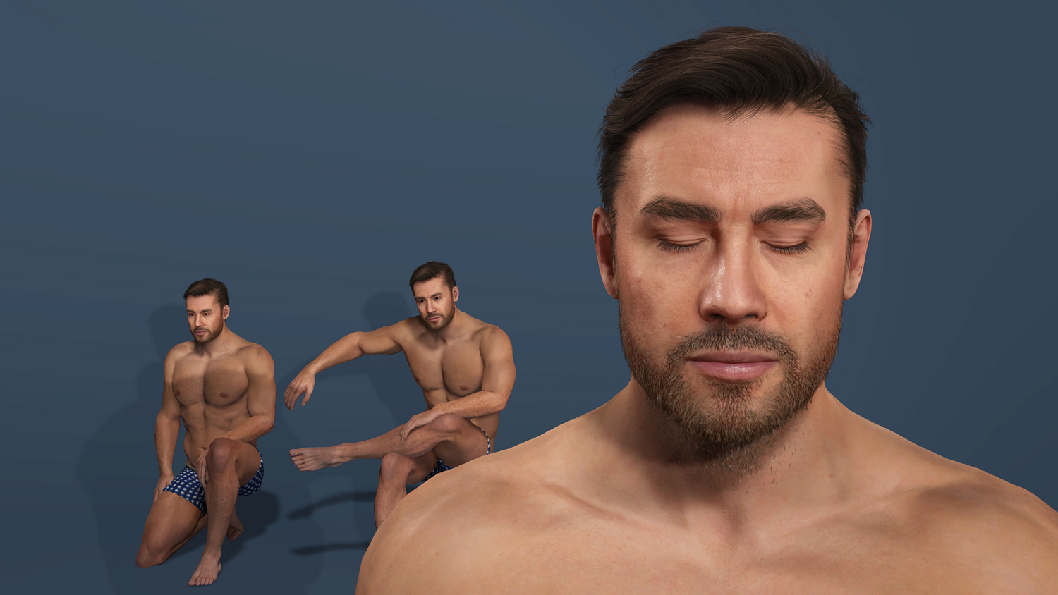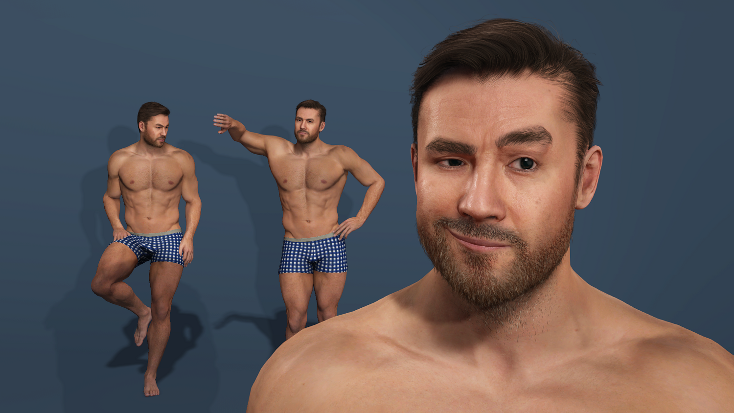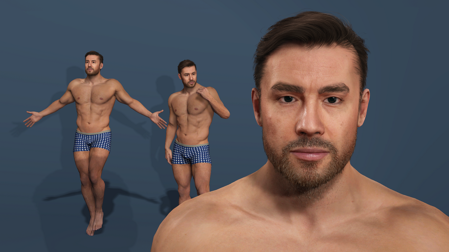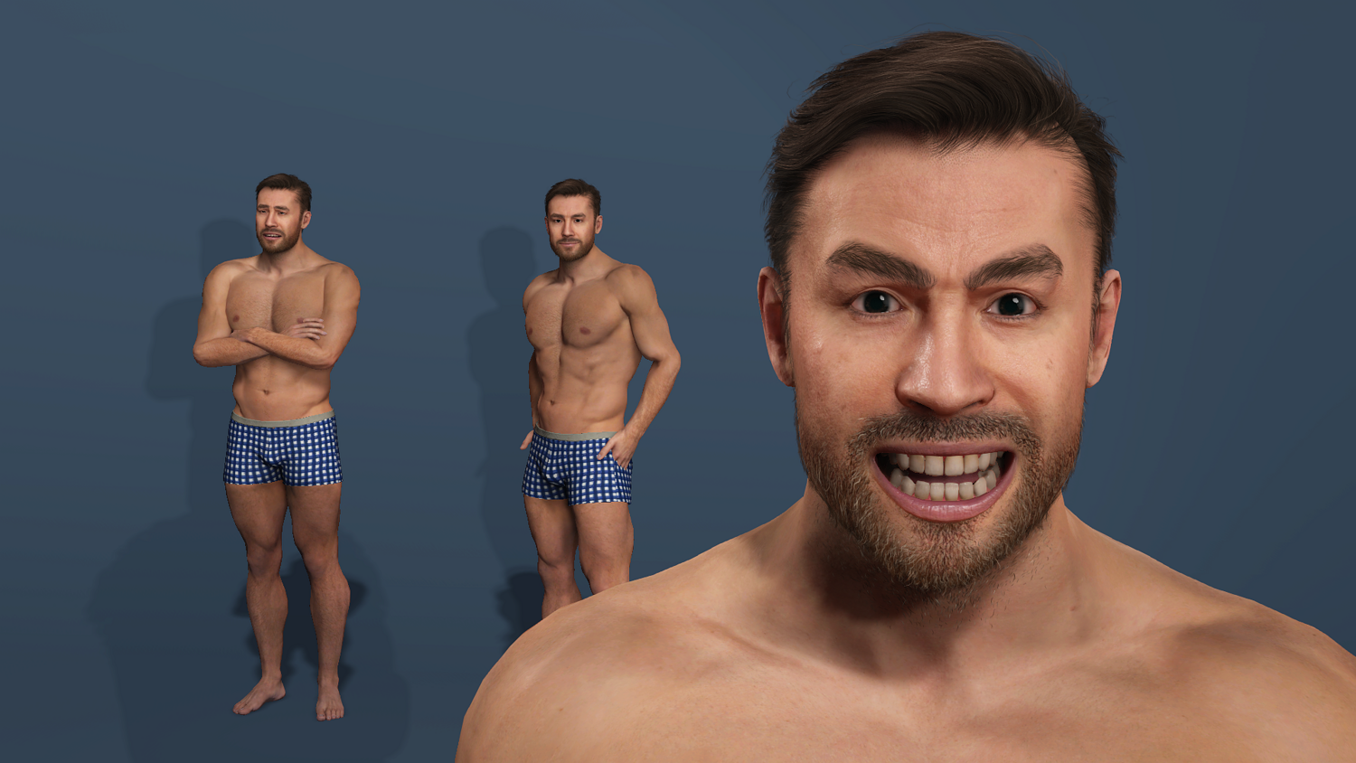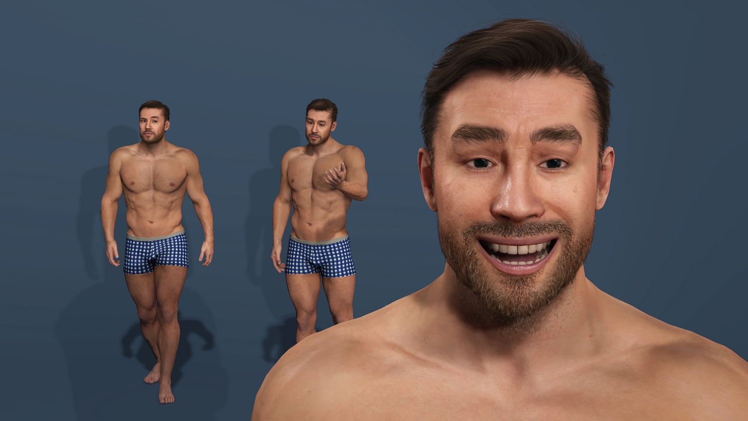 High-detail realistic muscular male model with full UE-compatible rigging (body + face). Includes muscle flex showcase animation. Polygon count: 42,825 polys / 72,234 verts. Five formats: FBX, Blender 4.3.2, 3ds Max 2019, Maya 2022, OBJ. Ready for games, animations, and VR/AR projects. 高细节写实肌肉猛男模型,全身+面部骨骼绑定,完美兼容UE标准骨骼。 附带一段肌肉展示动画。 多边形数:42,825 多边形 / 72,234 顶点。 提供五种格式:FBX、Blender 4.3.2、3ds Max 2019、Maya 2022、OBJ。 适用于游戏、动画和VR/AR项目。
