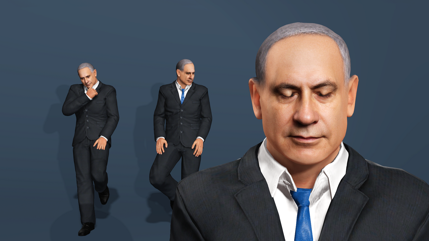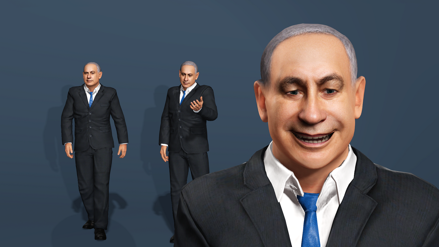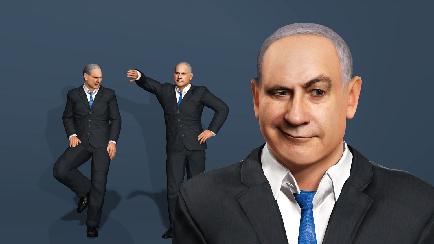 Highly detailed and realistic 3D model of Benjamin Netanyahu in a business suit. This model is production-ready, featuring a comprehensive rig for both body and face, making it suitable for animation, rendering, and game development.