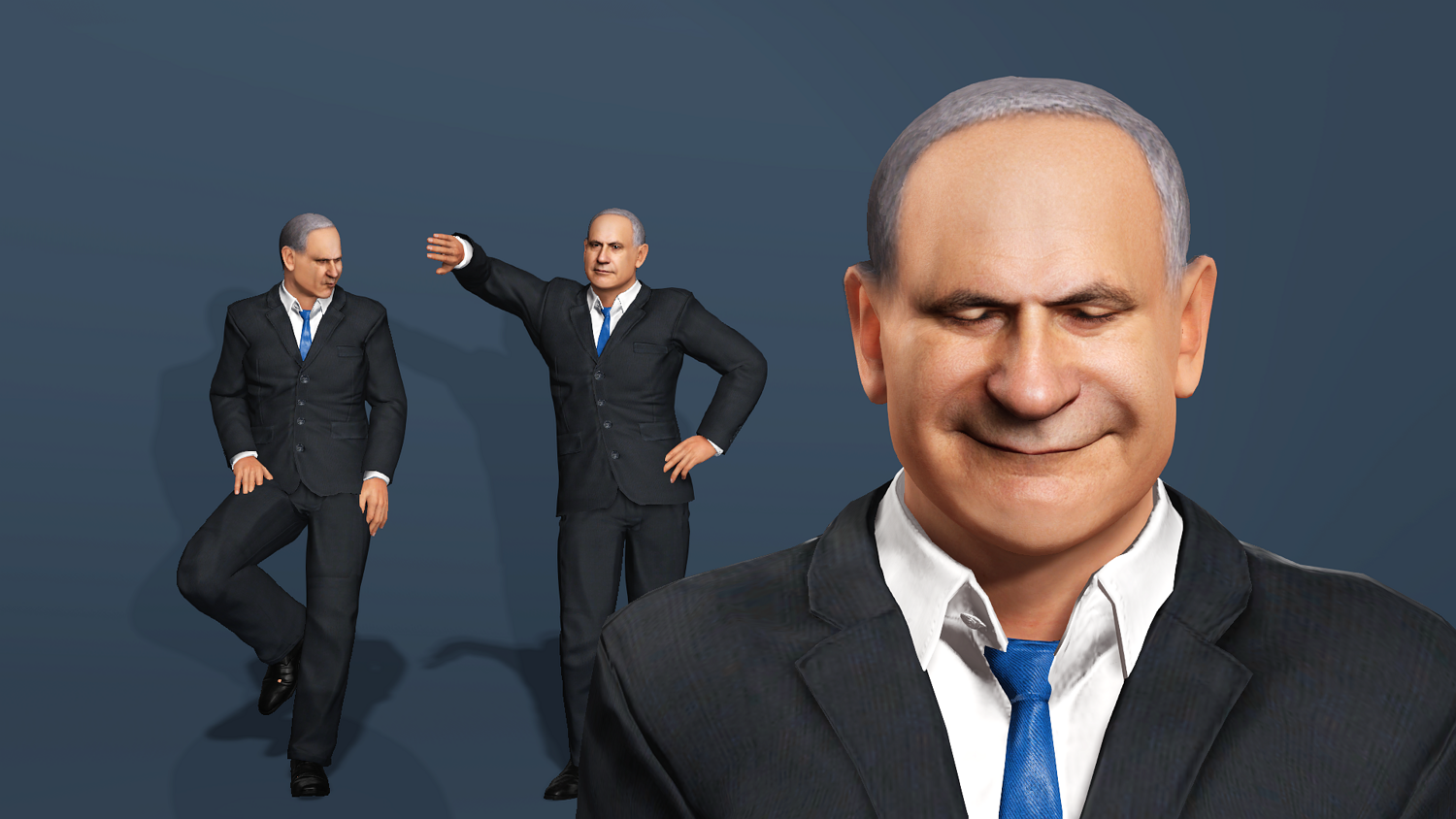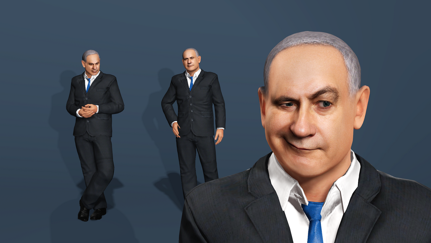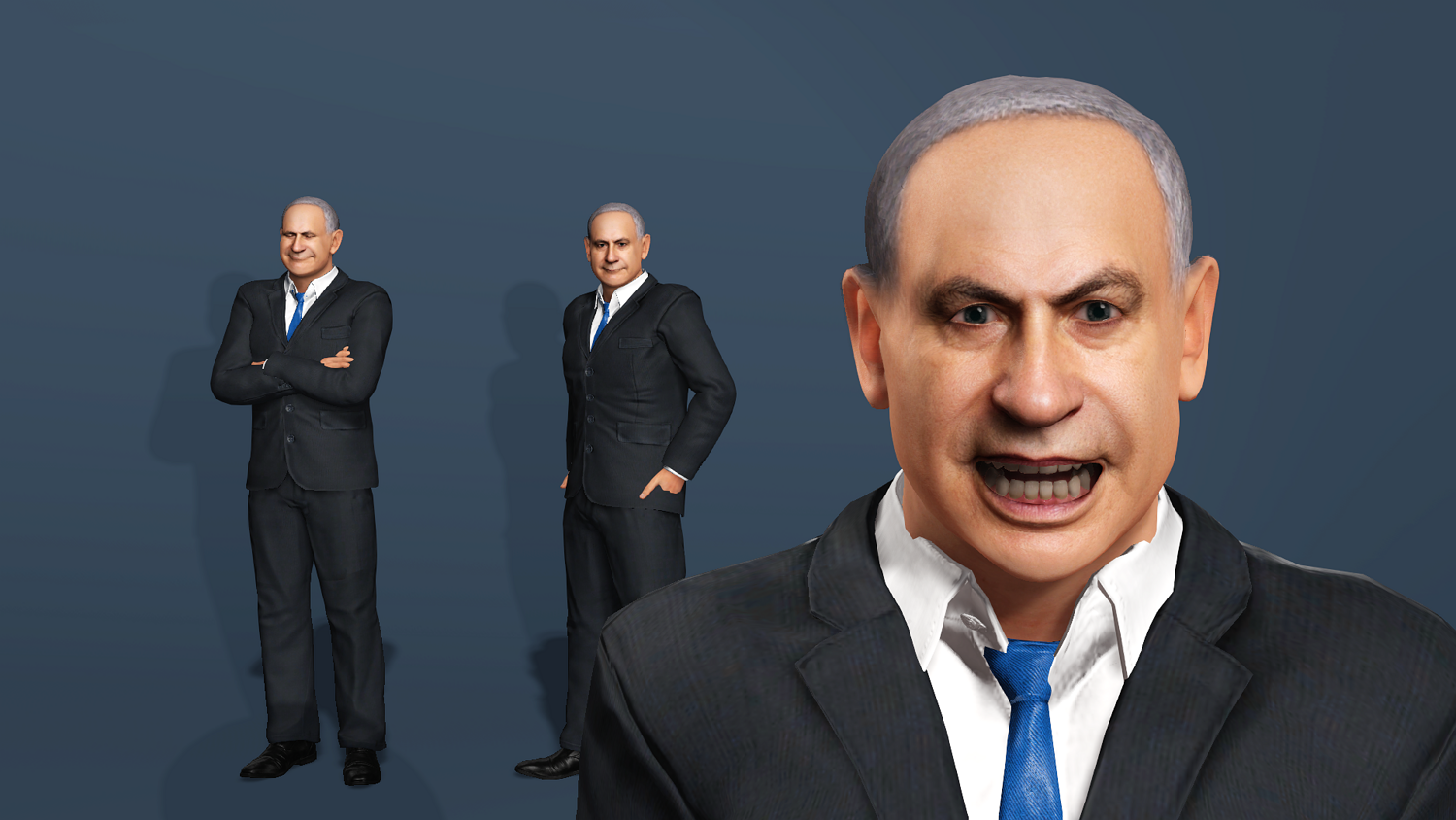 Highly detailed and realistic 3D model of Benjamin Netanyahu in a business suit. This model is production-ready, featuring a comprehensive rig for both body and face, making it suitable for animation, rendering, and game development.