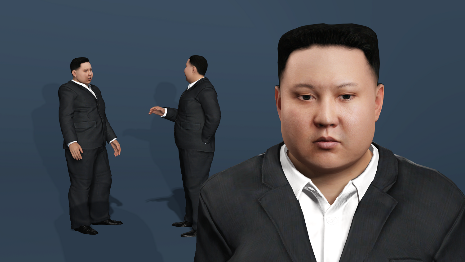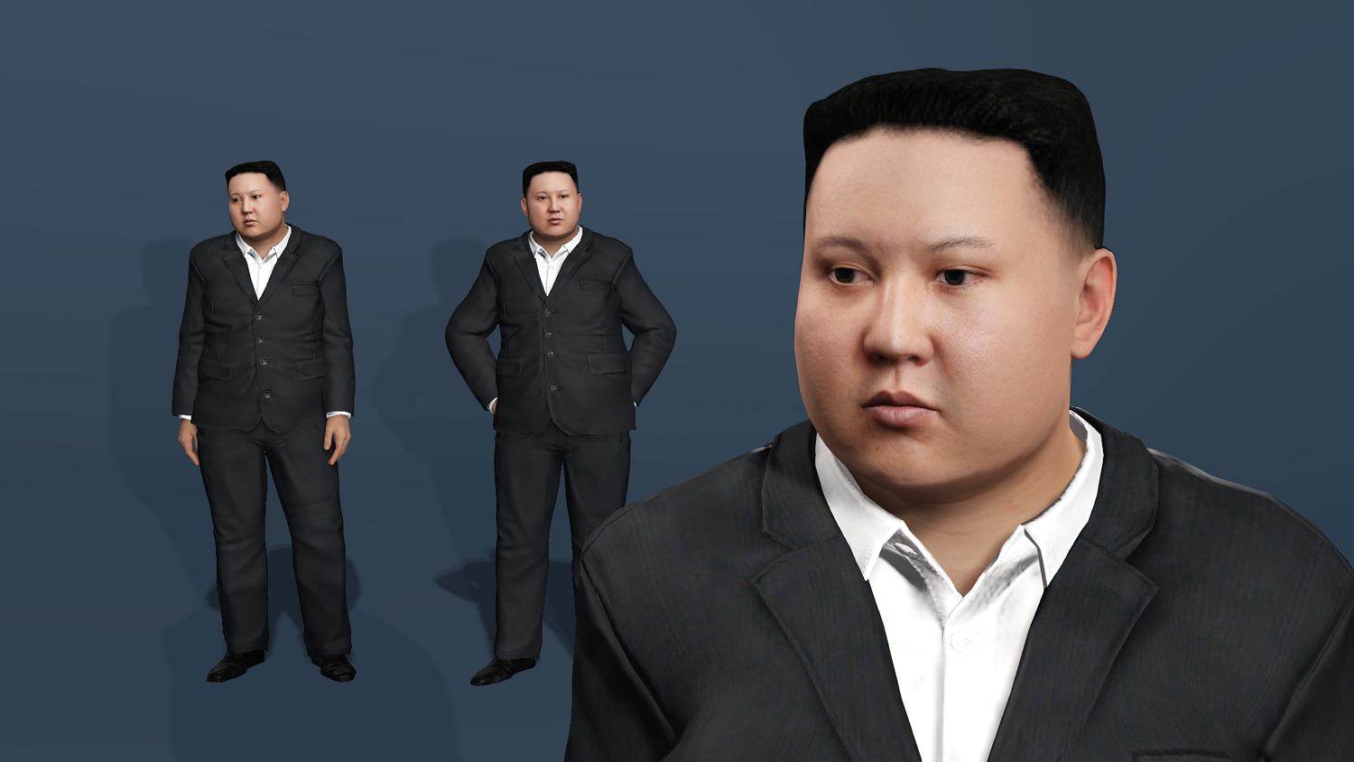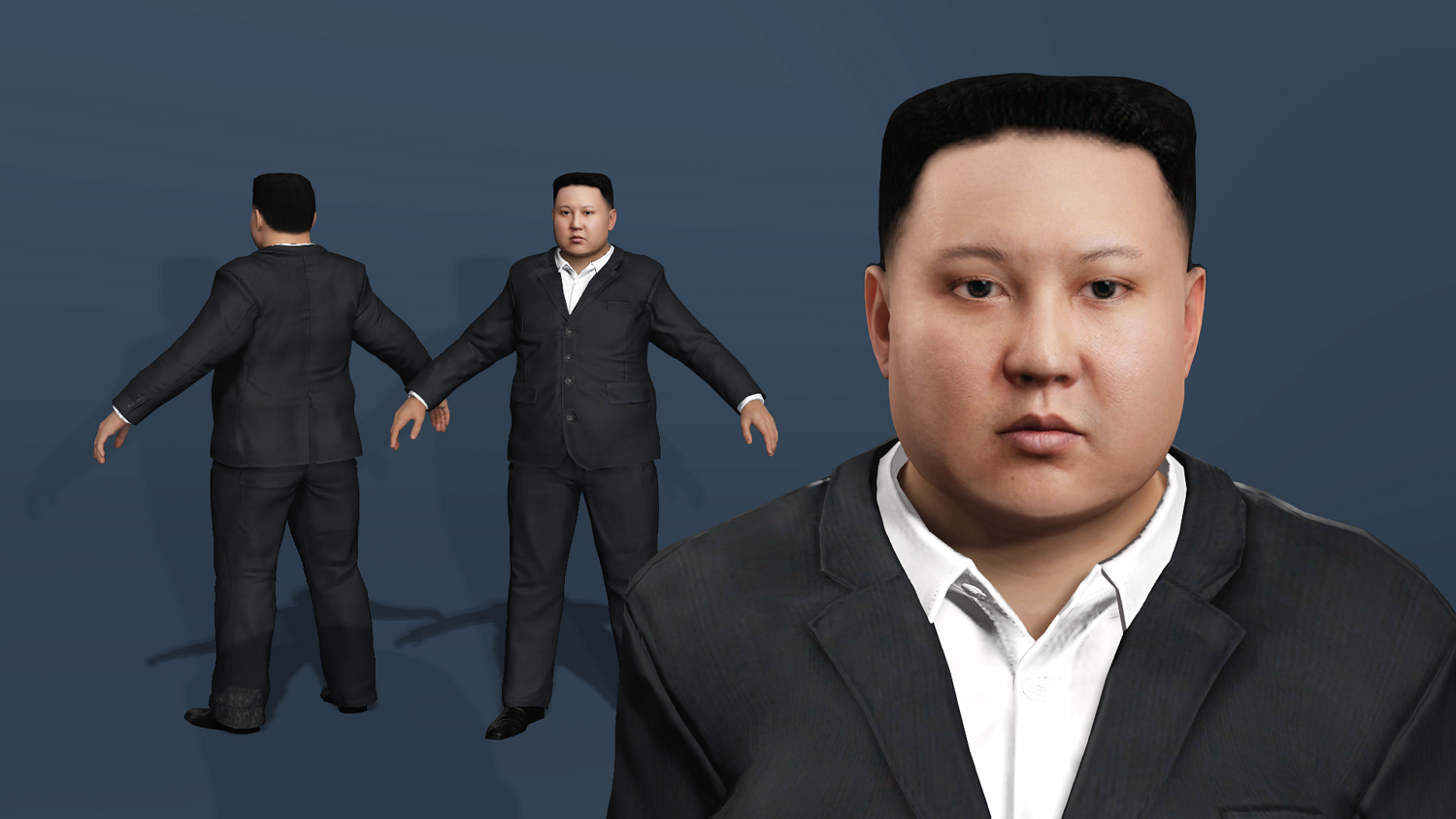 高精度写实金正恩(Kim Jong-un)西装3D模型。该资产具备完整的全身与面部绑定系统,可直接投入动画渲染、影视预演与游戏开发管线。