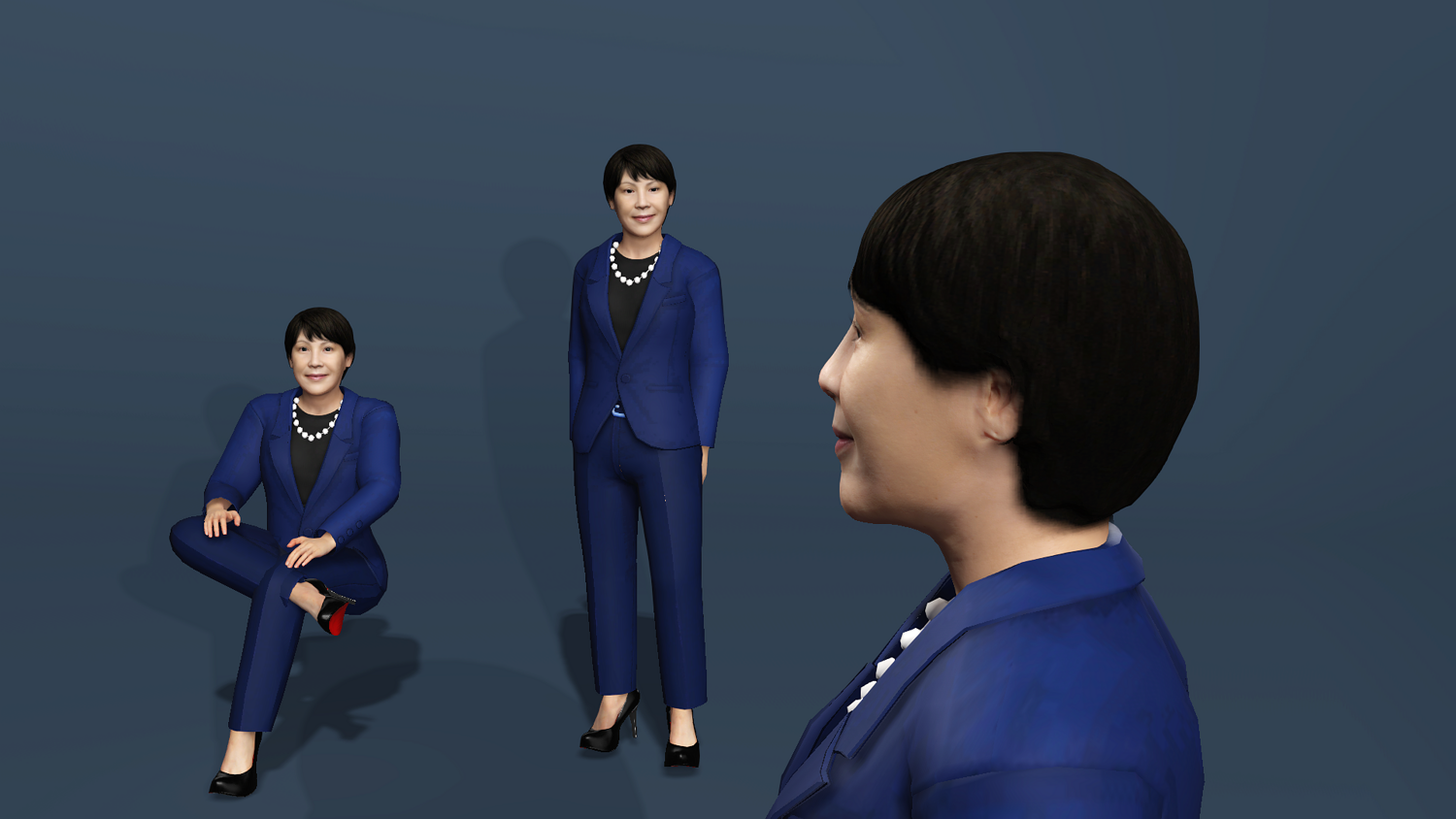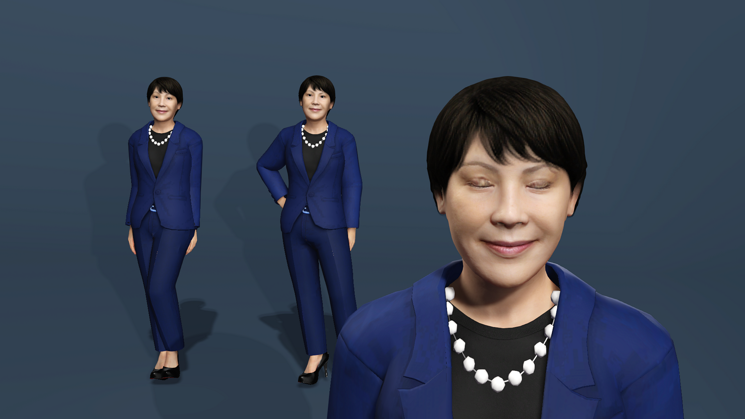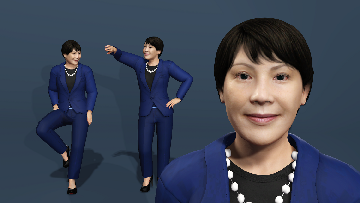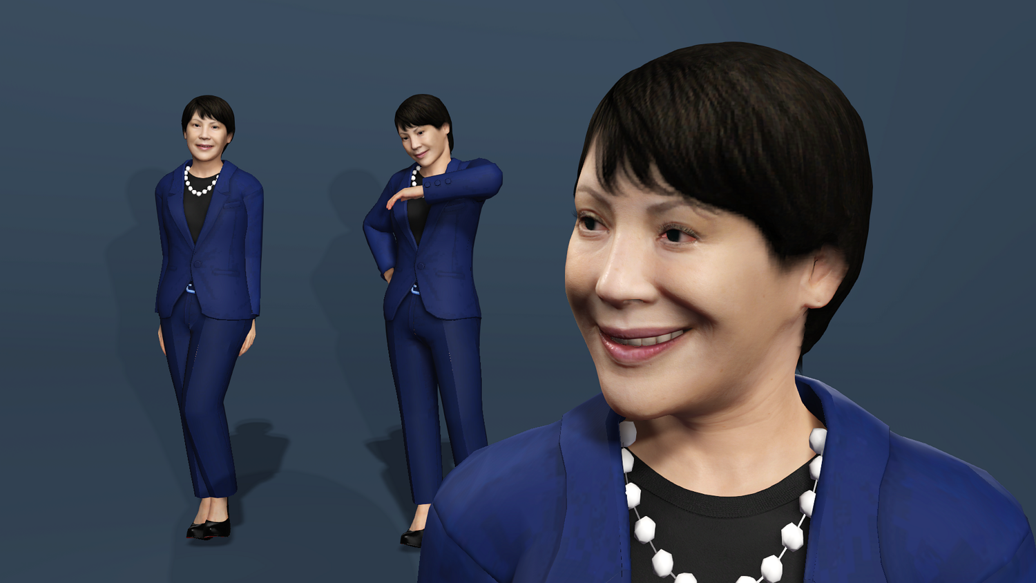 Photorealistic next-generation character of Japanese politician Sanae Takaichi wearing her signature blue suit. Perfect for news visualization, documentaries, arch-viz, and serious games.