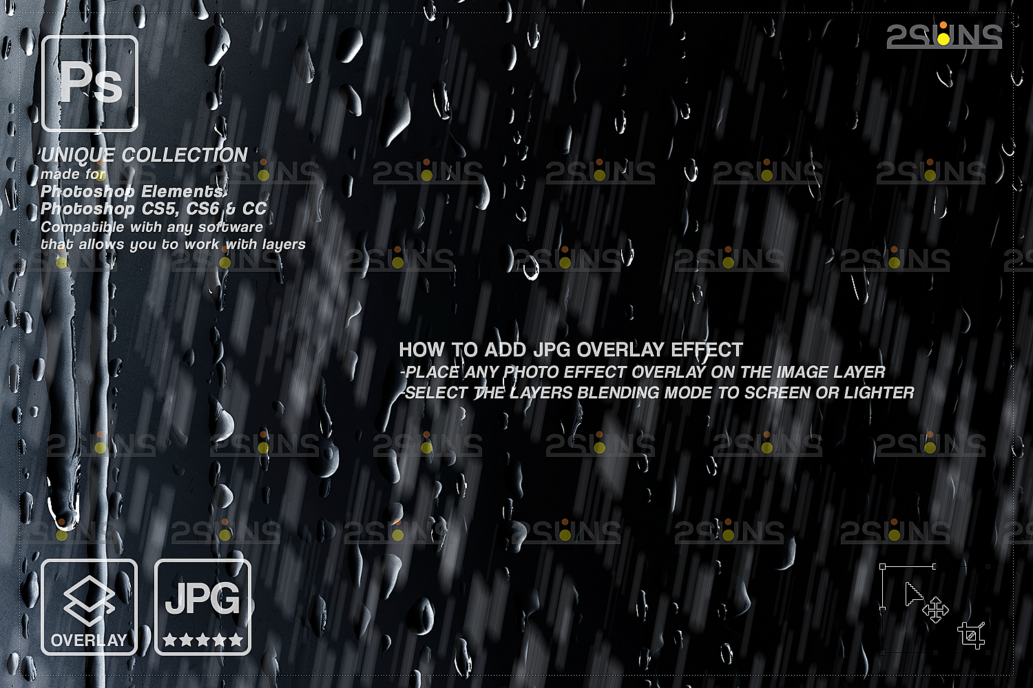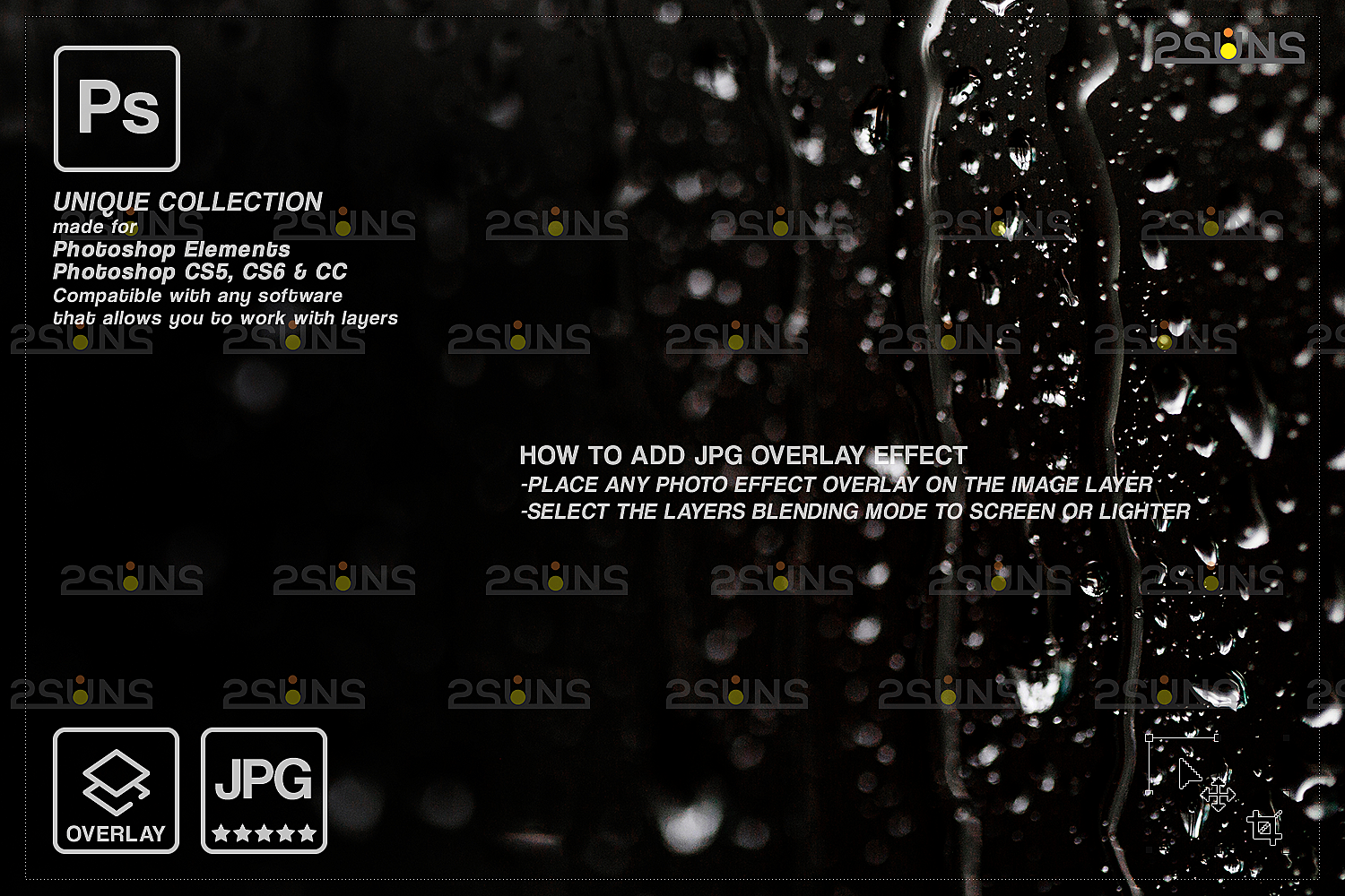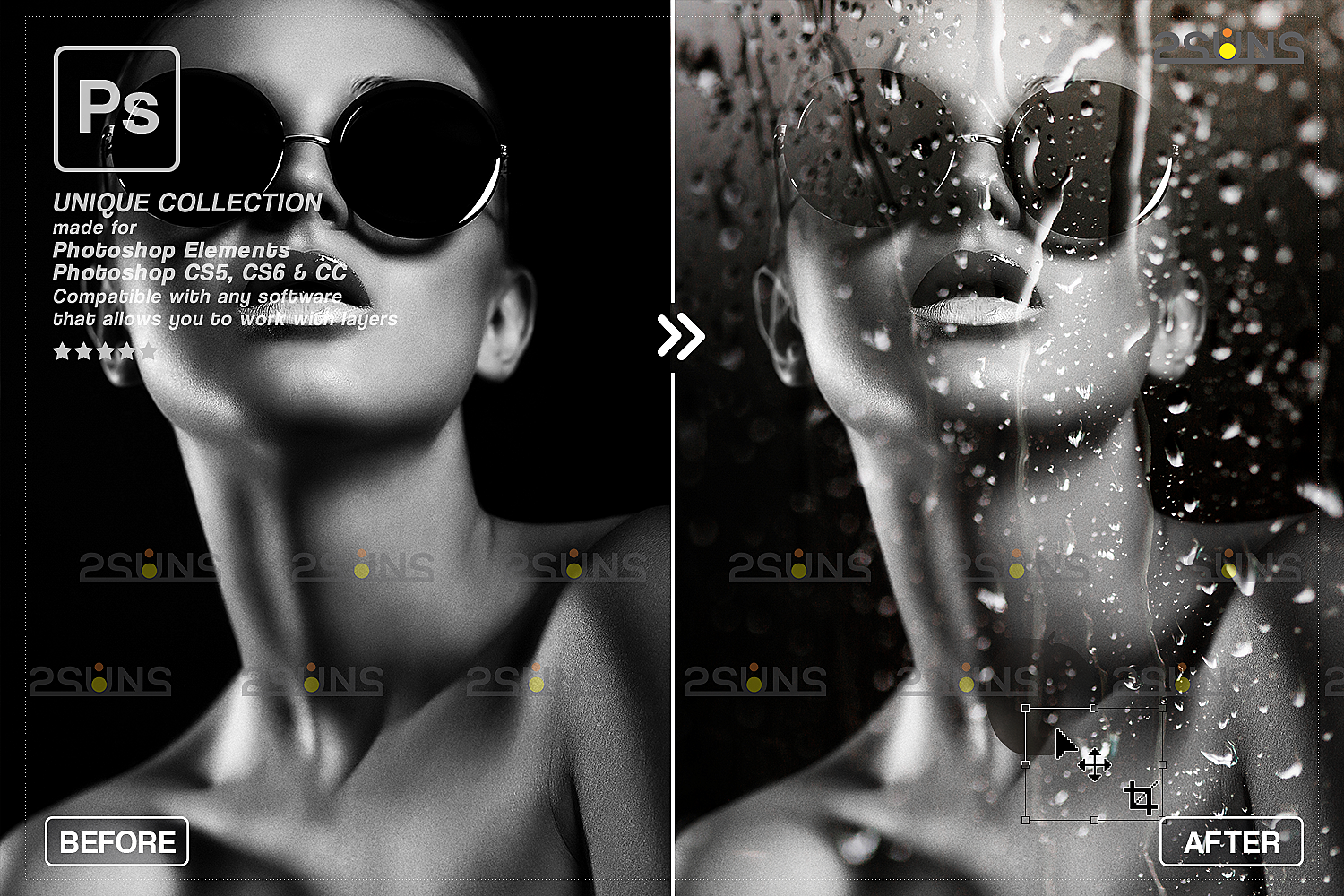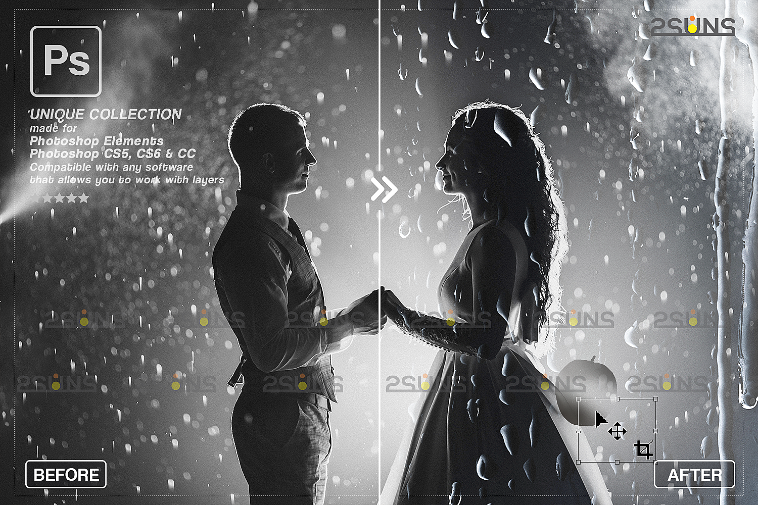 Create bright and creative artworks, add rain effect to your photos. This set contains 29 superb overlays that give you the perfect and creative design.