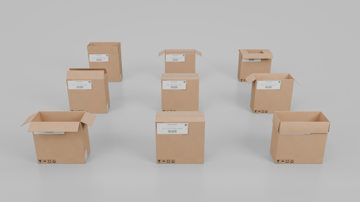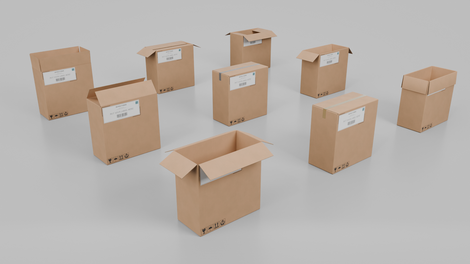 - Realistic Design: It depicts the real-world cardboard box surface look, bumps, and imperfections with the box flutes visible in the sidings of the box.