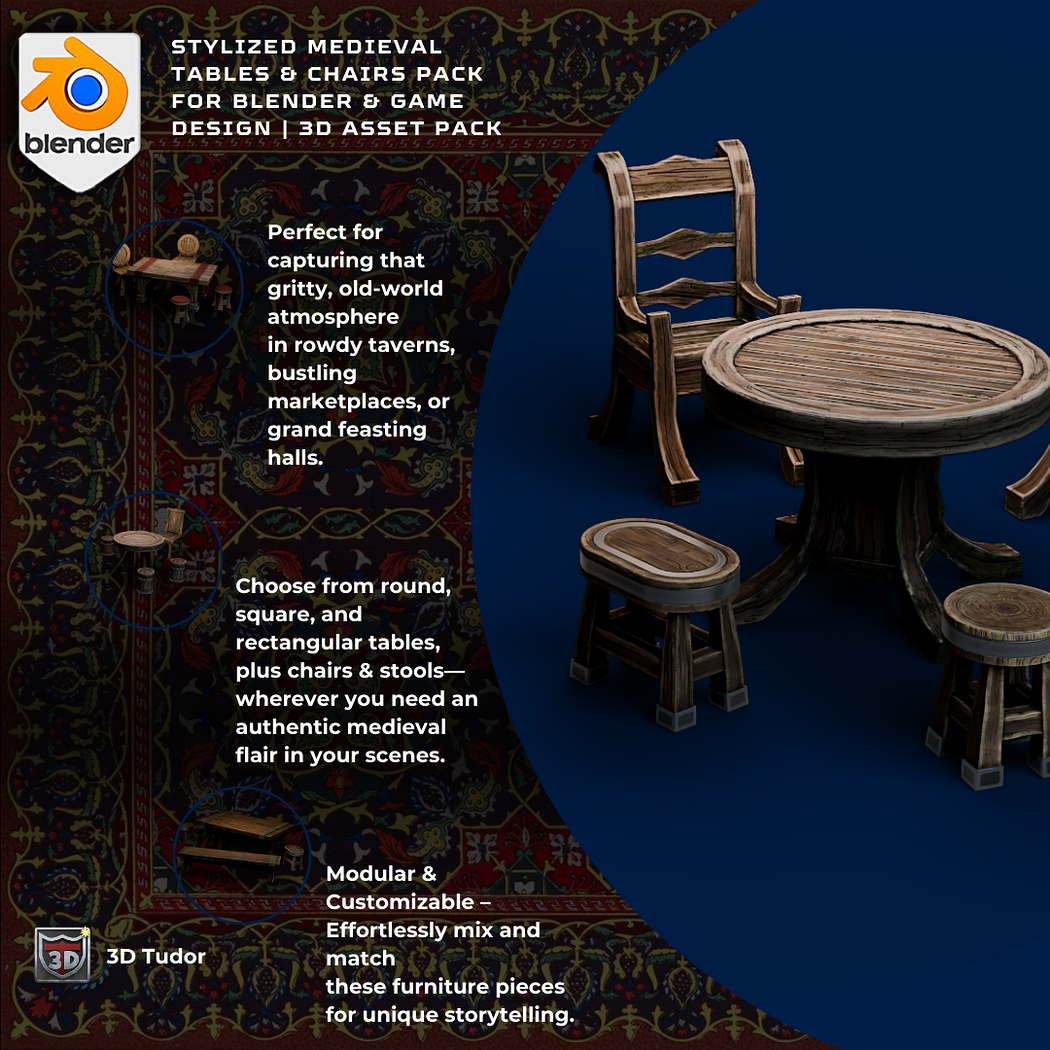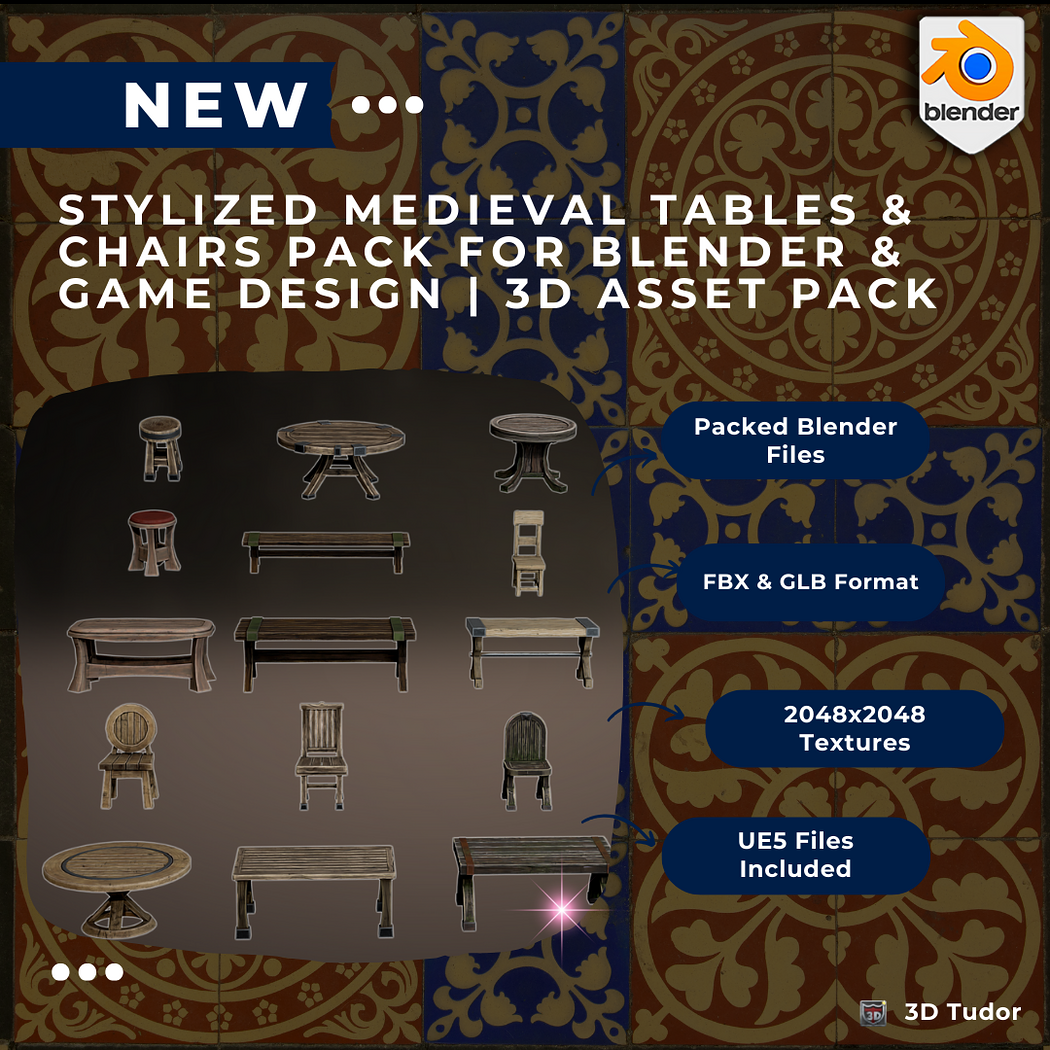 Bring warmth and authenticity to your medieval interiors with the 3DT Stylized Medieval Tables & Chairs Pack โ a handcrafted asset set designed for taverns, castles, and fantasy villages. Created by Dale of Heglum3D, this modular furniture kit is part of the 3DTutor Starving Artists Campaign and includes rich PBR textures, cozy stool variations, and low-poly designs optimized for Blender, Unreal Engine, and Unity.