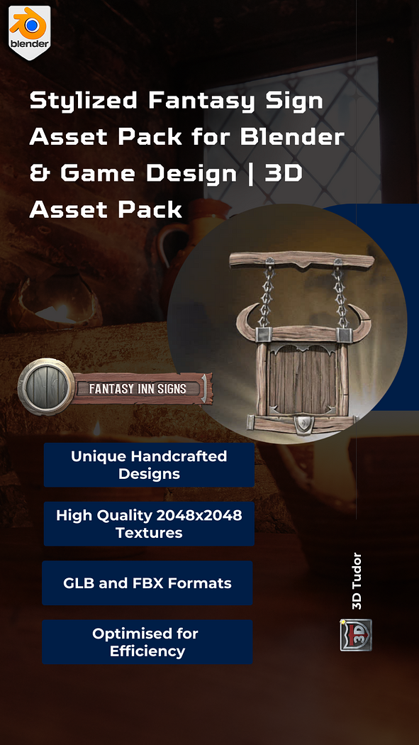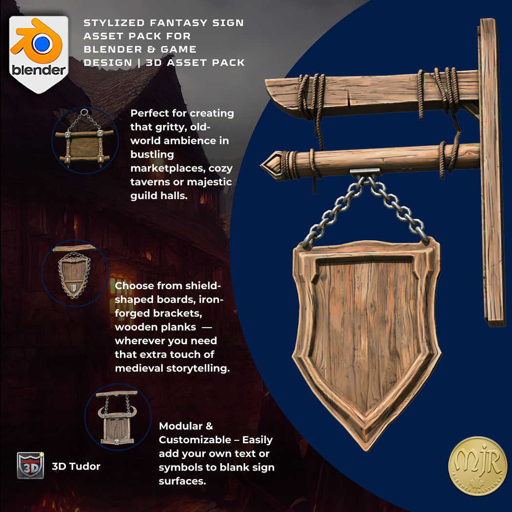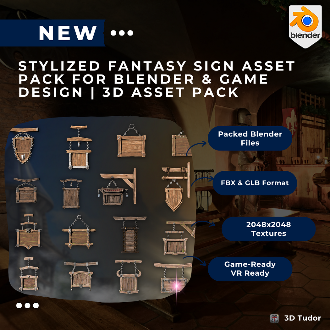 Add stylized flair to your medieval streets and fantasy inns with the 3DT Stylized Fantasy Sign Asset Pack โ a collection of 20 handcrafted hanging signs designed by Meshly and released through the 3DTutor Starving Artists Campaign. Each sign is game-ready, fully customizable, and supported across Blender, Unity, Unreal Engine, and Godot.