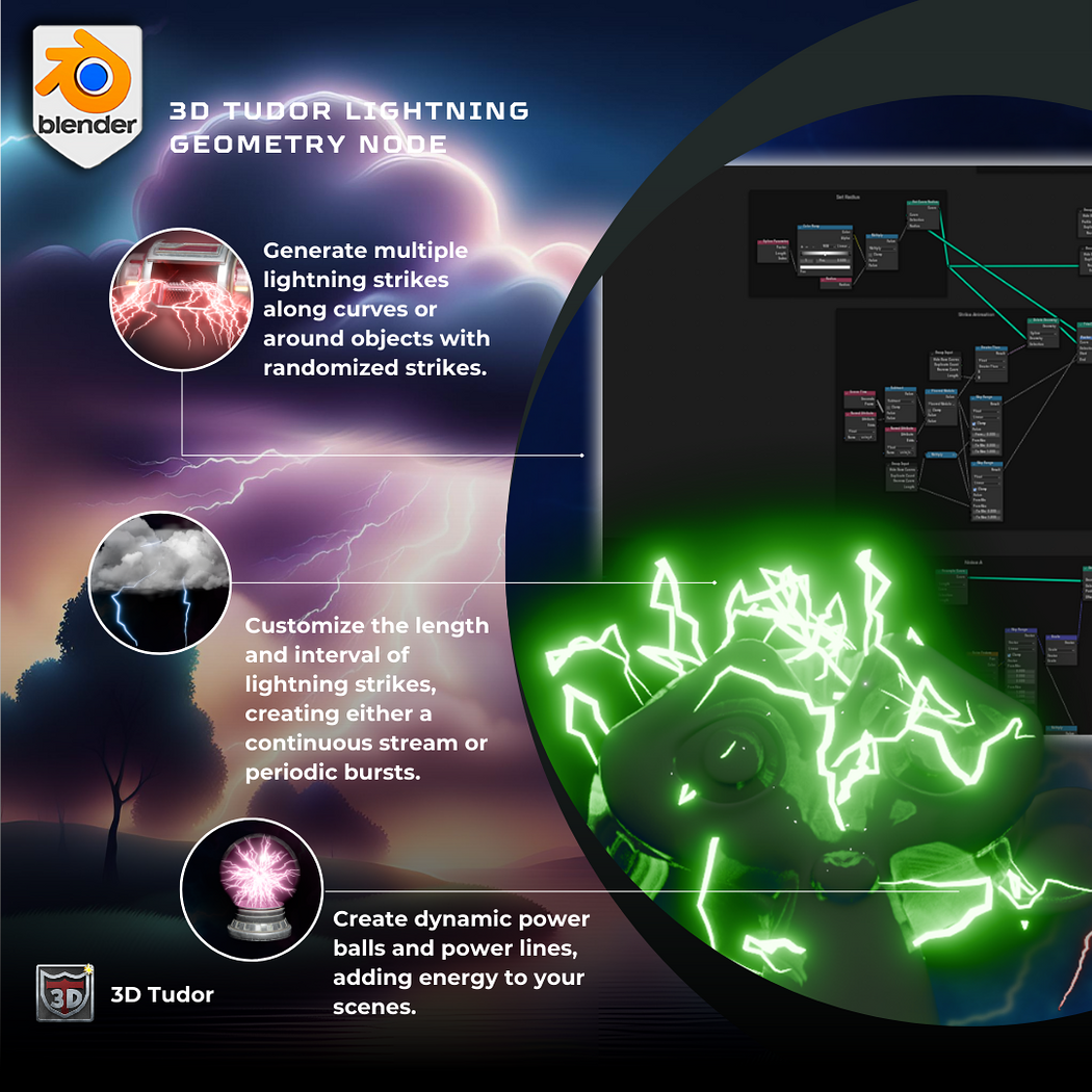 Designed for Blender 4.0+, this lightweight, procedural geometry node setup enables you to generate, control, and animate realistic or stylized lightning across curves, surfaces, objects, and dynamic scenes — optimized for both Eevee and Cycles.