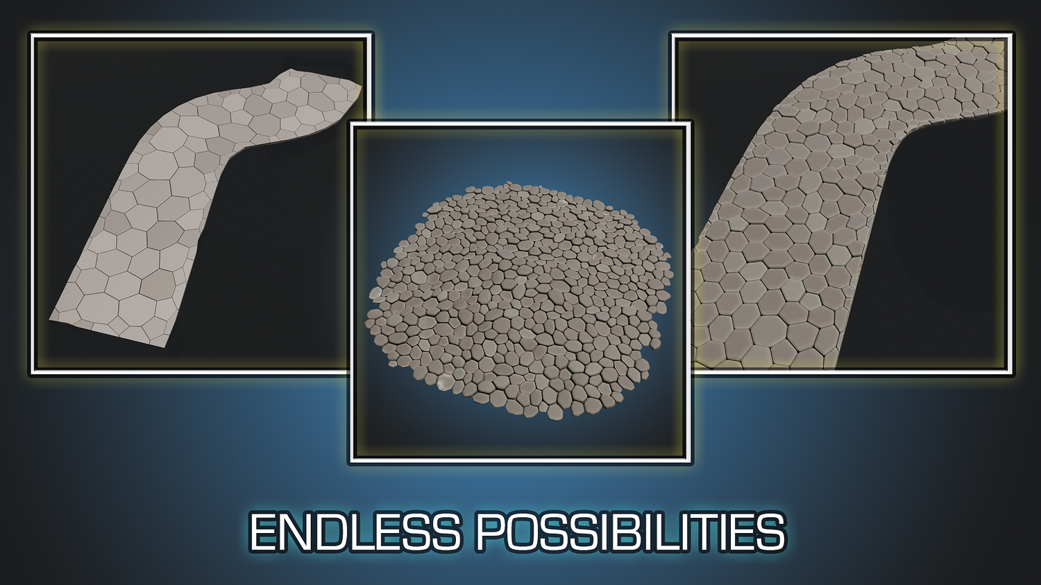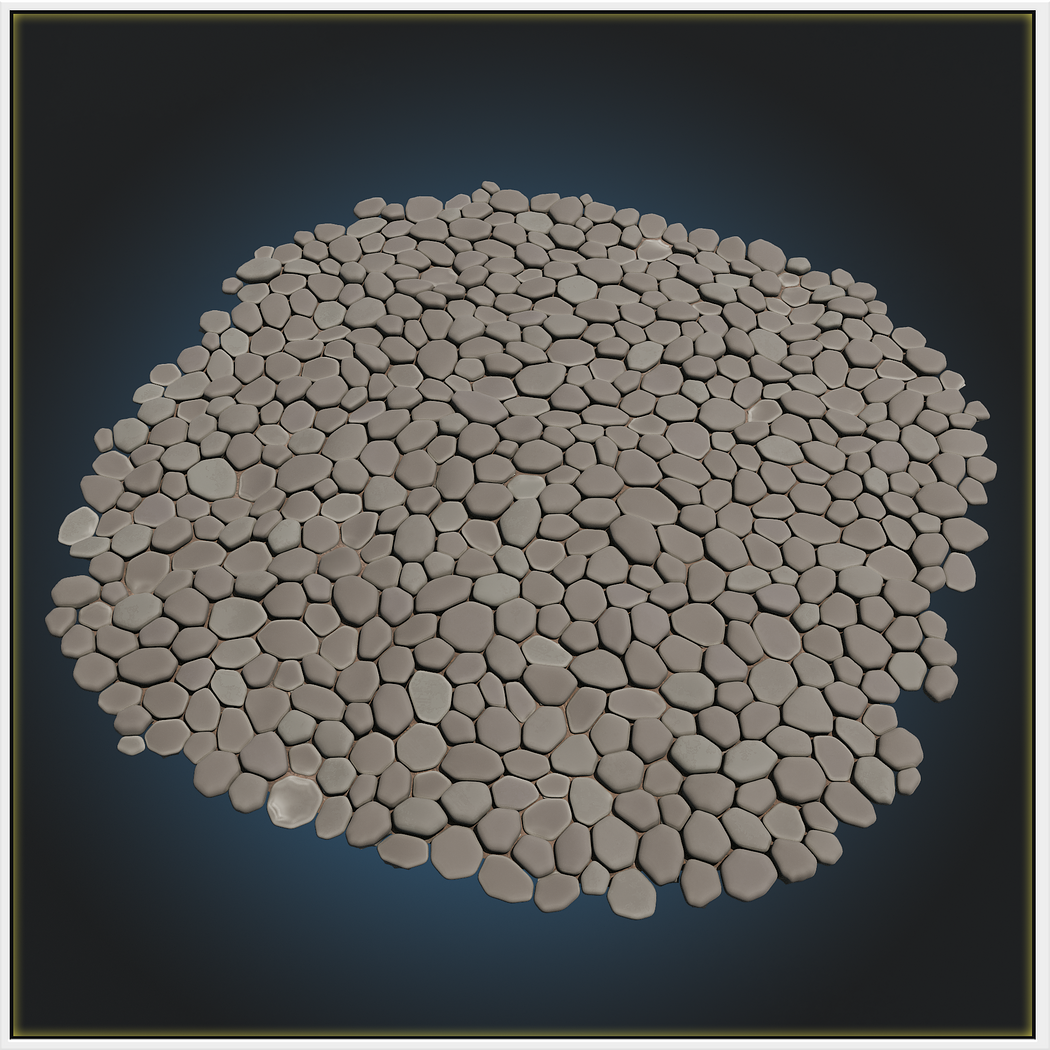 Control cobble size, scale, roundness, thickness, and randomize geometry for highly natural patterns.