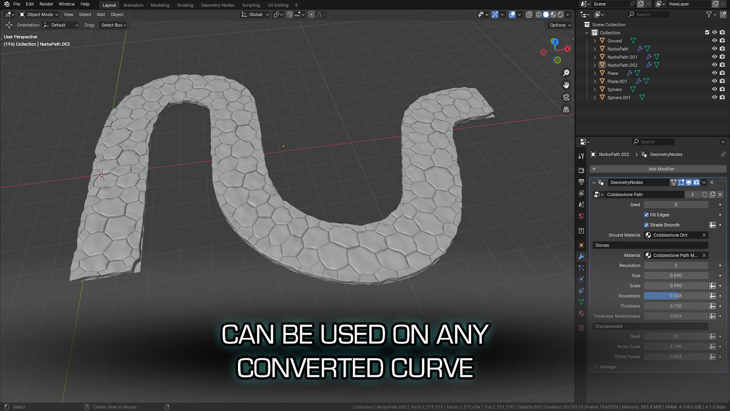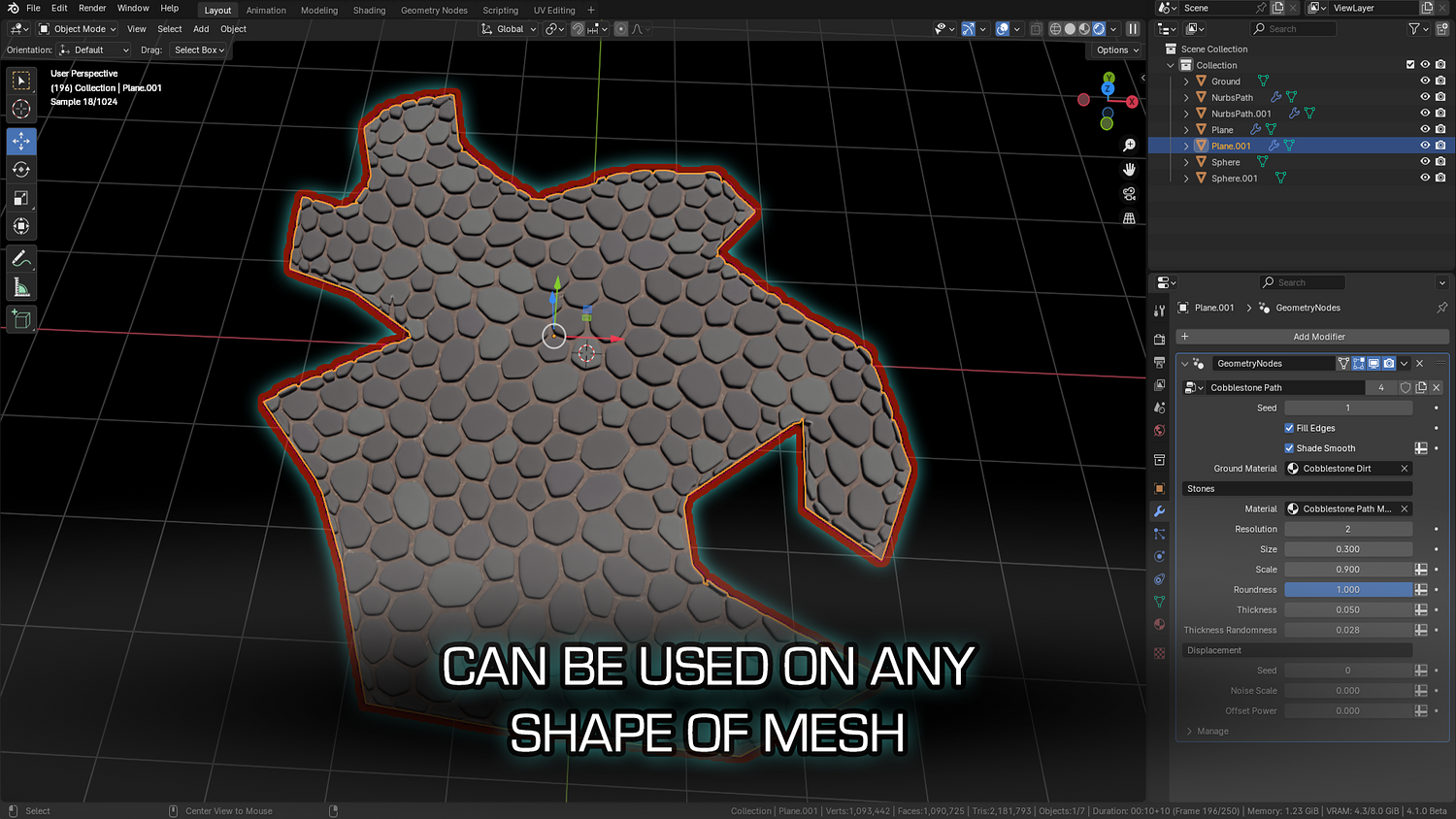 Simply apply the geometry node modifier to any object and select the cobblestone preset — instant results.