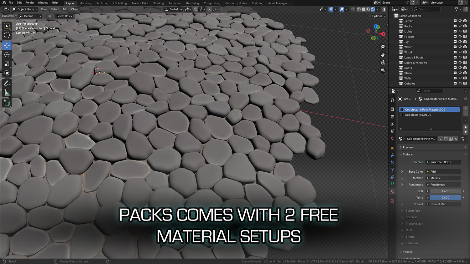 Built for Blender 4.0+, this intuitive geometry node setup lets you create dynamic stone walkways, courtyards, and roads with roundness, noise, edge detailing, and live material switching — no modeling needed.