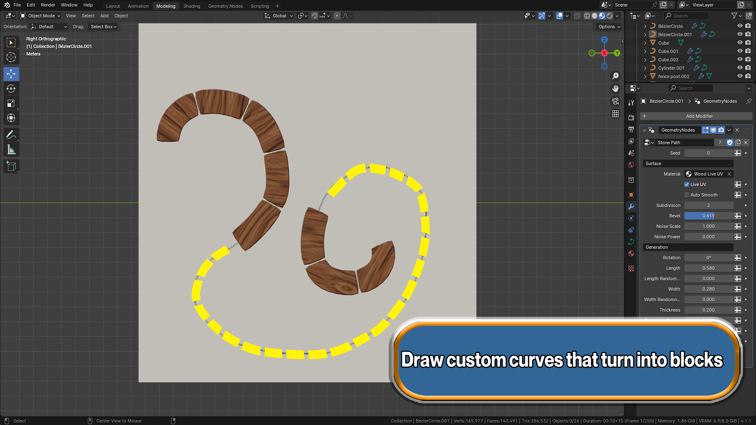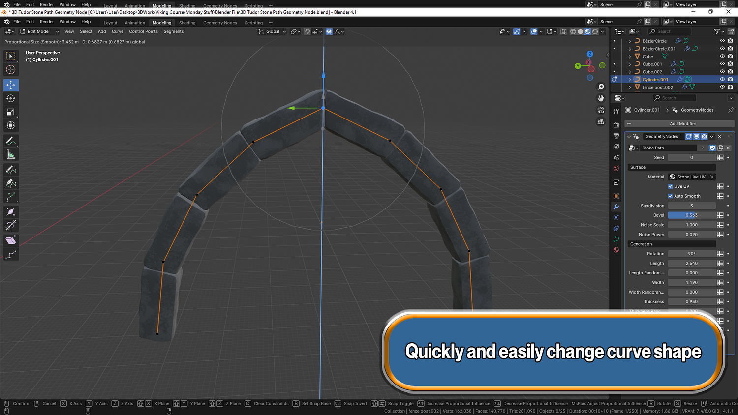Shape pathways, walls, and arches easily with curve controls — works on any Blender curve object.
