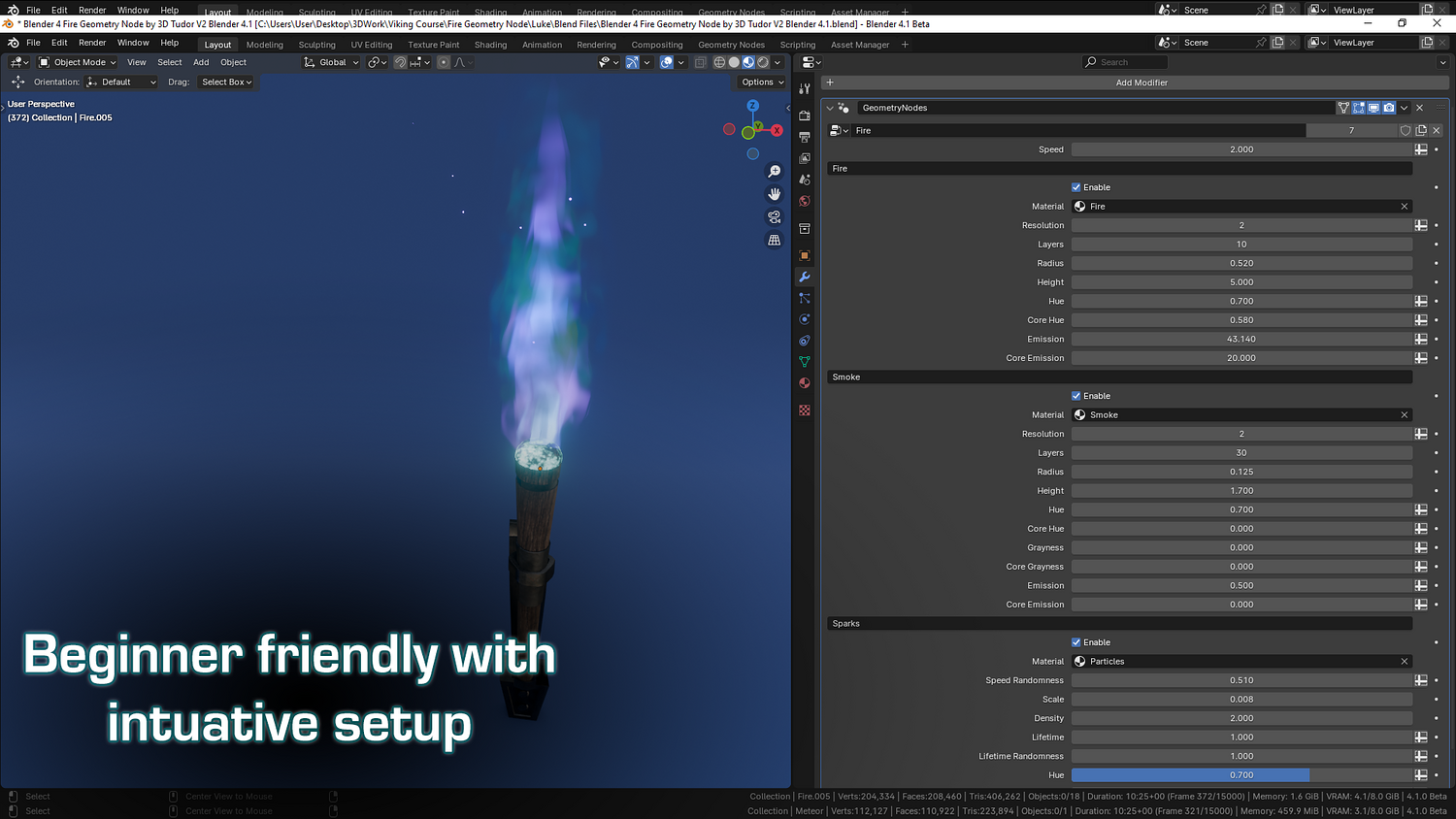 This versatile geometry node setup lets you drop fire onto any object with just one click. Add smoke trails, stylized flames, ember sparks, and fine-tune intensity, hue, speed, and more. Works flawlessly in Eevee and Cycles without slow simulations!