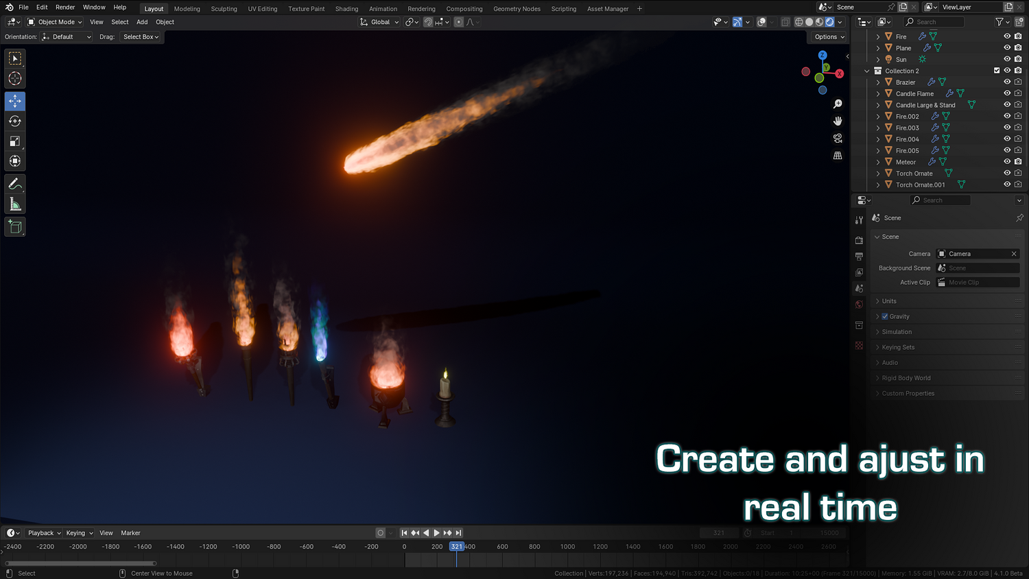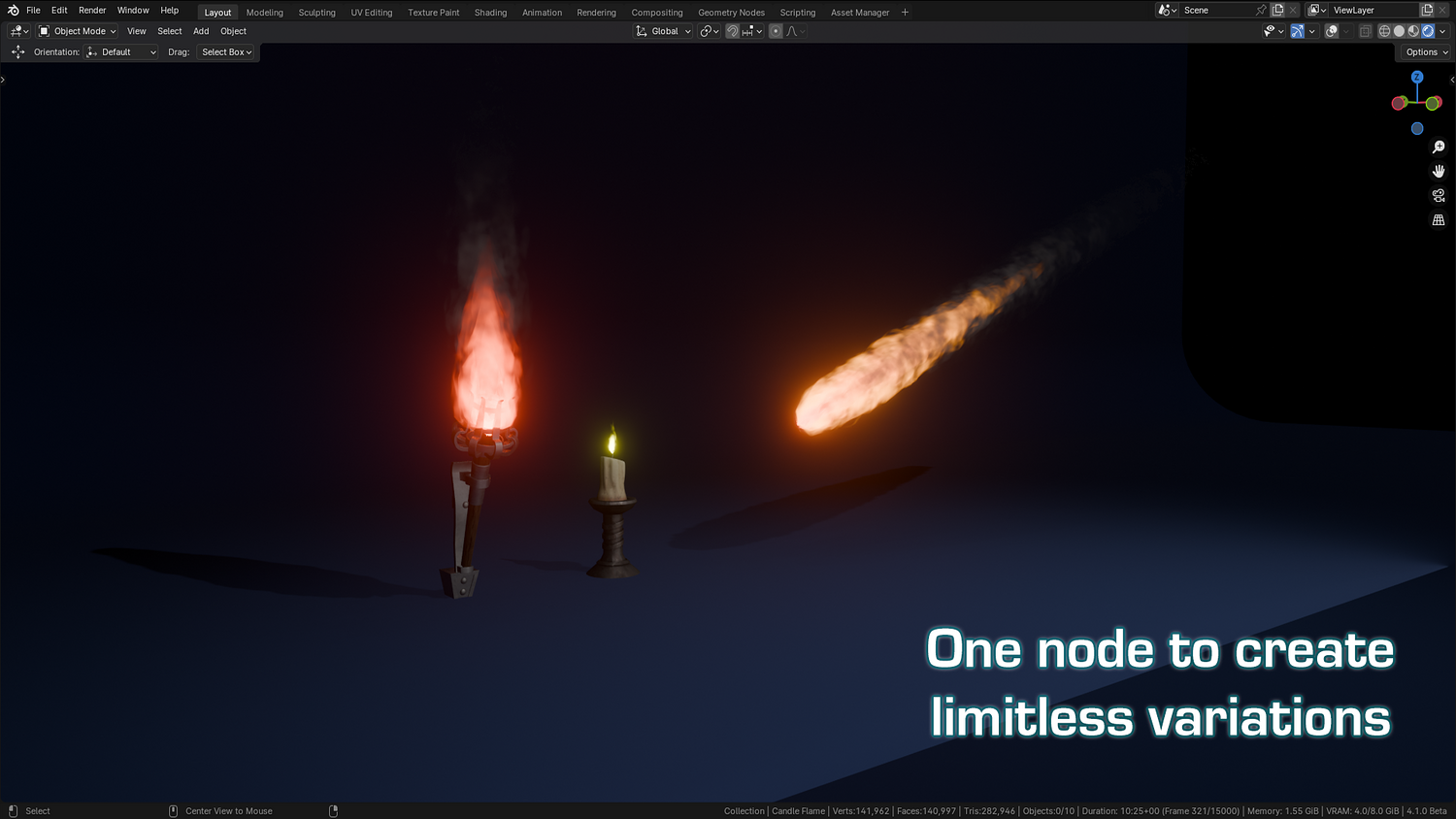 Switch between candle flames, magical braziers, campfires, or meteor trails in seconds using the node sliders.