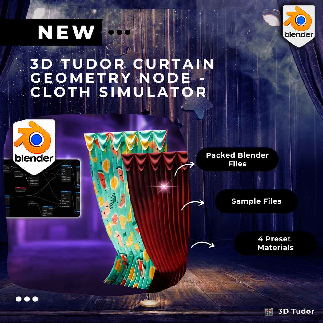 This geometry node system lets you build stylized or realistic cloth curtains in seconds — complete with folds, noise, snapping effects, and built-in animation support. Whether you're designing indoor scenes, flags, or theatrical environments, this tool delivers high control and fast results inside Blender 4.0+.