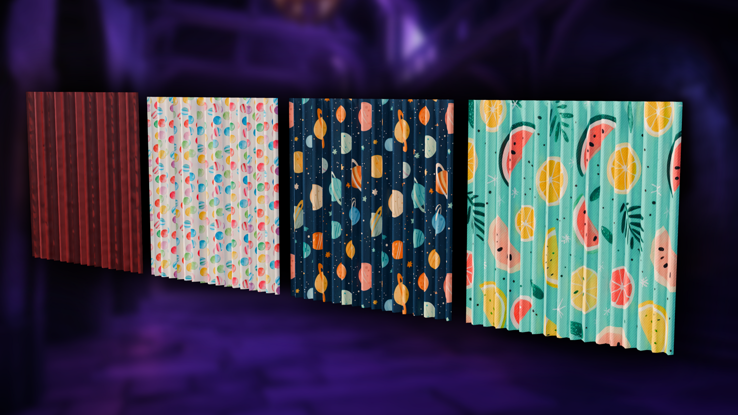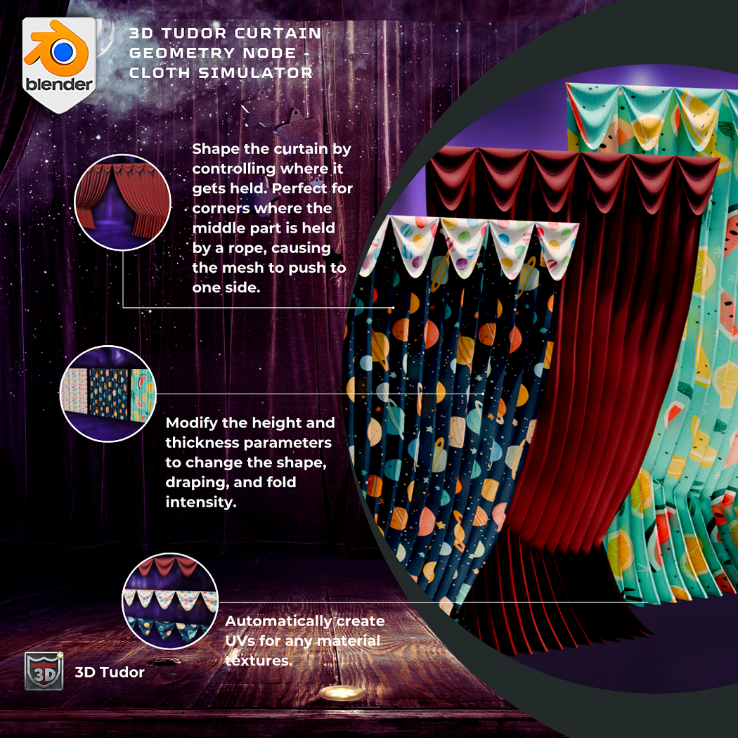 Includes presets for kids’ curtains, summer drapes, theater curtains, and even vertical banner/flag styles with curve following.
