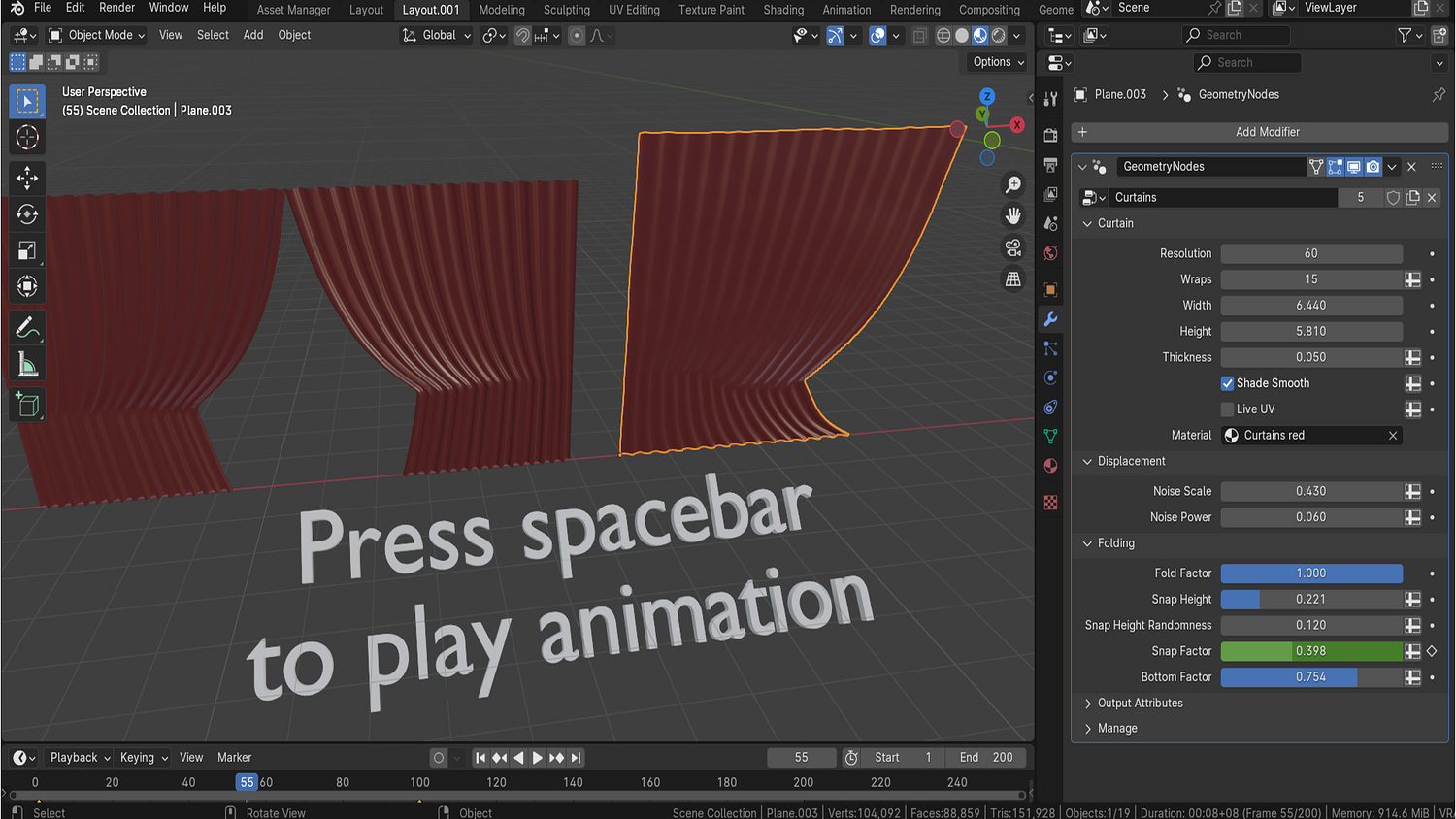 Animate curtain motion via a single geometry node parameter — no need for drivers or manual mesh edits.