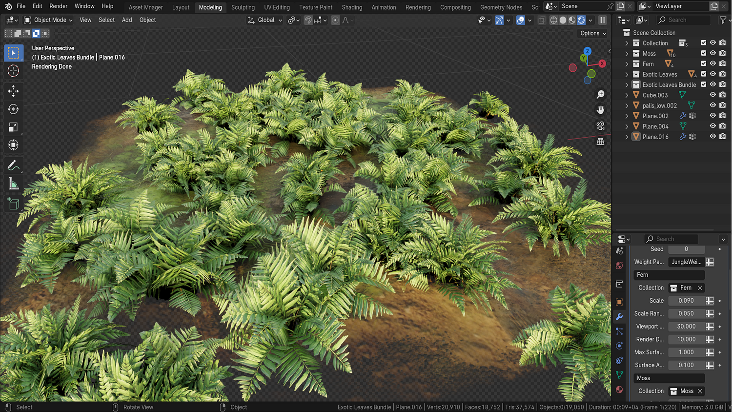 Fully optimized for Blender 4.0+, this powerful geometry node tool gives you full control over moss, ferns, stems, leaf bundles, and terrain materials — all using lightweight procedural workflows perfect for both animation and game-ready scenes.