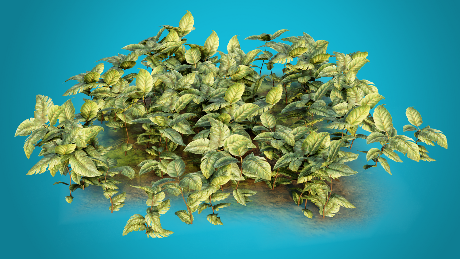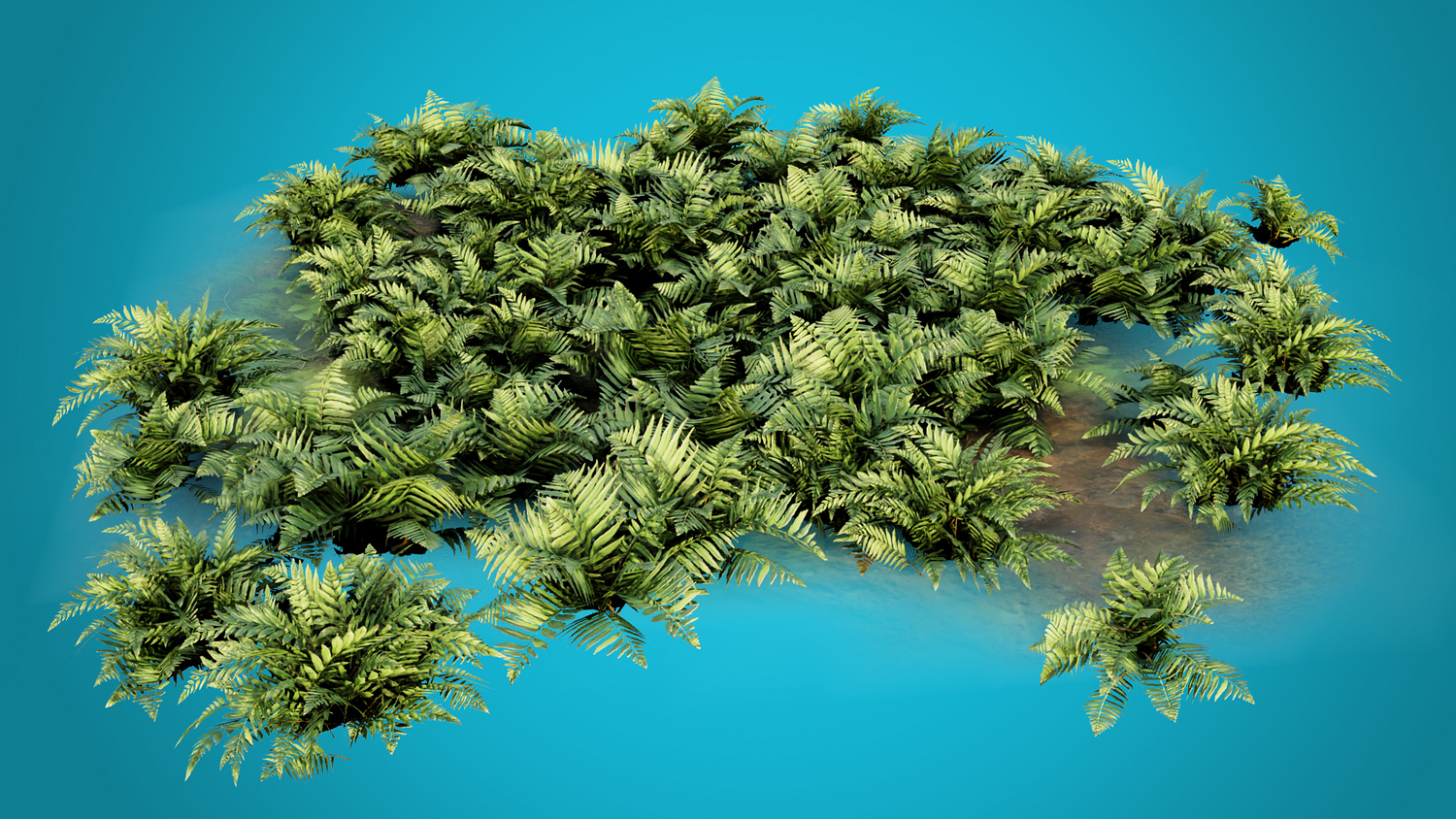 Place moss, ferns, stems, and leaves procedurally across any plane, sculpted terrain, or imported model using density weight painting.