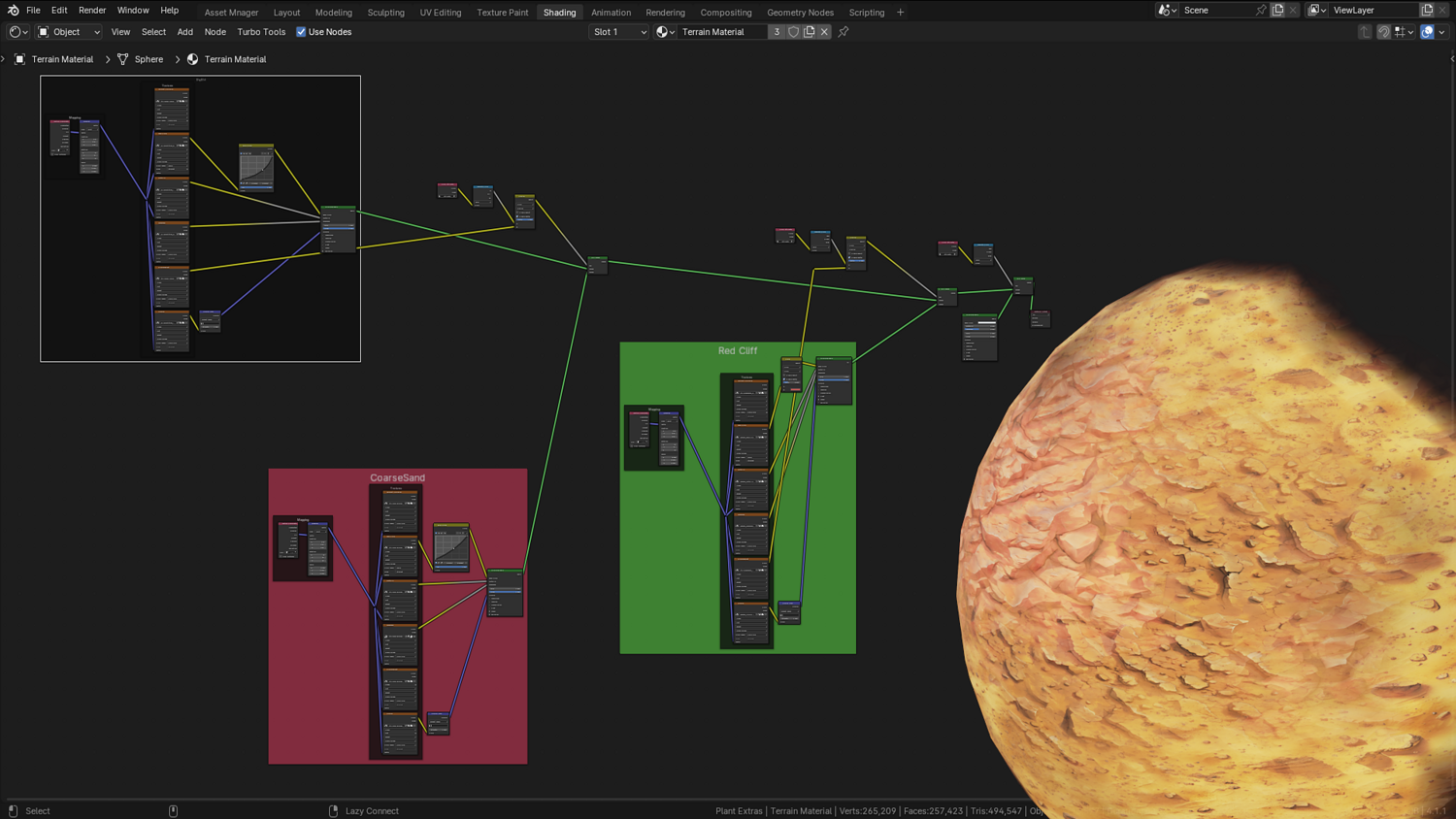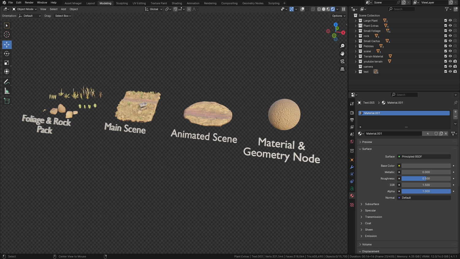 Craft procedurally populated desert scenes with weight-painted foliage, rock scatter, sculpted terrain, and stylized material blending — all optimized for real-time performance in Blender 4.0+ with no plugins required.