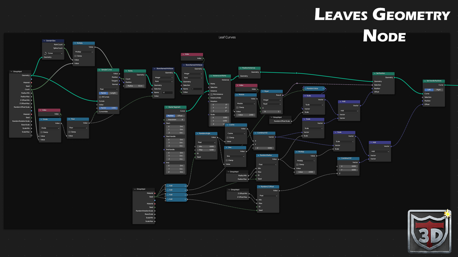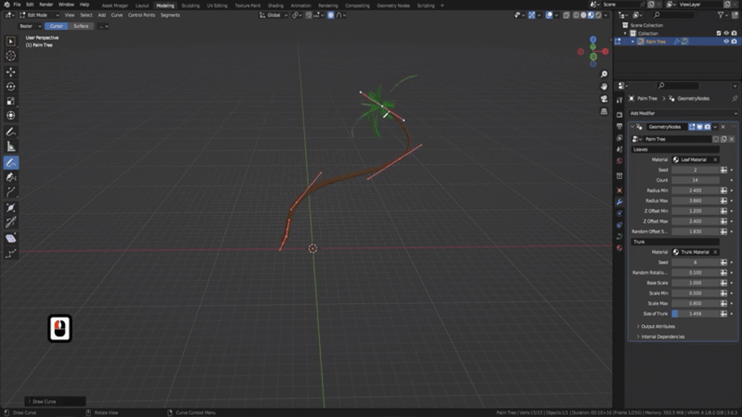Simply sketch your tree with the Draw tool or use imported curves, then control everything from leaf count and radius to trunk thickness, base width, materials, and seed variation — all with procedural sliders and collection support.