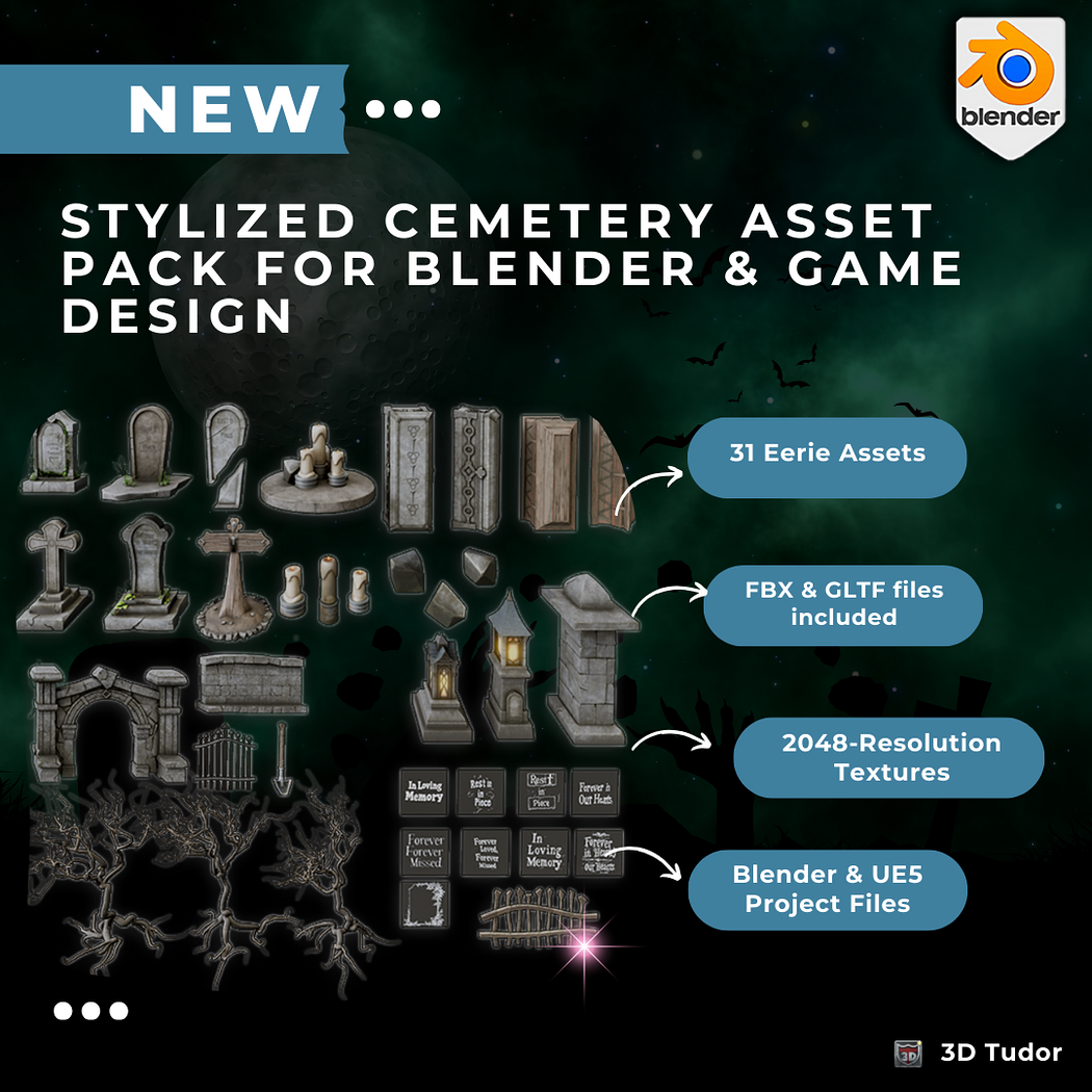 Create hauntingly beautiful graveyard scenes with the 3DT Stylized Cemetery Asset Pack โ a modular set of gravestones, crypts, trees, candles, fences, and more. Designed by Oguzan and published through the 3DTutor Starving Artists Campaign, this pack helps bring eerie, stylized cemeteries to life with drag-and-drop simplicity across Blender, Unreal Engine, Unity, and Godot.