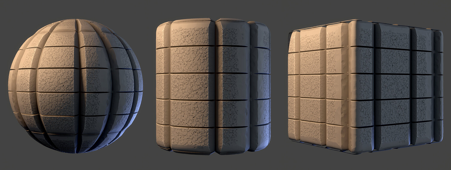Material previews rendered in Marmoset Toolbag, visual results may vary depending on render engine, tiling amount, lighting conditions, etc. sbsar file performance may differ based on your pc specs.