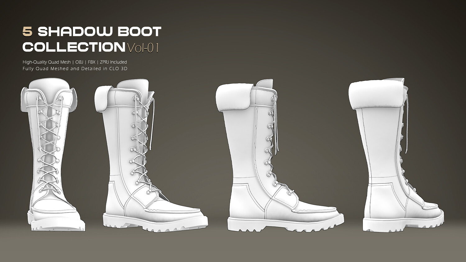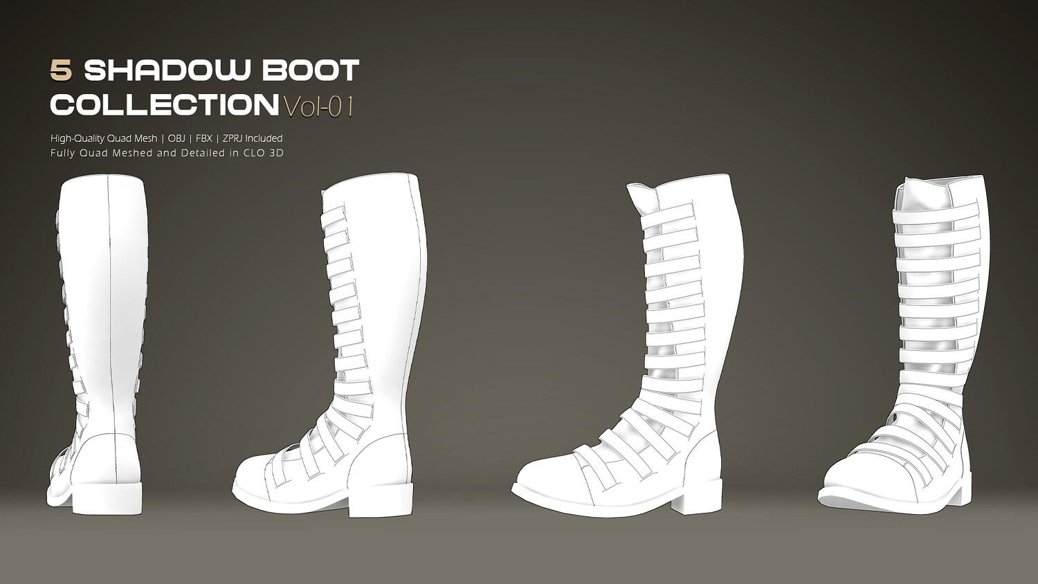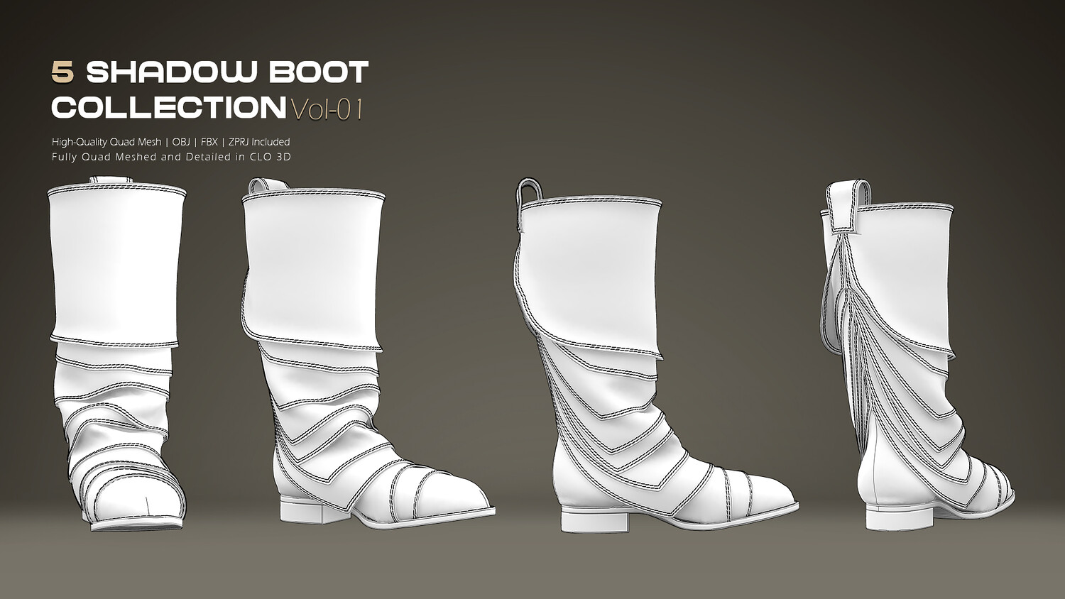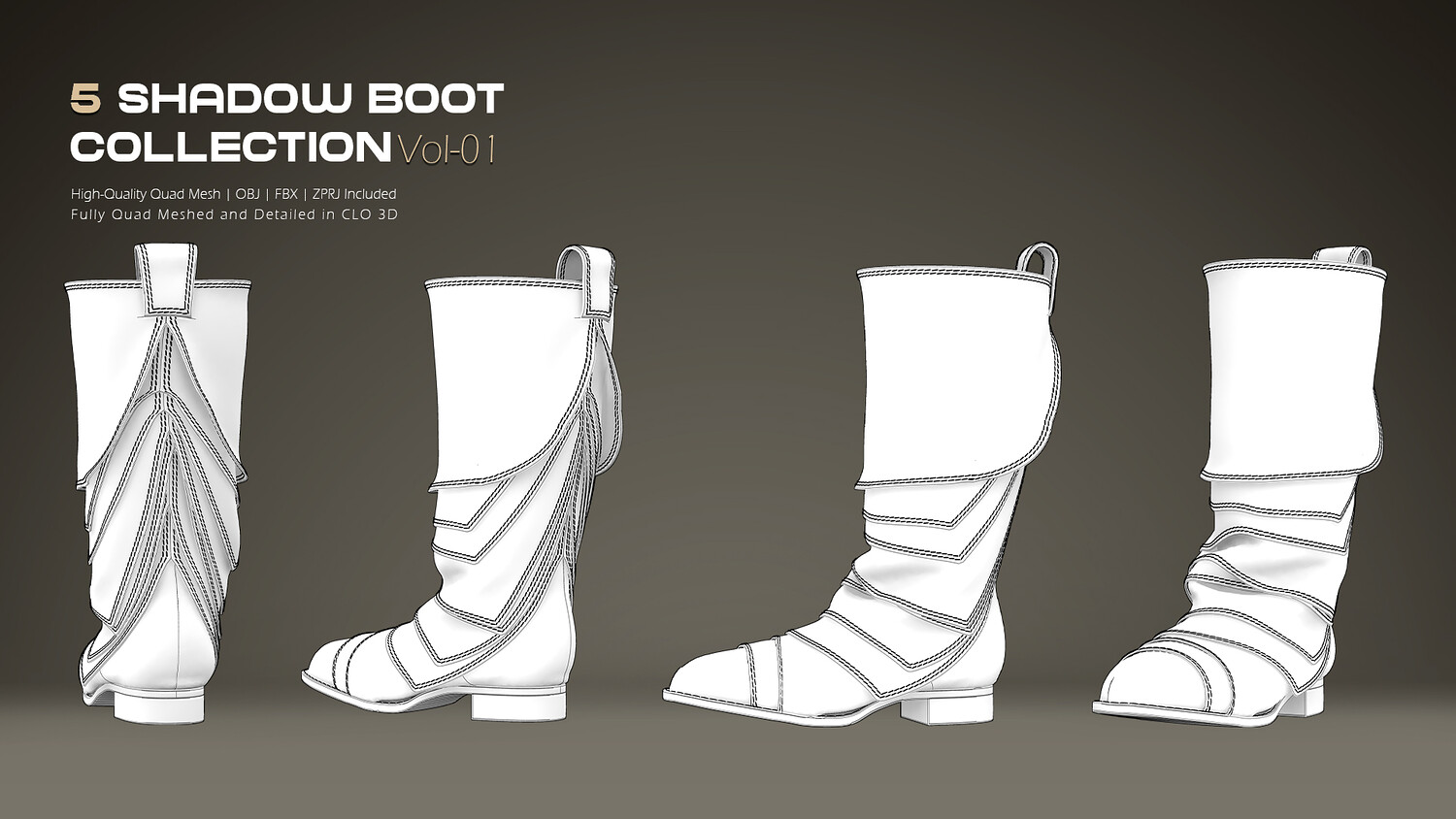5 Shadow Boot Collection Vol.01 Step into the shadows with this exclusive collection of 5 high-fashion, fully detailed boots — designed and quad-meshed in CLO 3D. Perfect for character artists, stylists, and 3D creators looking to elevate their wardrobe assets.
