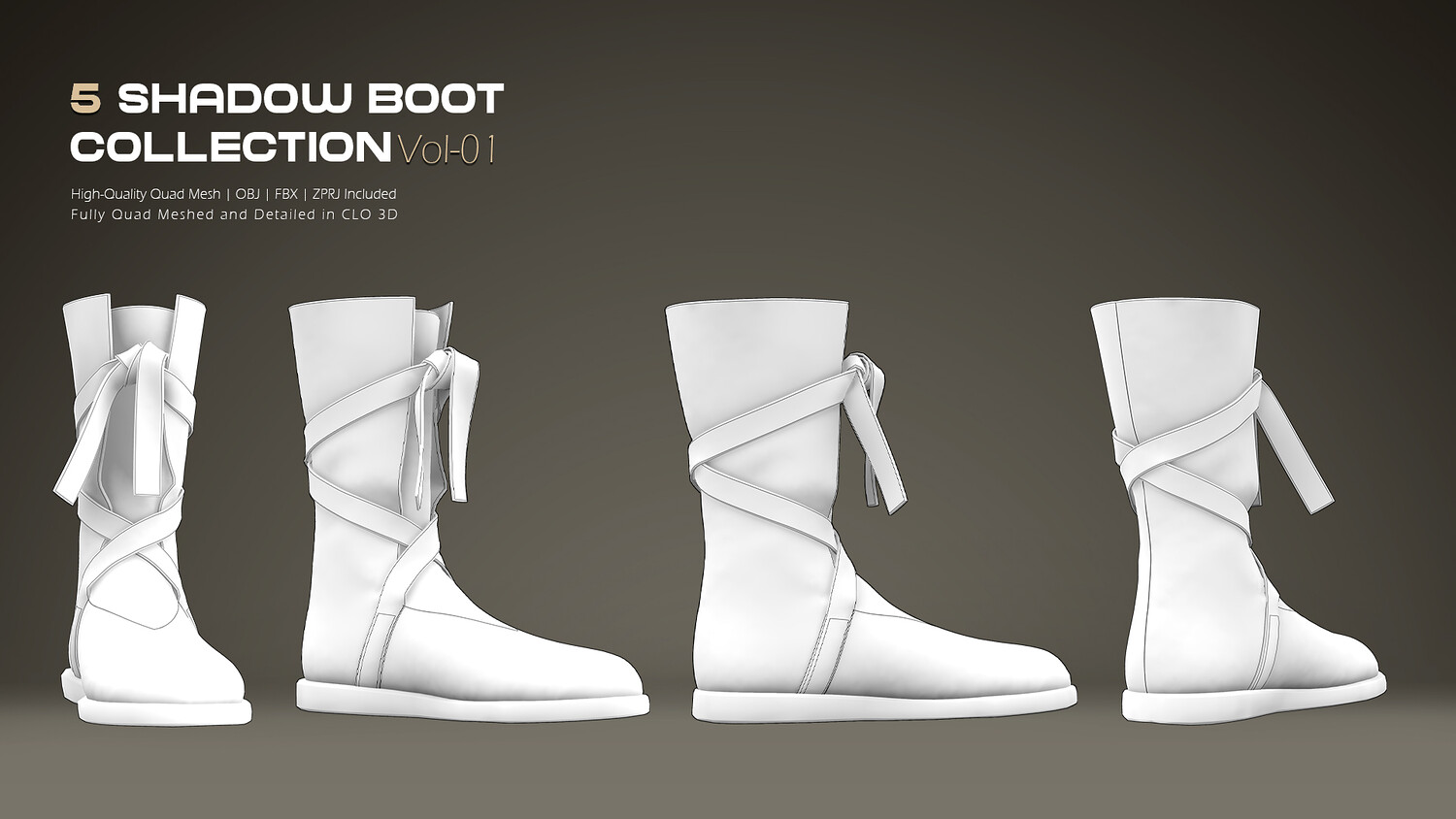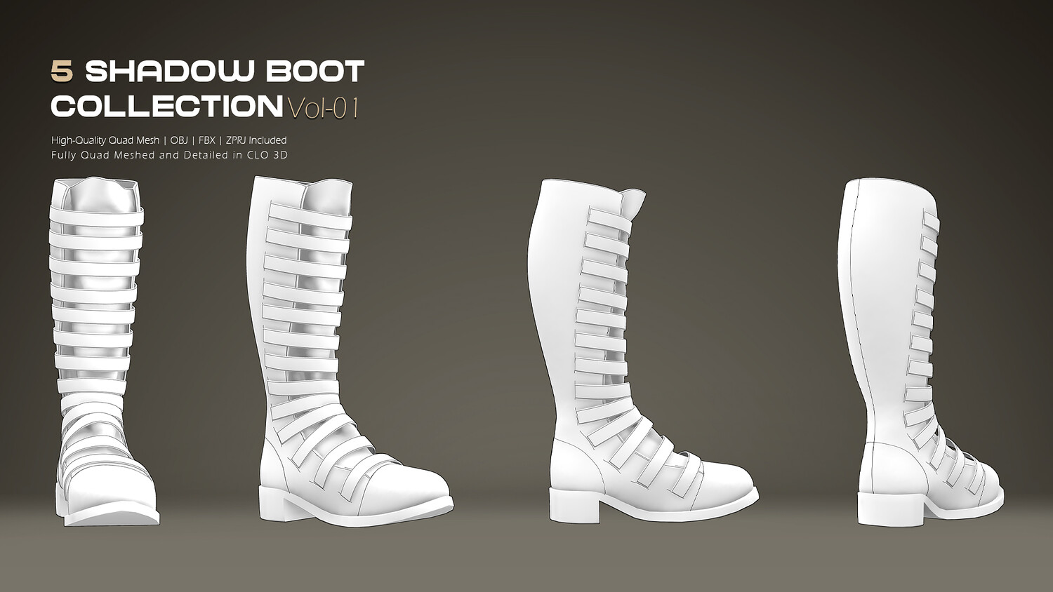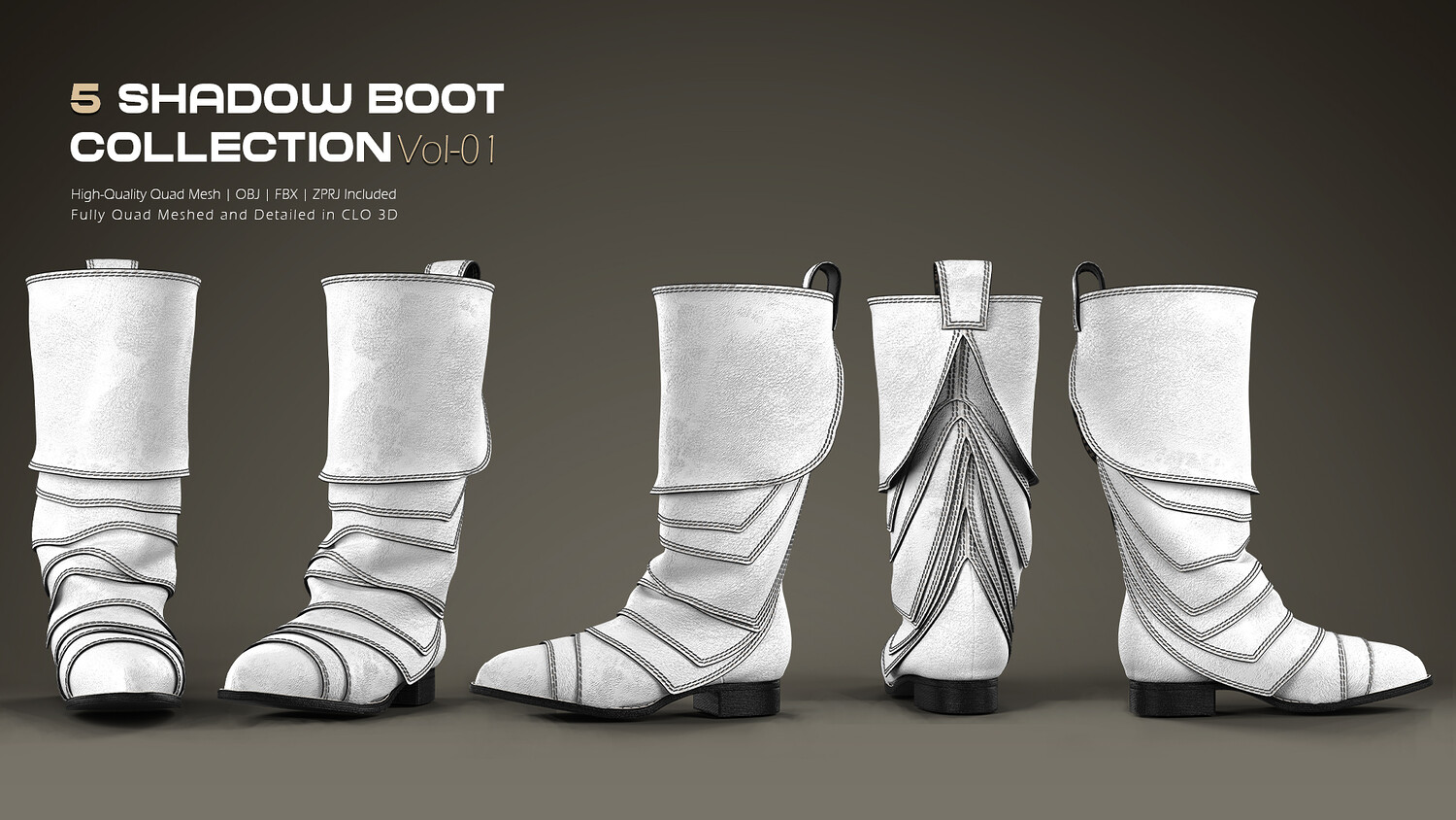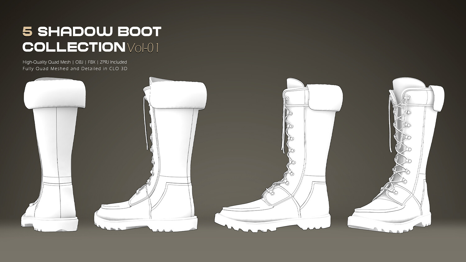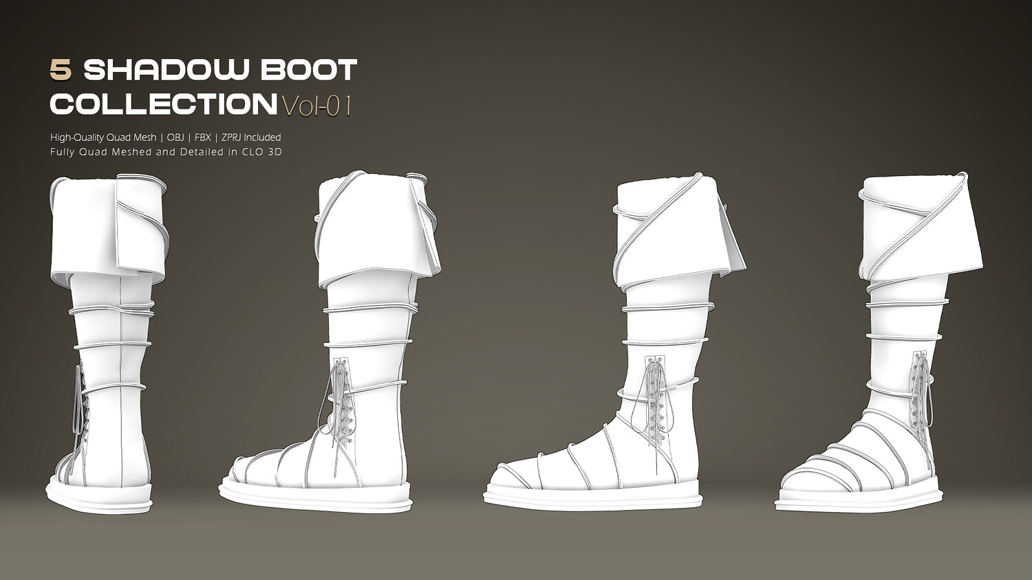 5 Shadow Boot Collection Vol.01 Step into the shadows with this exclusive collection of 5 high-fashion, fully detailed boots — designed and quad-meshed in CLO 3D. Perfect for character artists, stylists, and 3D creators looking to elevate their wardrobe assets.