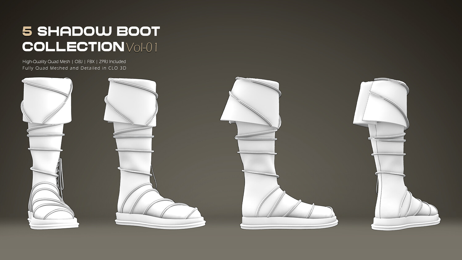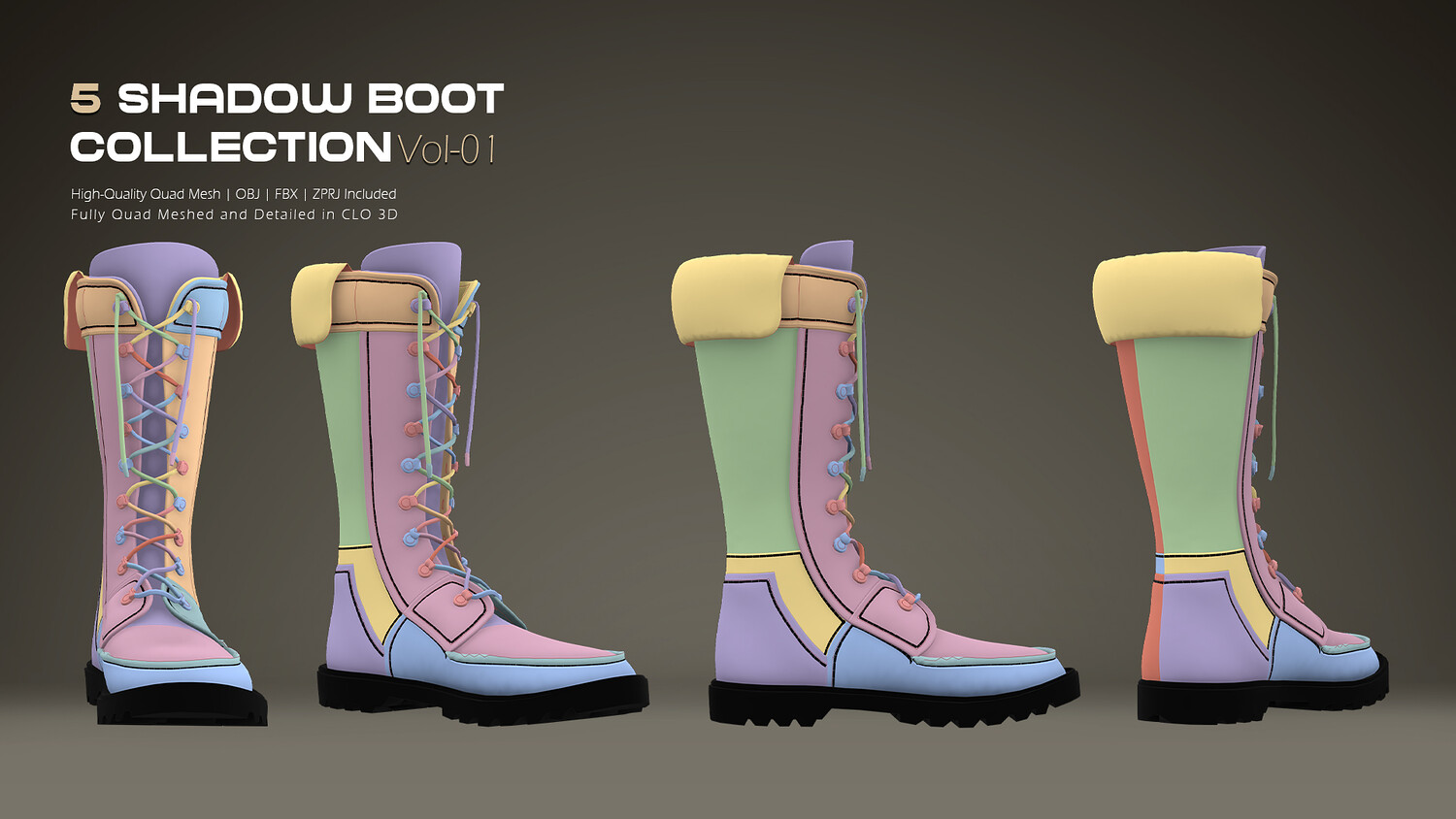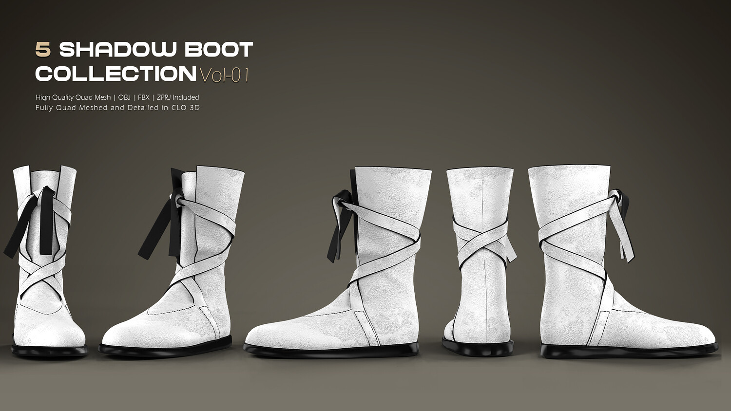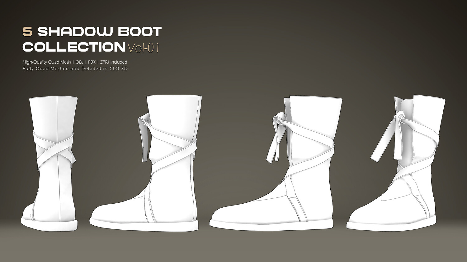 5 Shadow Boot Collection Vol.01 Step into the shadows with this exclusive collection of 5 high-fashion, fully detailed boots — designed and quad-meshed in CLO 3D. Perfect for character artists, stylists, and 3D creators looking to elevate their wardrobe assets.