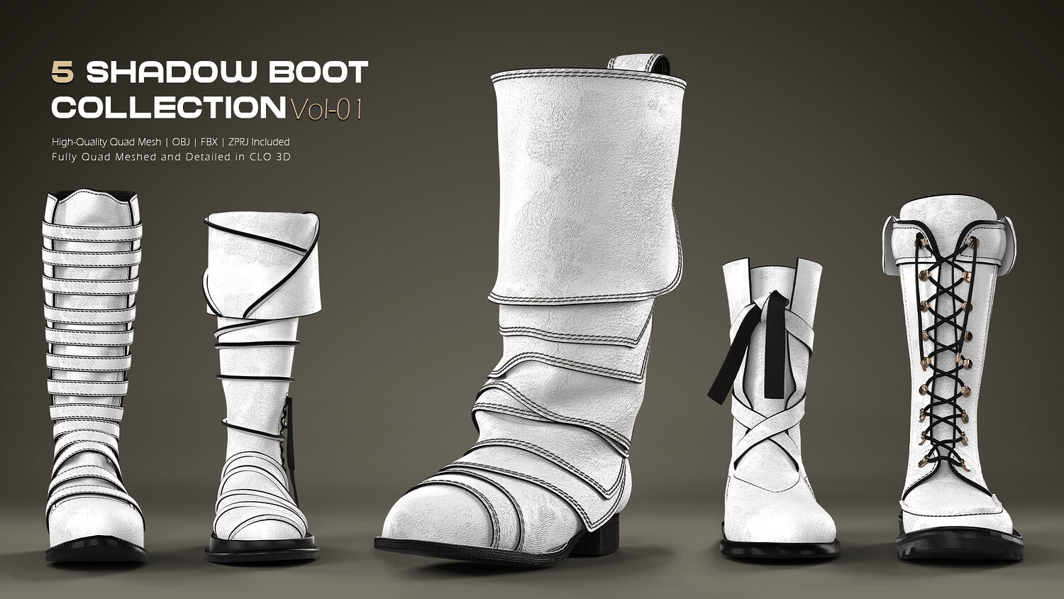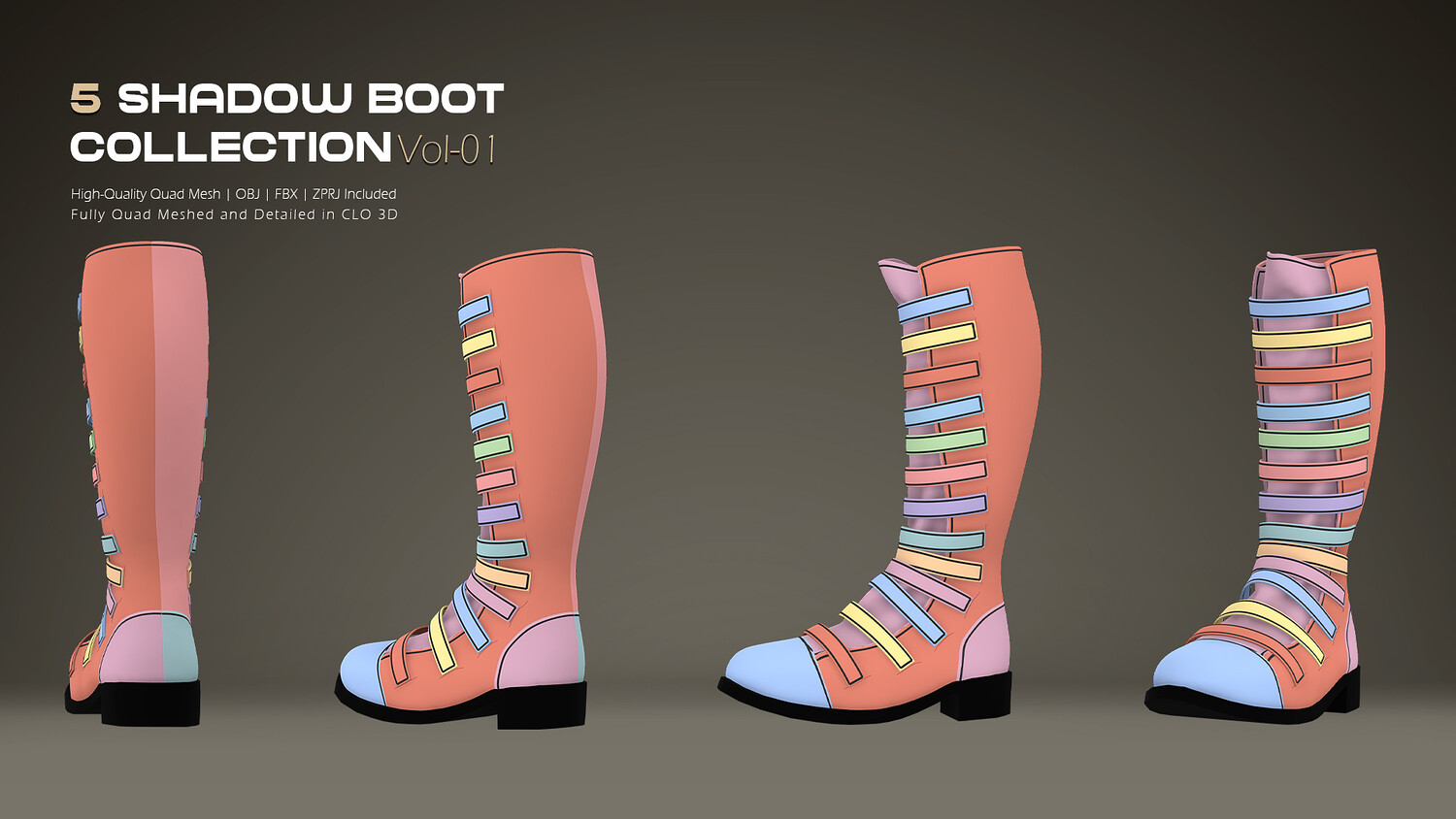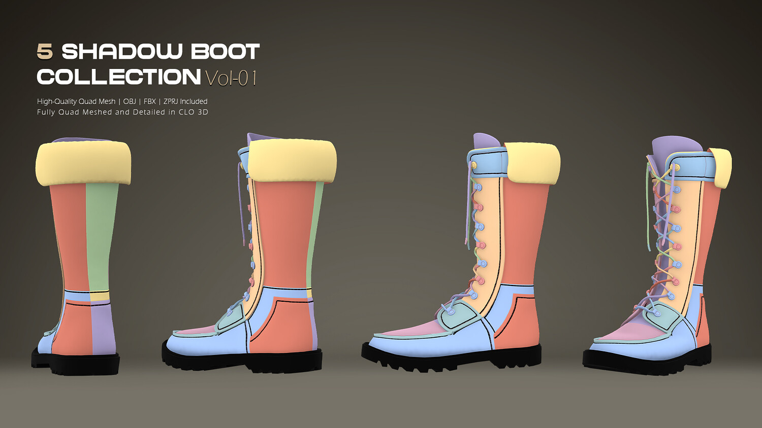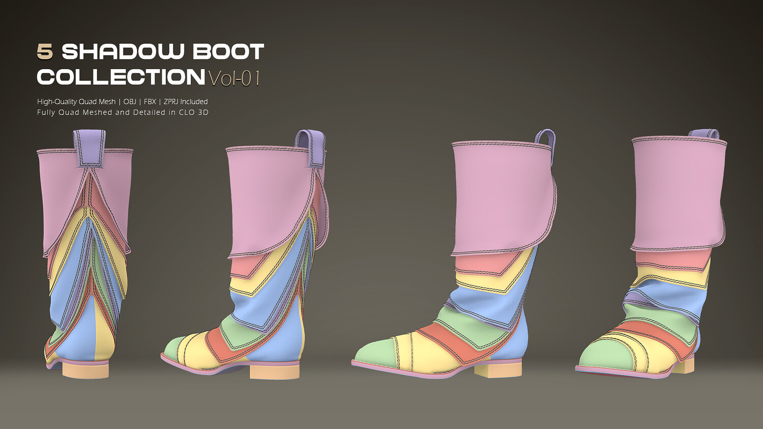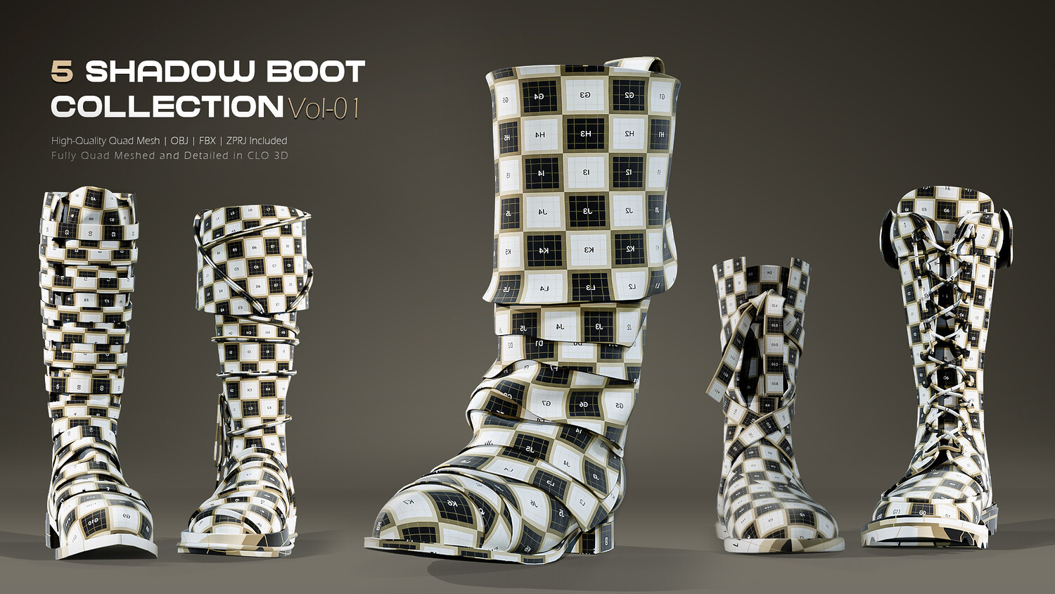 5 Shadow Boot Collection Vol.01 Step into the shadows with this exclusive collection of 5 high-fashion, fully detailed boots — designed and quad-meshed in CLO 3D. Perfect for character artists, stylists, and 3D creators looking to elevate their wardrobe assets.
