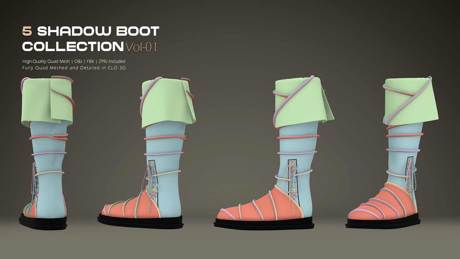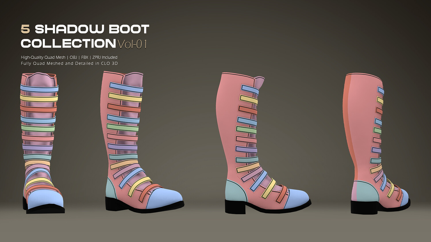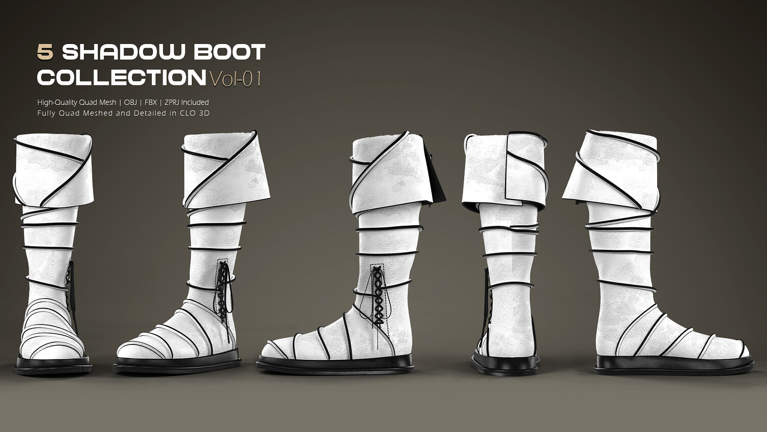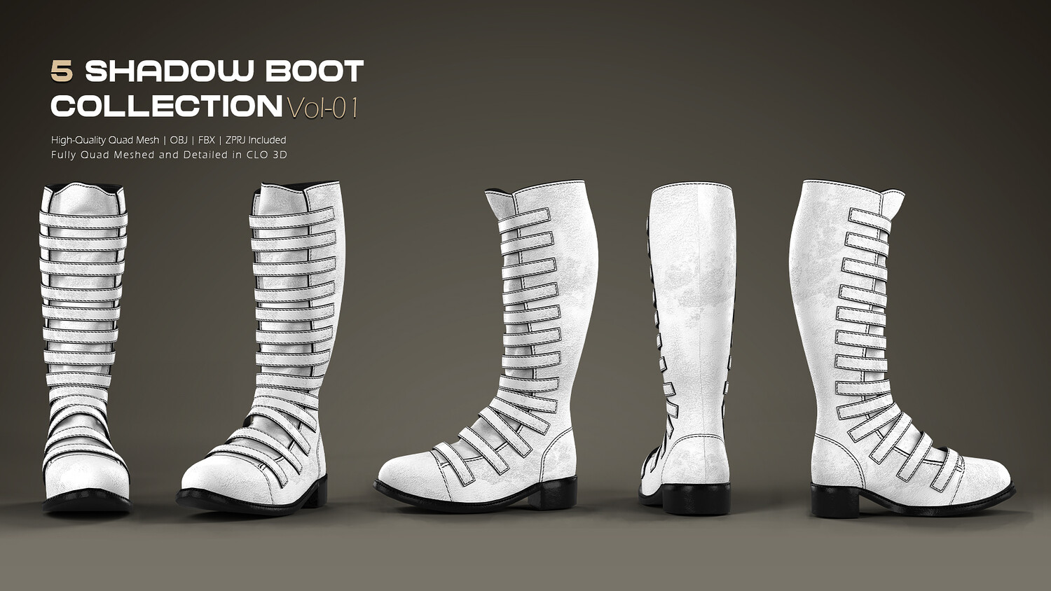 5 Shadow Boot Collection Vol.01 Step into the shadows with this exclusive collection of 5 high-fashion, fully detailed boots — designed and quad-meshed in CLO 3D. Perfect for character artists, stylists, and 3D creators looking to elevate their wardrobe assets.