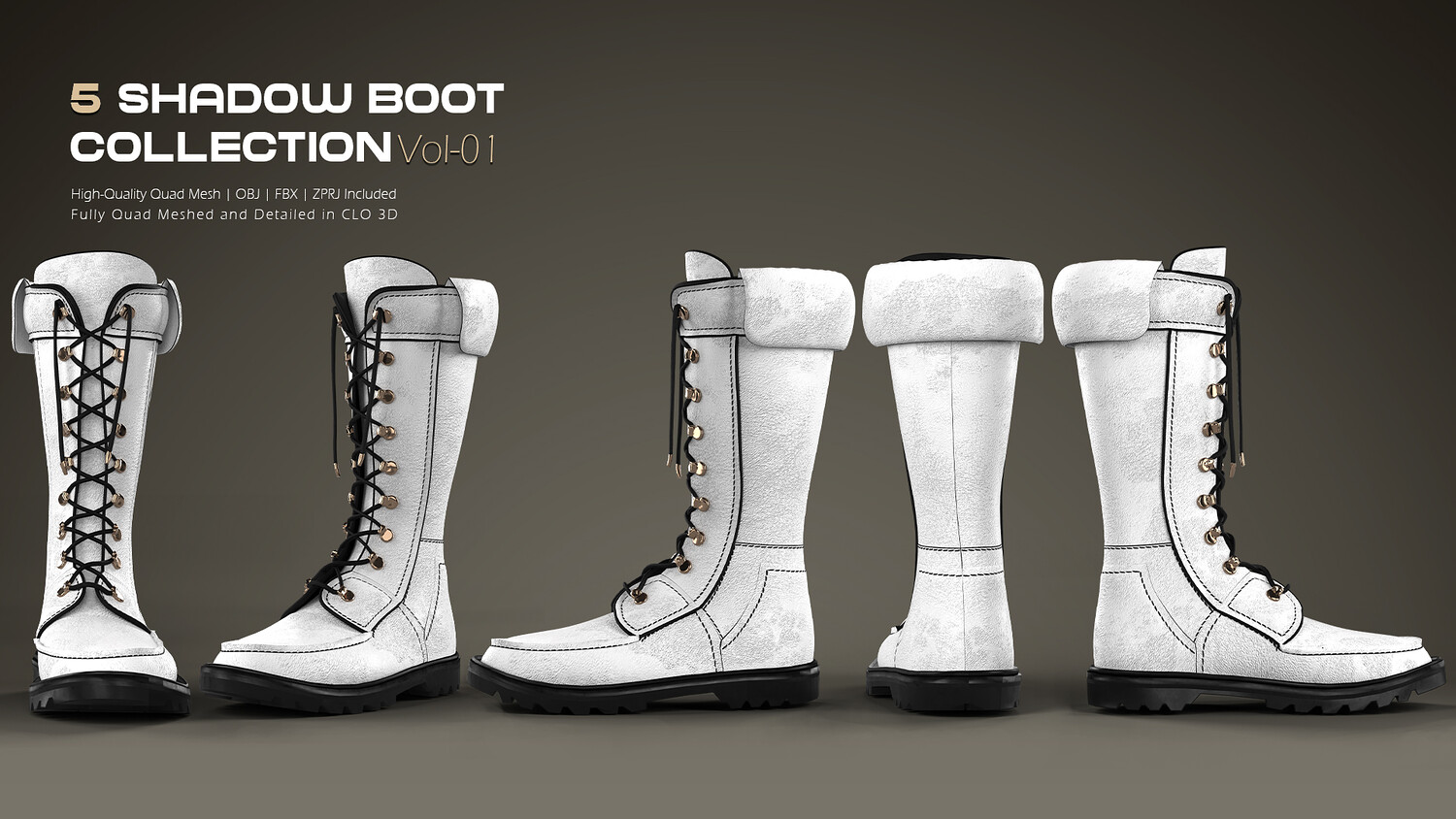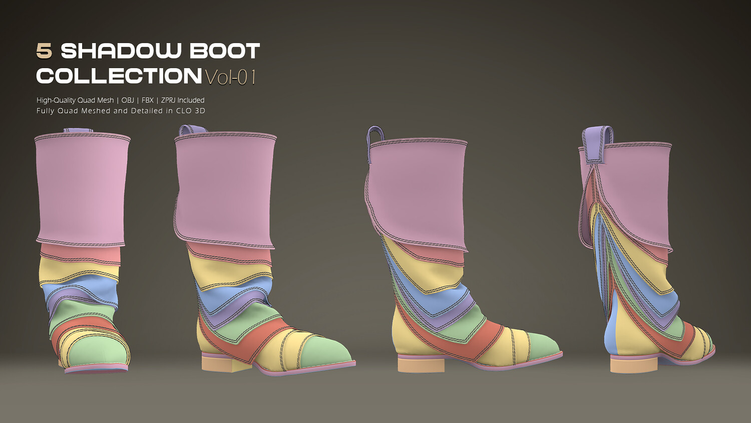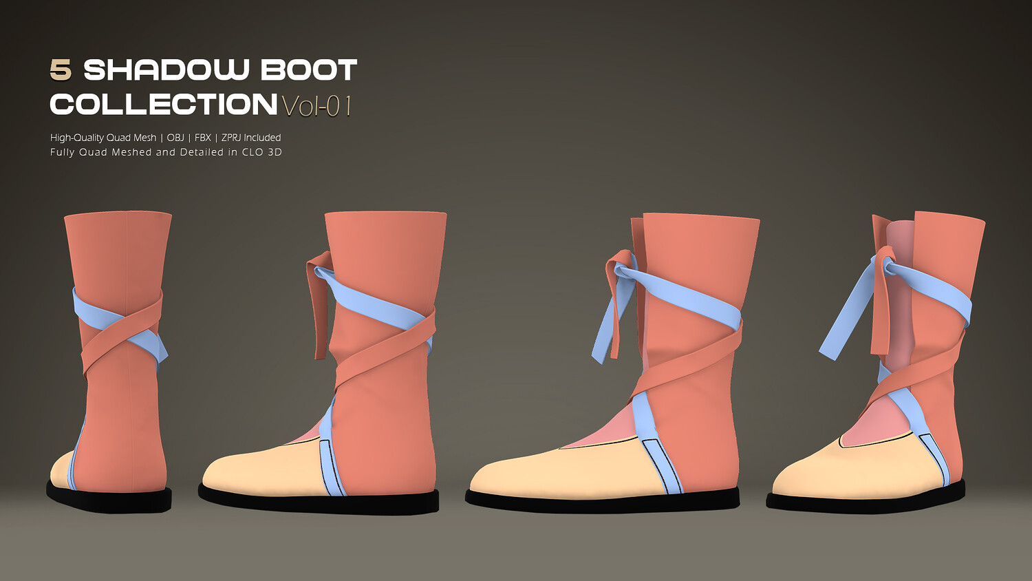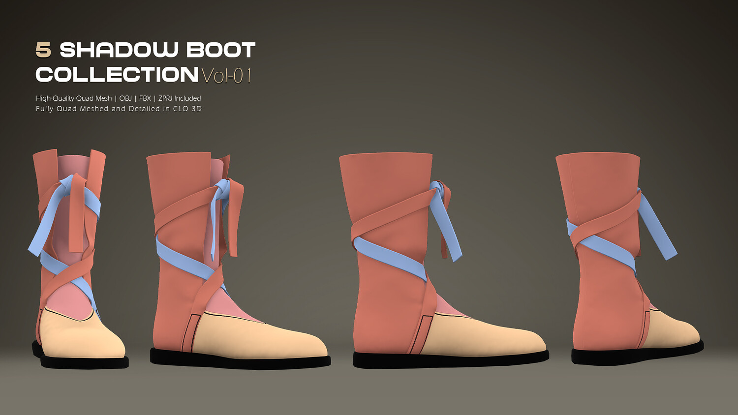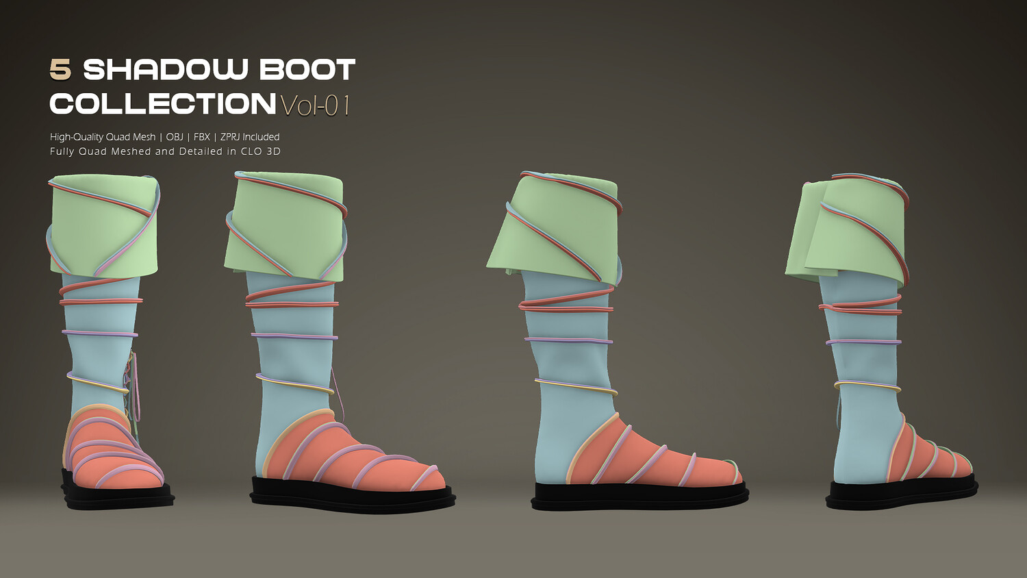 5 Shadow Boot Collection Vol.01 Step into the shadows with this exclusive collection of 5 high-fashion, fully detailed boots — designed and quad-meshed in CLO 3D. Perfect for character artists, stylists, and 3D creators looking to elevate their wardrobe assets.