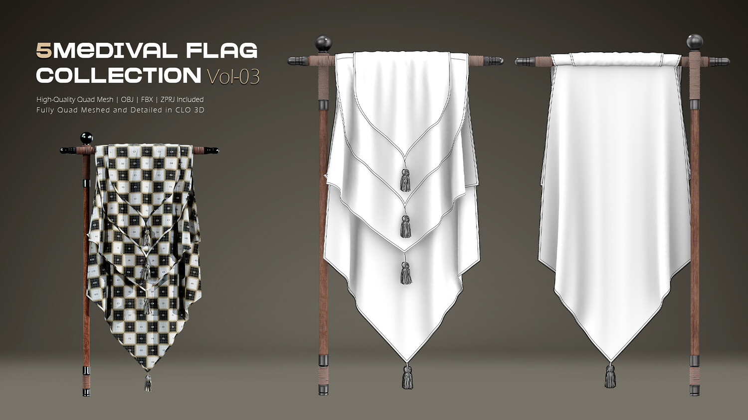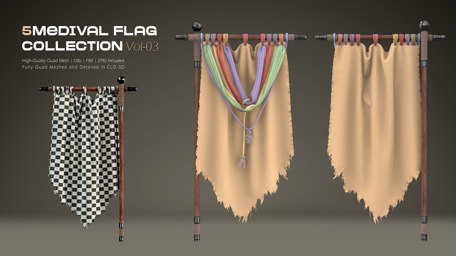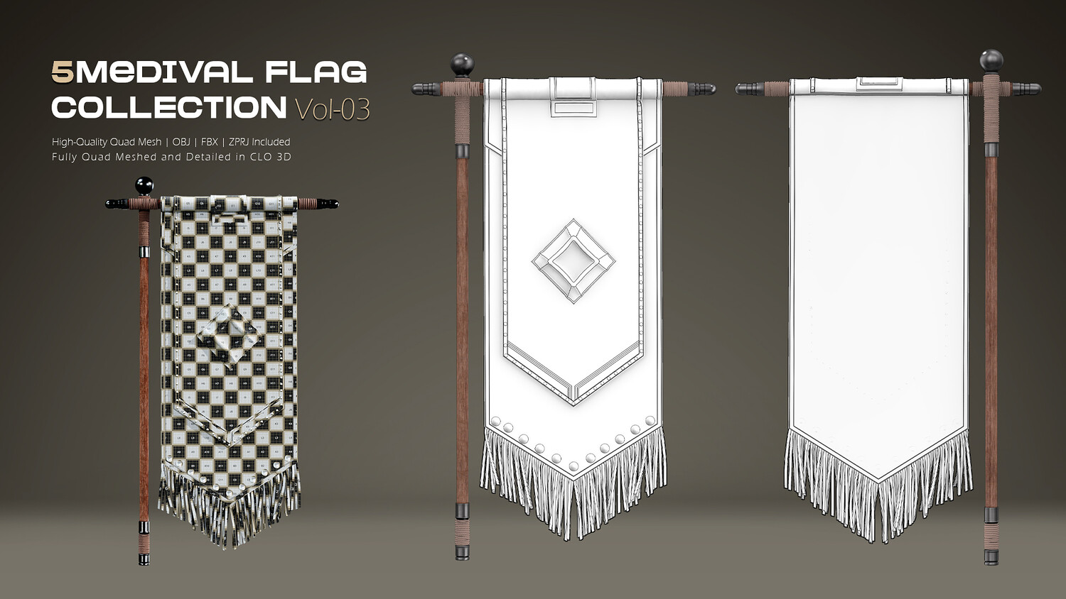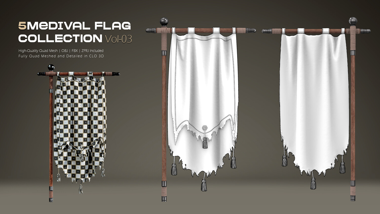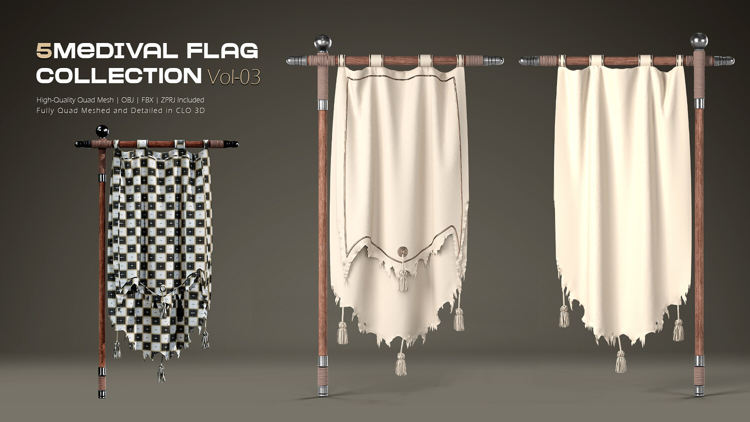 Features: Fully quad-meshed and clean topology Includes OBJ - FBX (Thick%Thin-Weld-Unweld)- ZPRJ formats Designed and detailed in CLO 3D Includes 5 unique flag styles – from worn and torn to noble and ceremonial designs Game-ready and production-optimized