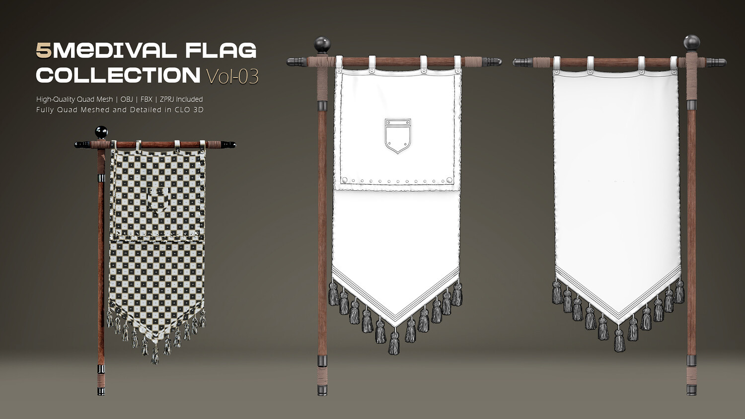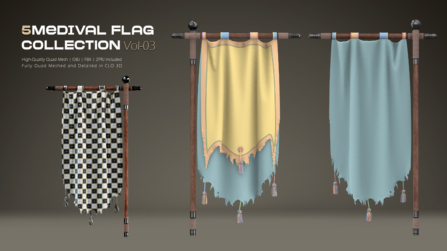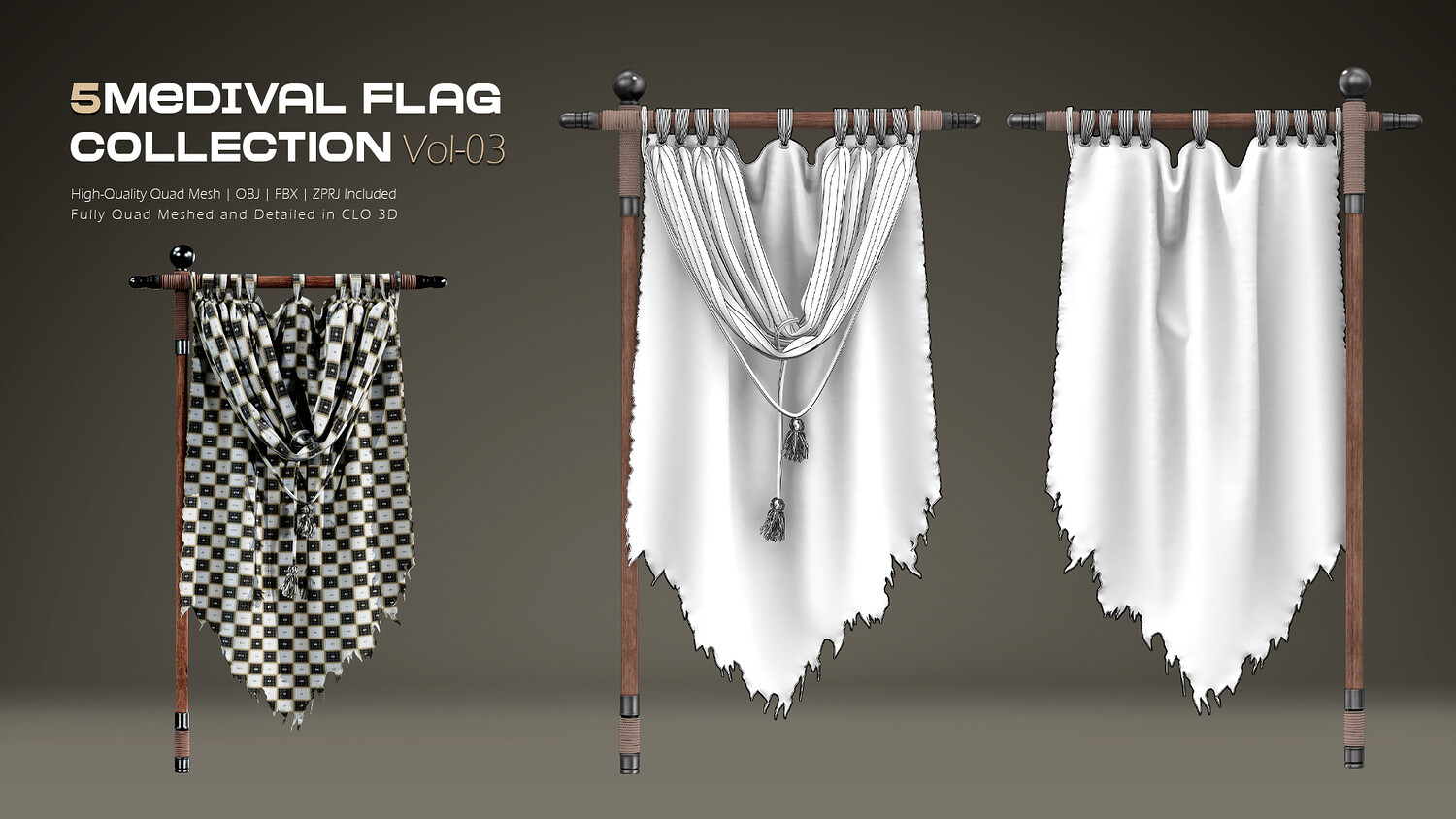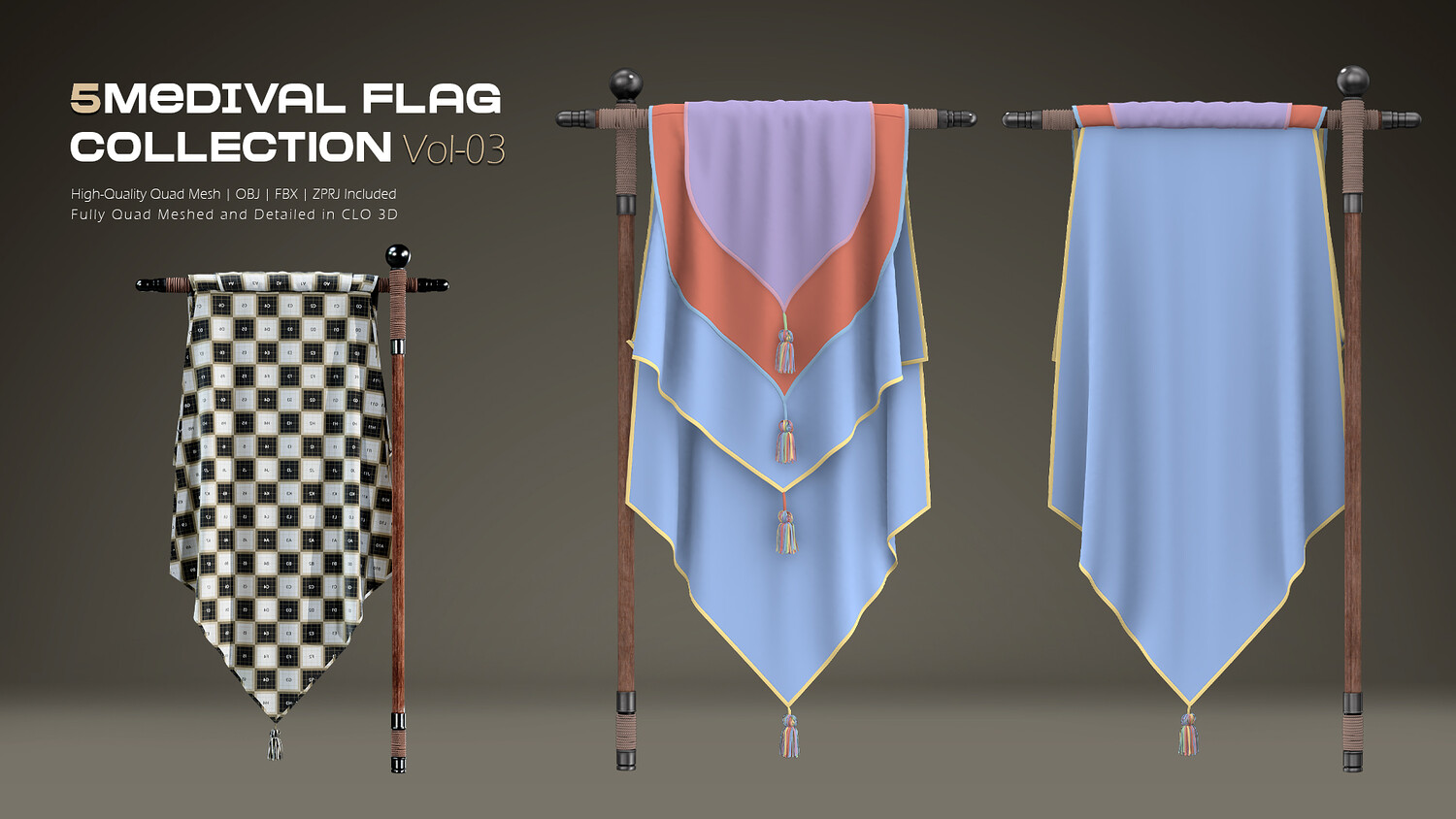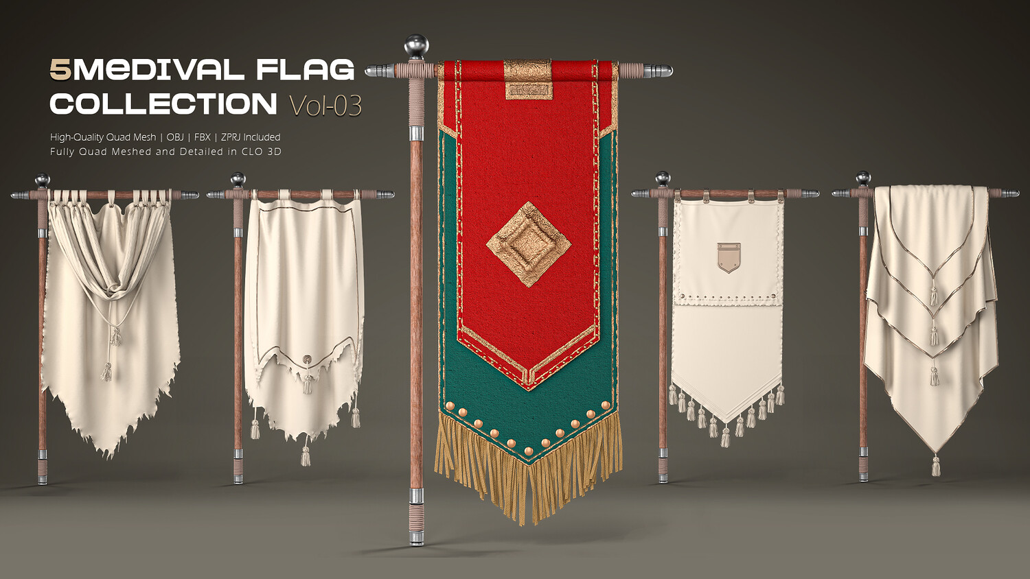 Features: Fully quad-meshed and clean topology Includes OBJ - FBX (Thick%Thin-Weld-Unweld)- ZPRJ formats Designed and detailed in CLO 3D Includes 5 unique flag styles – from worn and torn to noble and ceremonial designs Game-ready and production-optimized