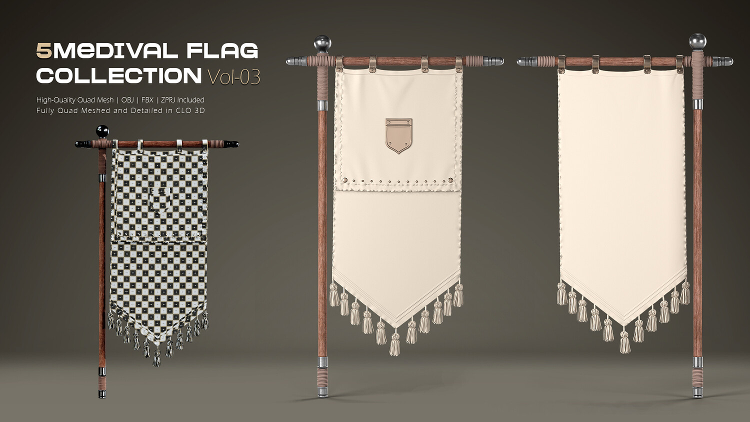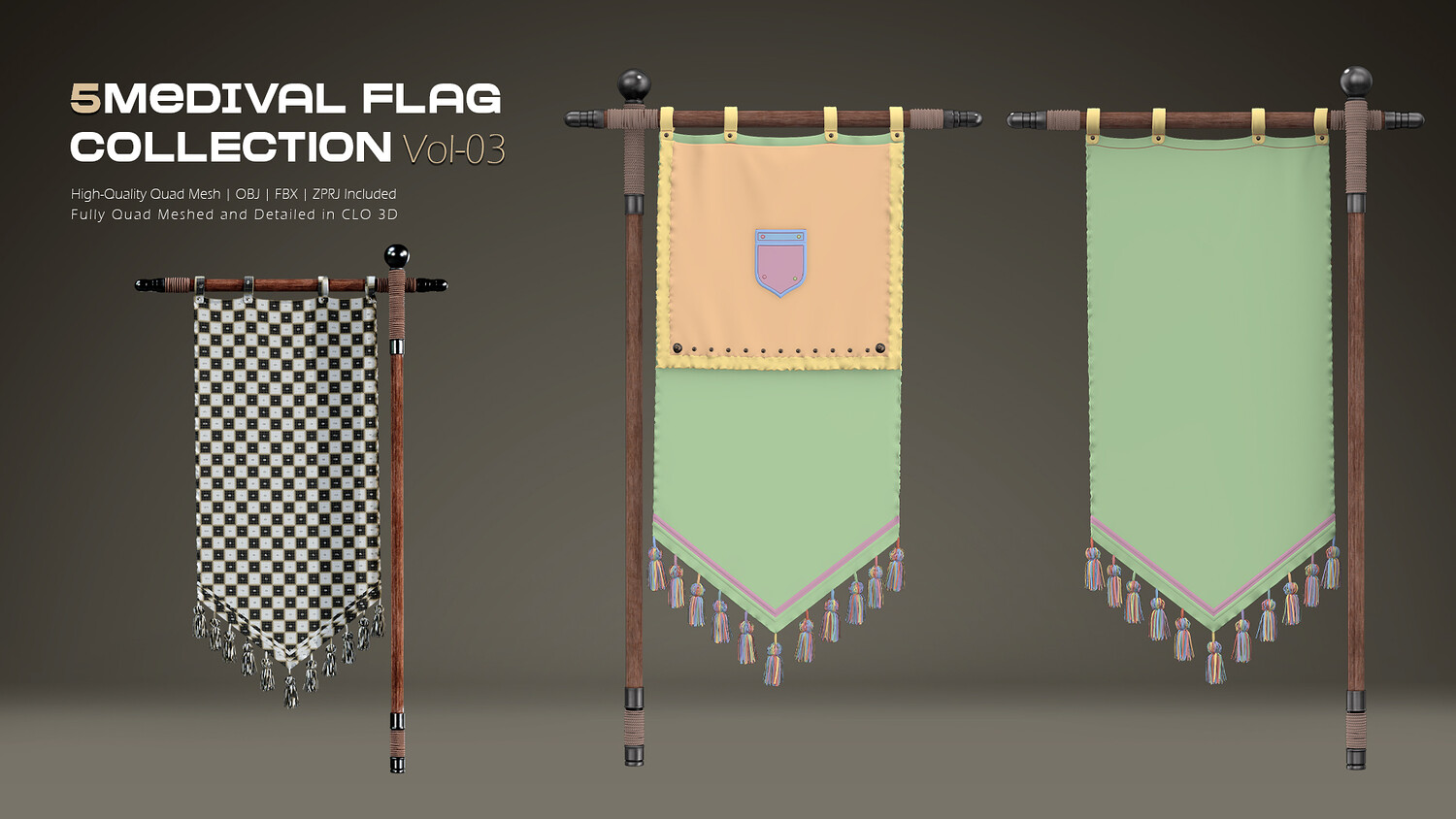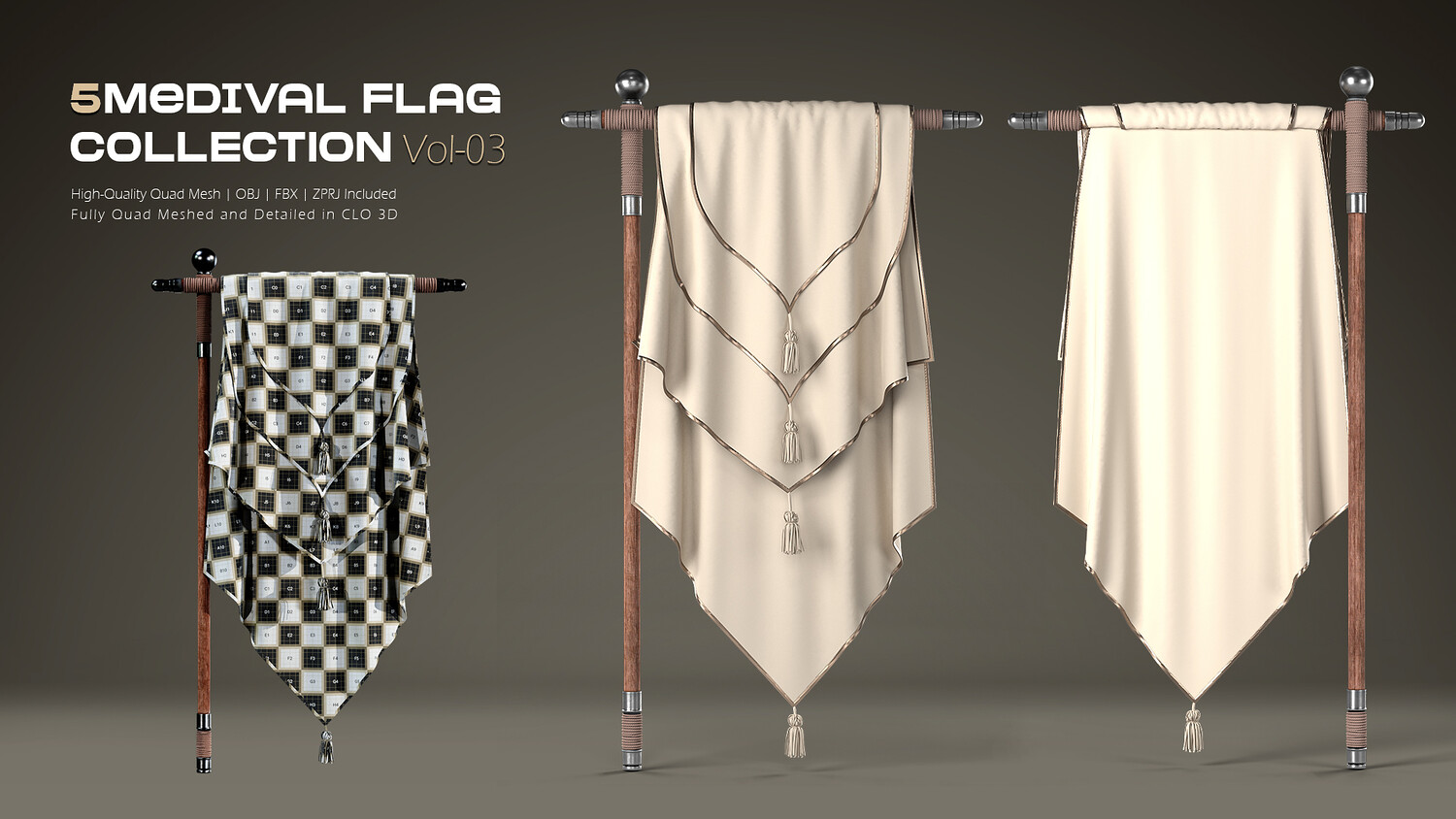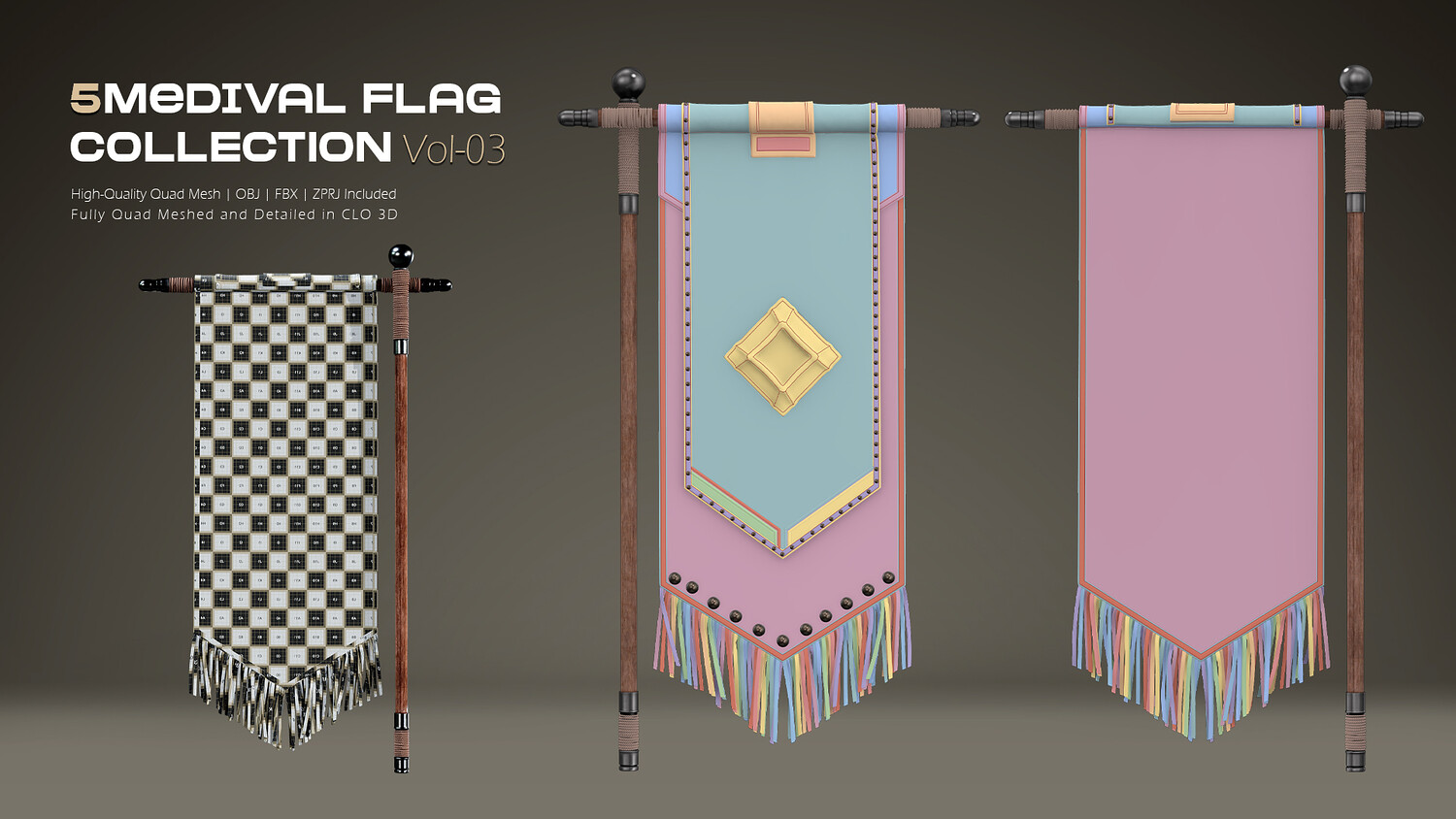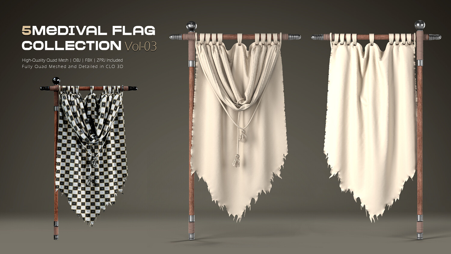 Features: Fully quad-meshed and clean topology Includes OBJ - FBX (Thick%Thin-Weld-Unweld)- ZPRJ formats Designed and detailed in CLO 3D Includes 5 unique flag styles – from worn and torn to noble and ceremonial designs Game-ready and production-optimized