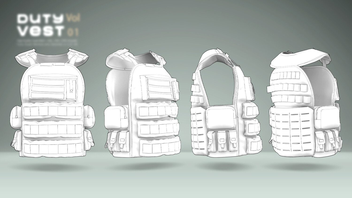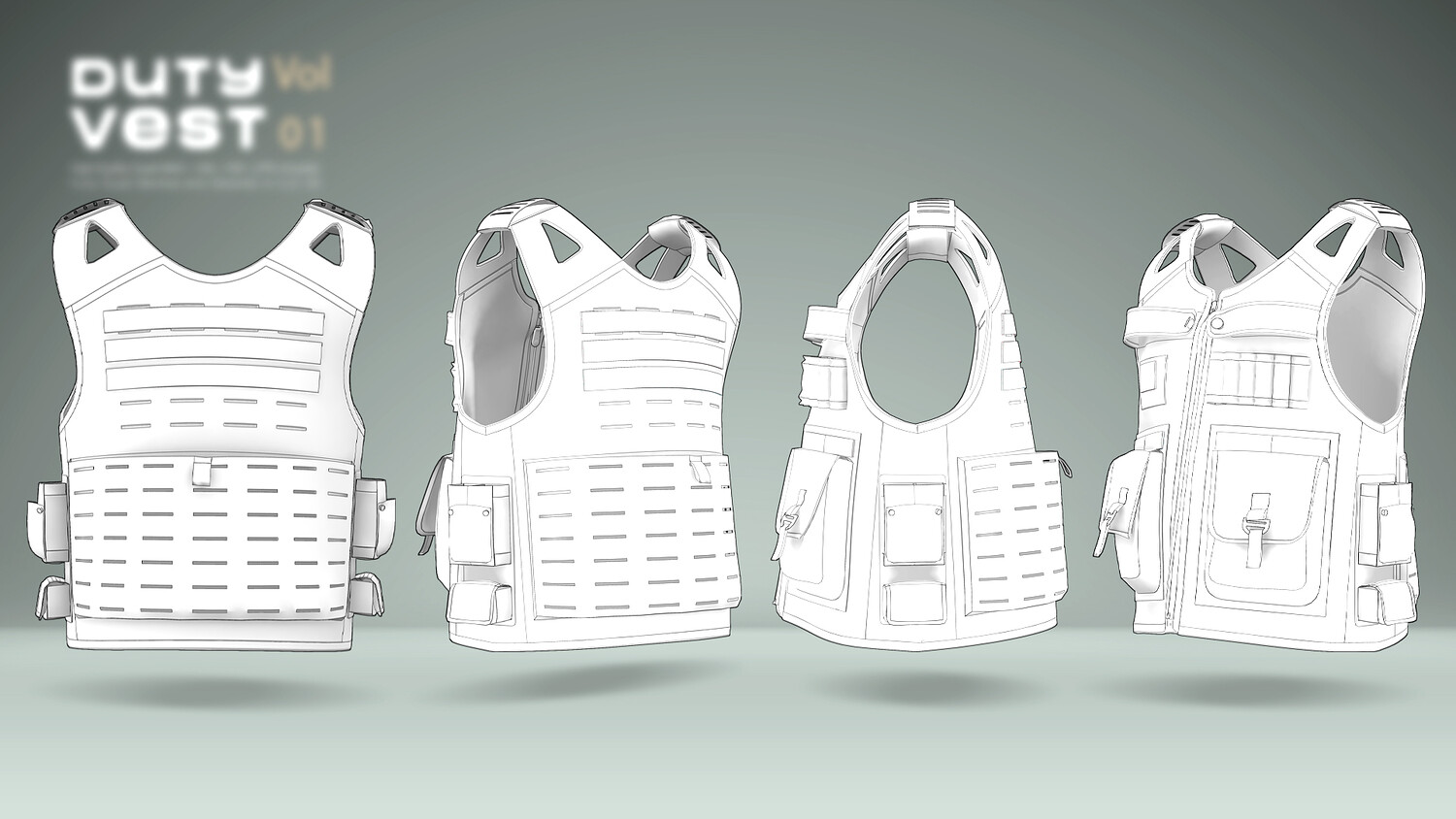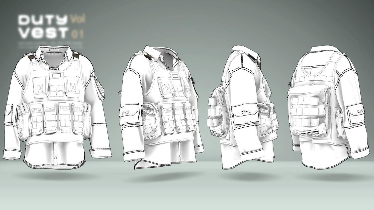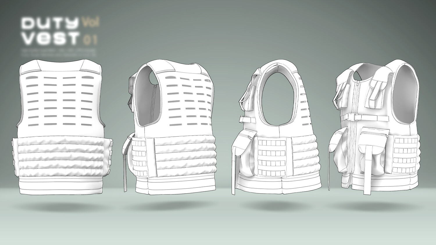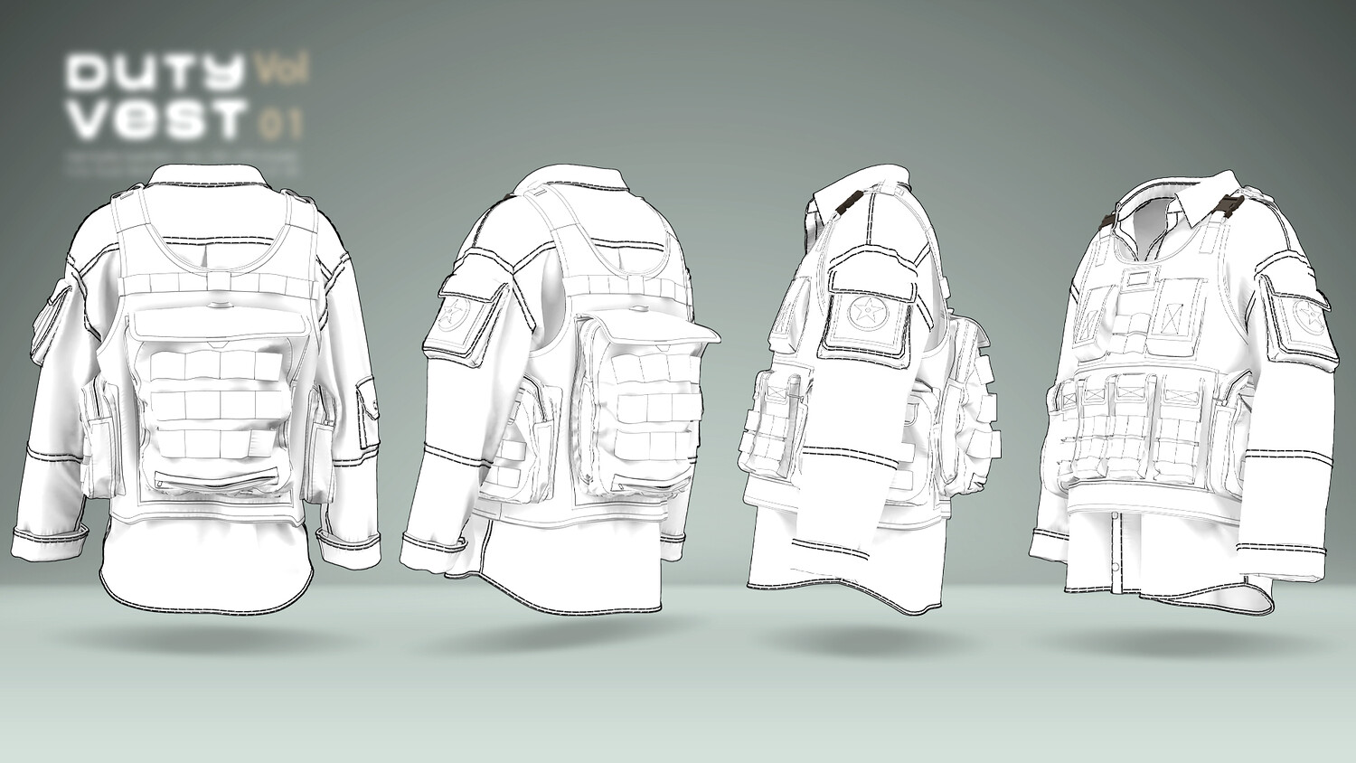 Duty Vest Vol. 01 is a high-quality set of five uniquely designed tactical vests, optimized for use in uniform outfits across game development, digital fashion, cinematic projects, and 3D character design.