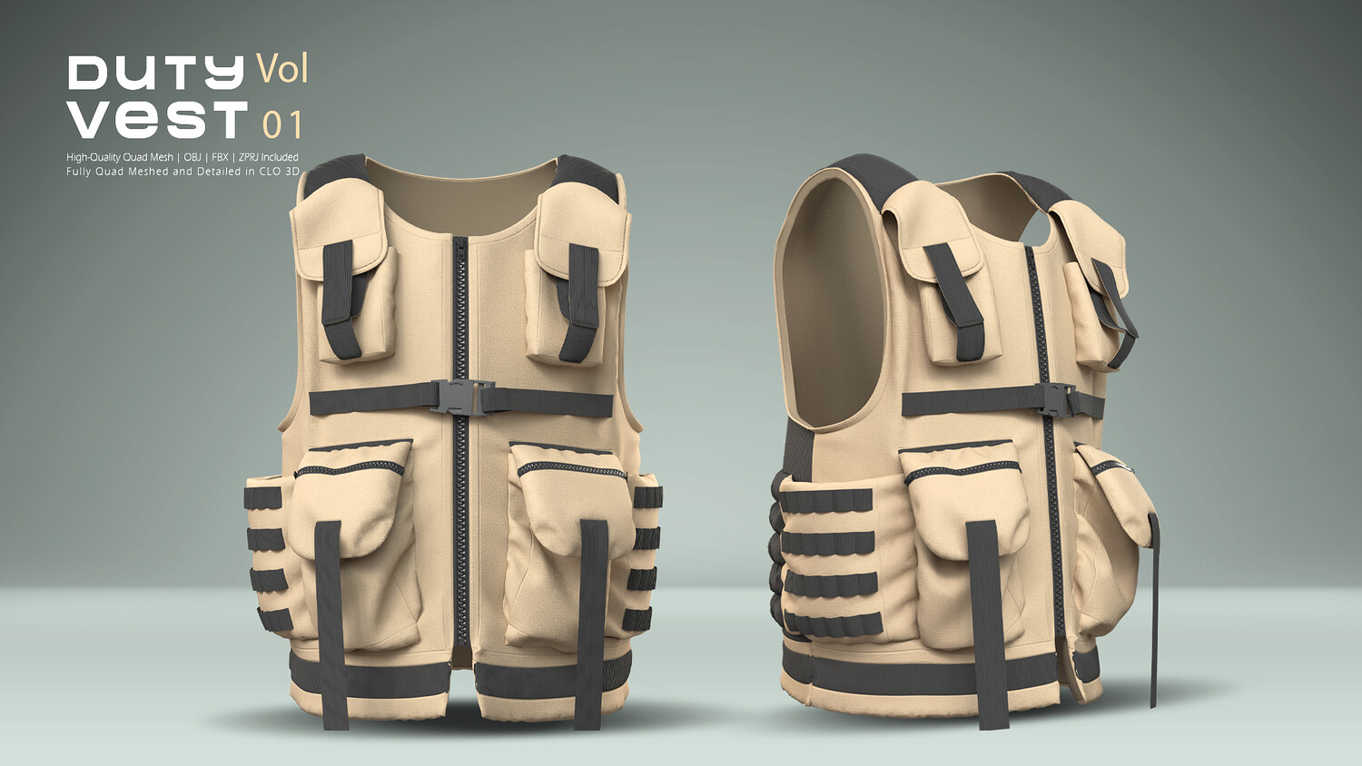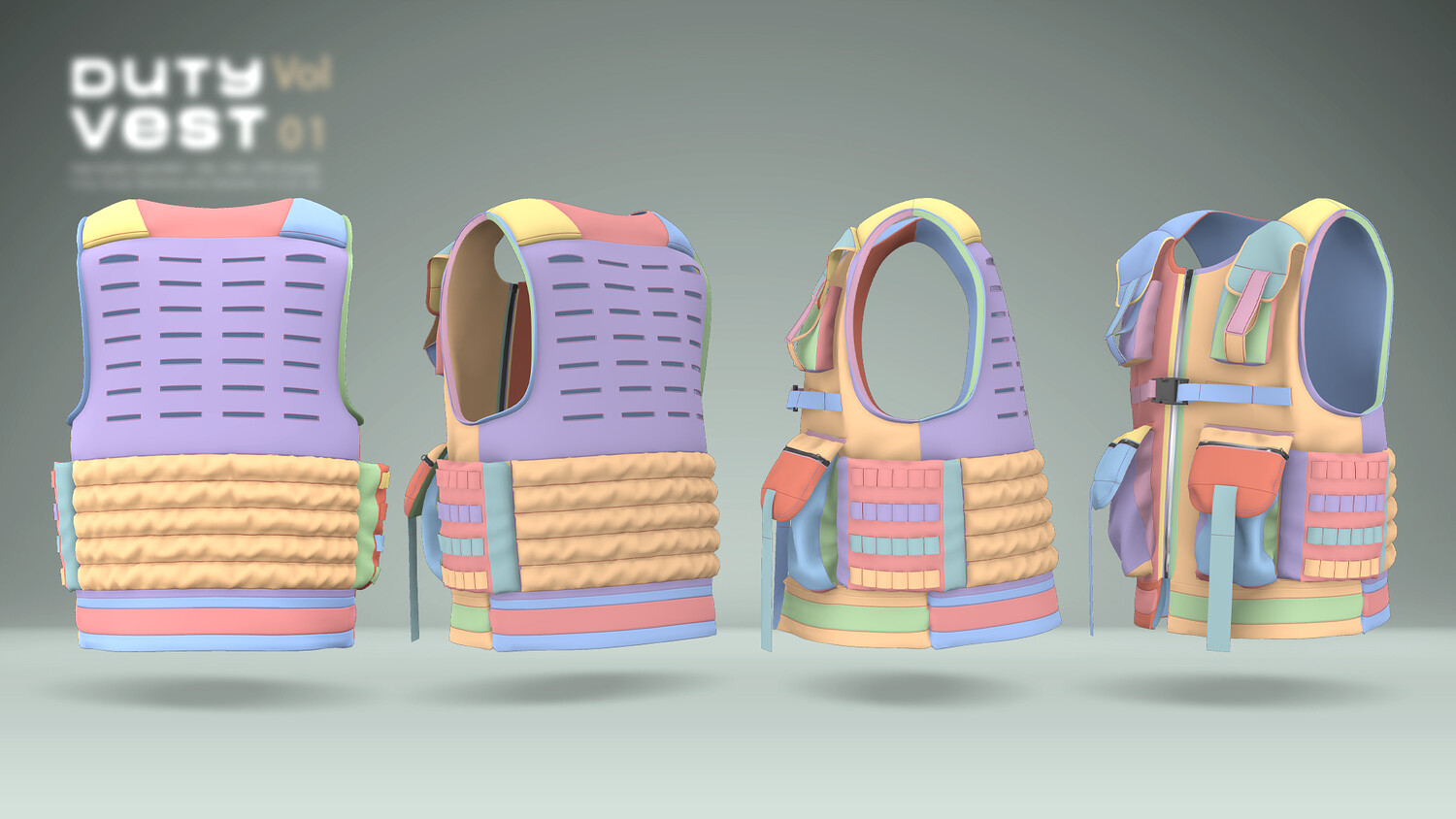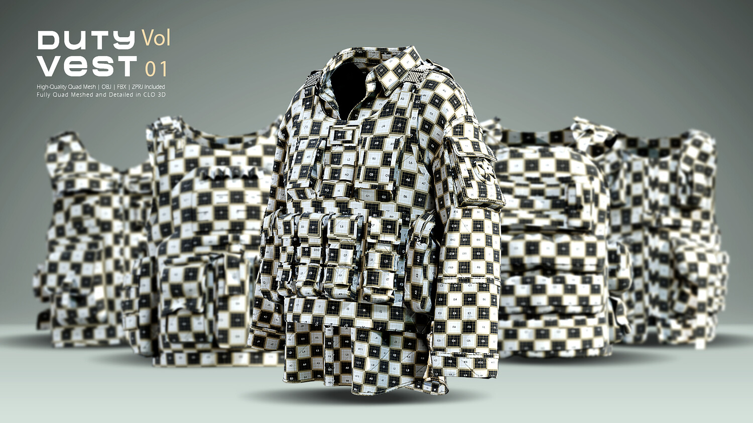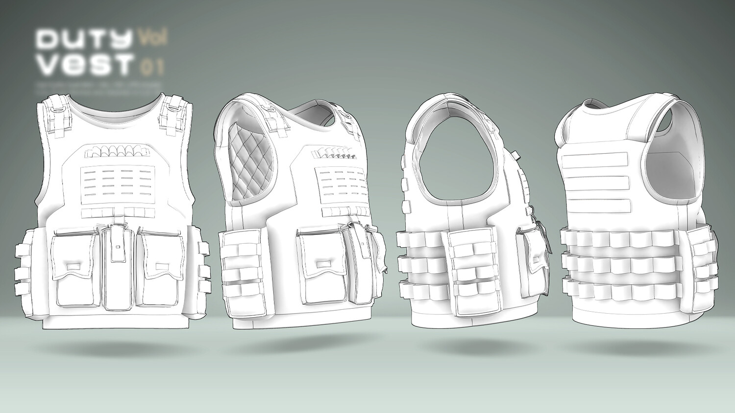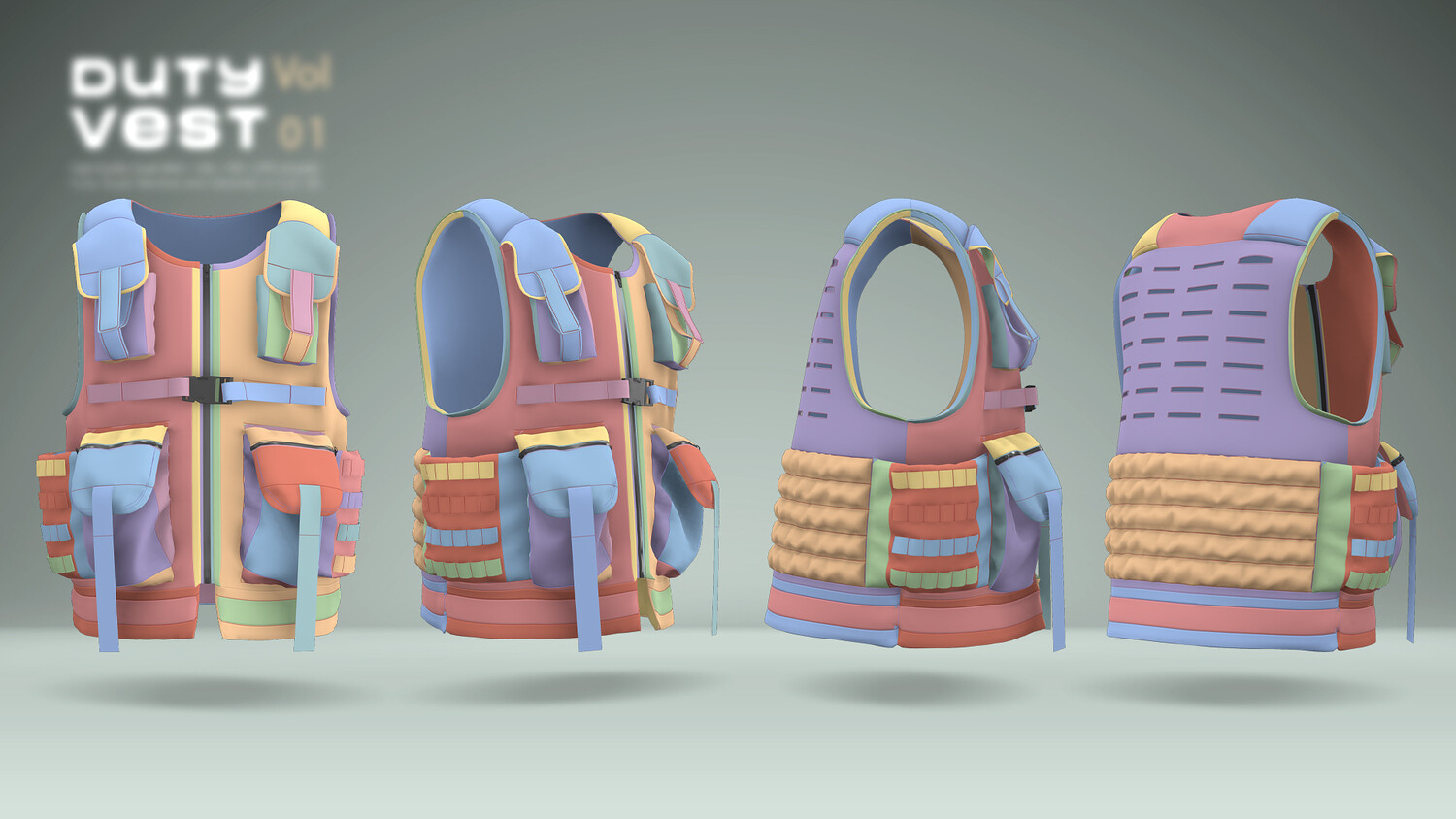 Duty Vest Vol. 01 is a high-quality set of five uniquely designed tactical vests, optimized for use in uniform outfits across game development, digital fashion, cinematic projects, and 3D character design.
