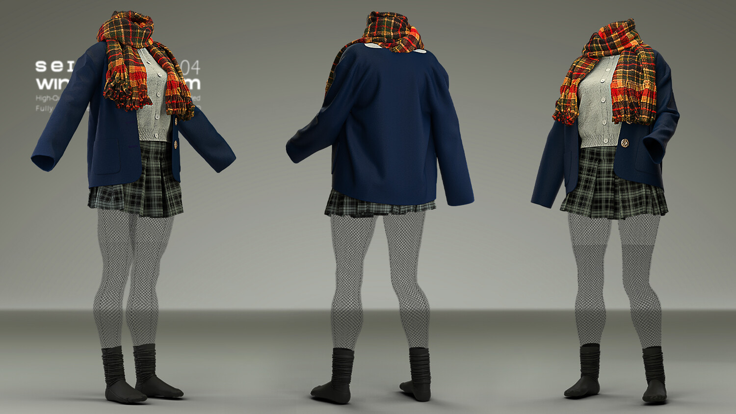 This collection features five unique Japanese-style school uniforms, ranging from classic sailor suits to cozy modern layers, perfect for anime characters, stylized fashion, or virtual storytelling. Each look is carefully crafted with detailed accessories, seasonal variations, and realistic cloth simulation.