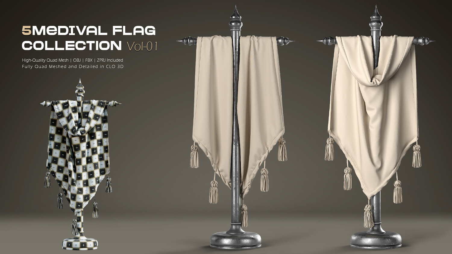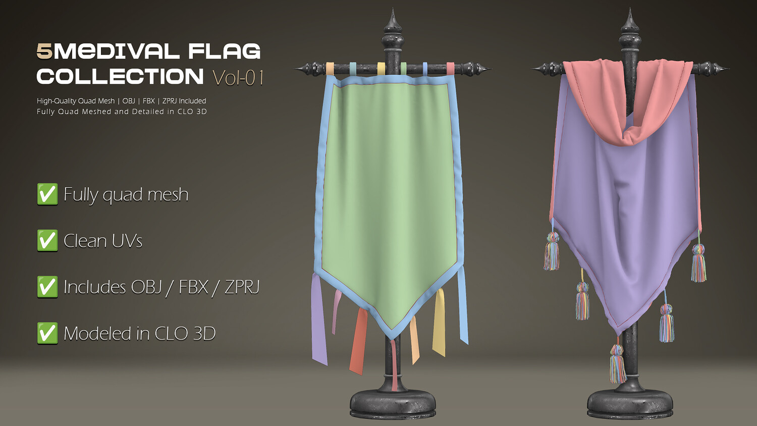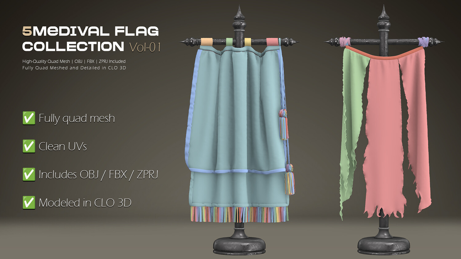 ✨ Features: ✔️ Fully quad-meshed and clean topology ✔️ Includes OBJ / FBX / ZPRJ formats ✔️ Designed and detailed in CLO 3D ✔️ Includes 5 unique flag styles – from worn and torn to noble and ceremonial designs ✔️ Game-ready and production-optimized