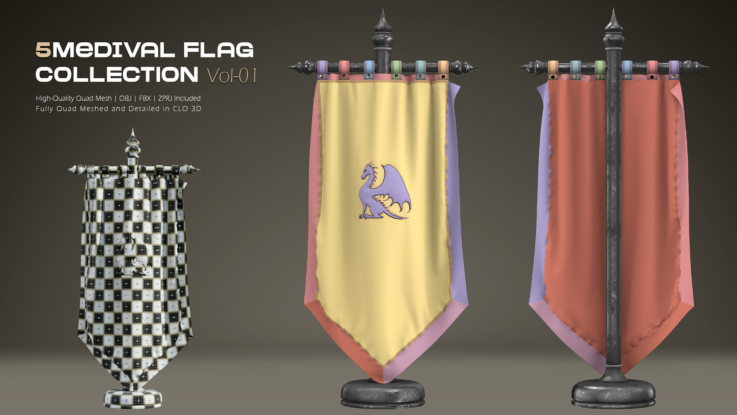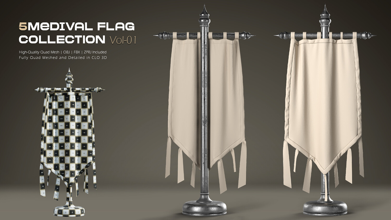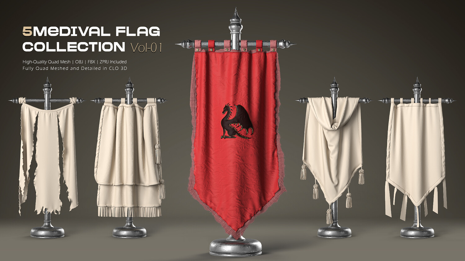 ✨ Features: ✔️ Fully quad-meshed and clean topology ✔️ Includes OBJ / FBX / ZPRJ formats ✔️ Designed and detailed in CLO 3D ✔️ Includes 5 unique flag styles – from worn and torn to noble and ceremonial designs ✔️ Game-ready and production-optimized