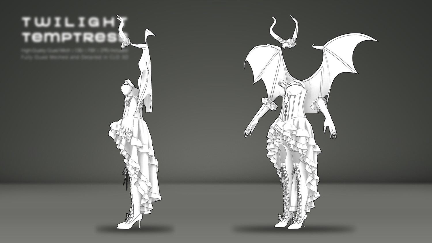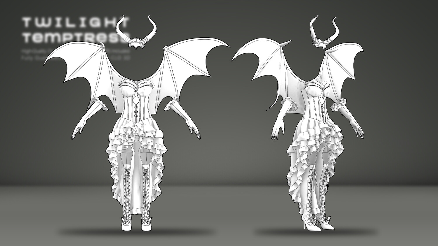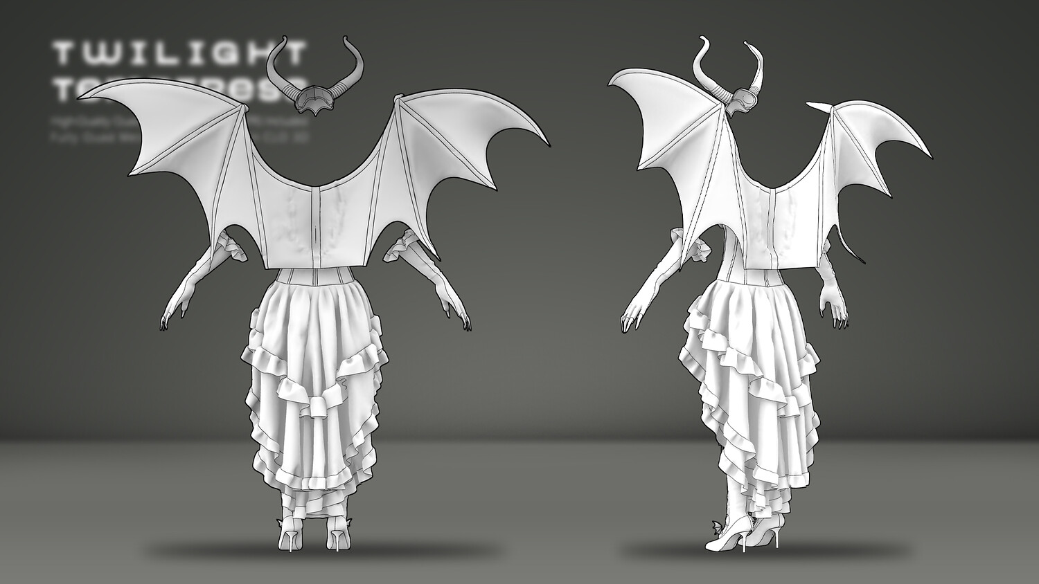 🌒 Twilight Temptress – Dark Elegance Reimagined 🦇 Step into the shadowy world of fantasy with Twilight Temptress – a high-detail 3D outfit crafted in CLO 3D for otherworldly queens. Featuring intricate lacework, sculpted horns, and dragon wings, this set merges gothic elegance with powerful mystique.