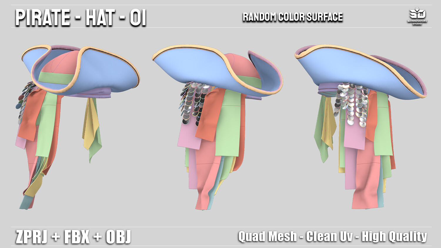 Detailed pirate-style tricorn hat with colorful feathers and coins – perfect for game characters, animation, or cosplay visualization.