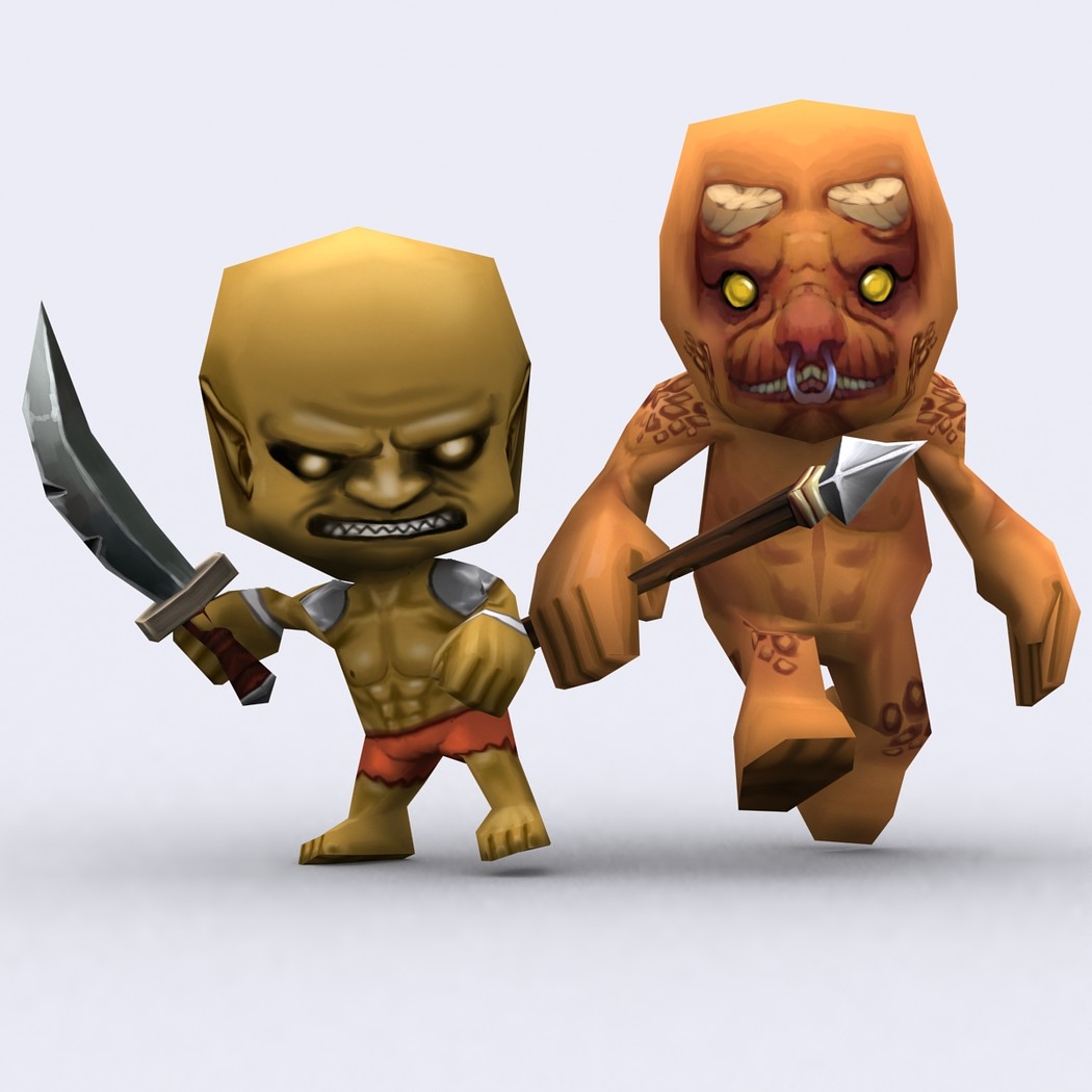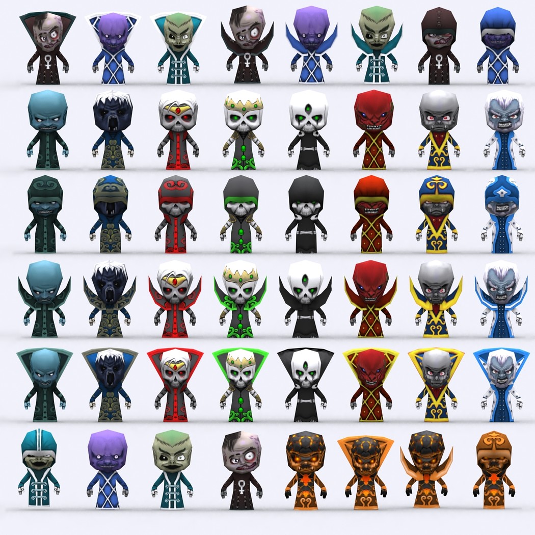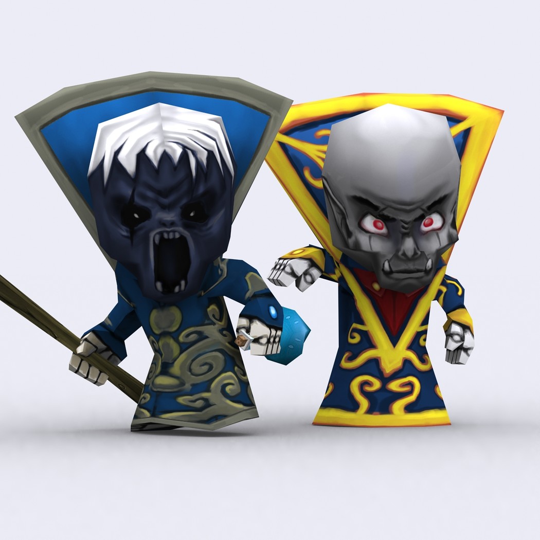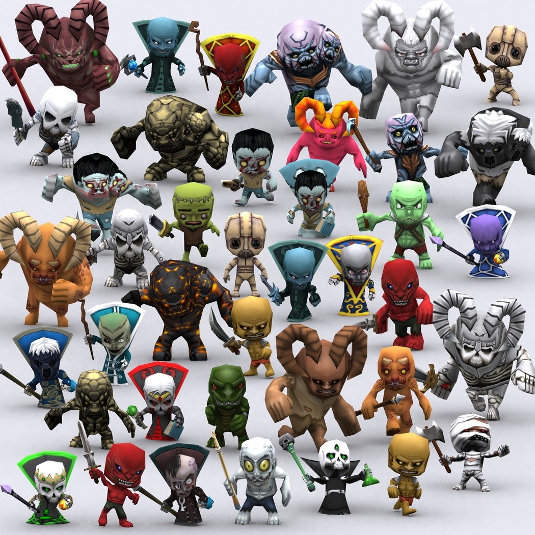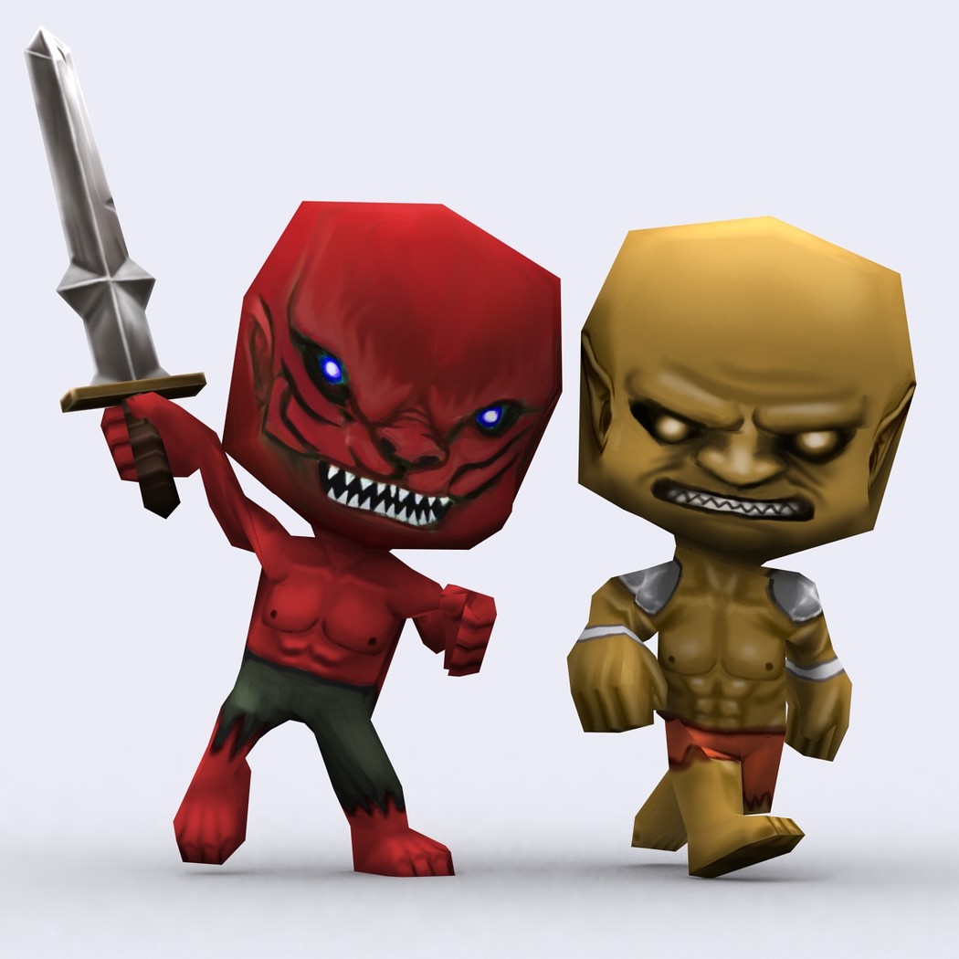 Chibii monsters: mages and demons. 4 mages meshes + 12 texture skins for each 4 demons meshes + 21 texture skins for each just 300-400 tris per mesh. 26 custom items: staves, swords magical items. 2048x2048 .tga textures