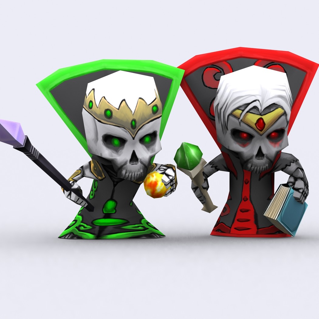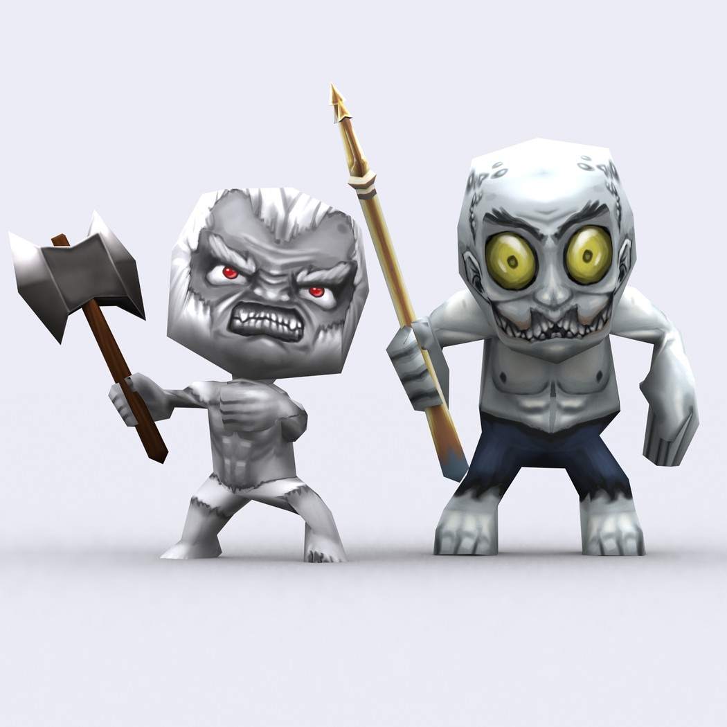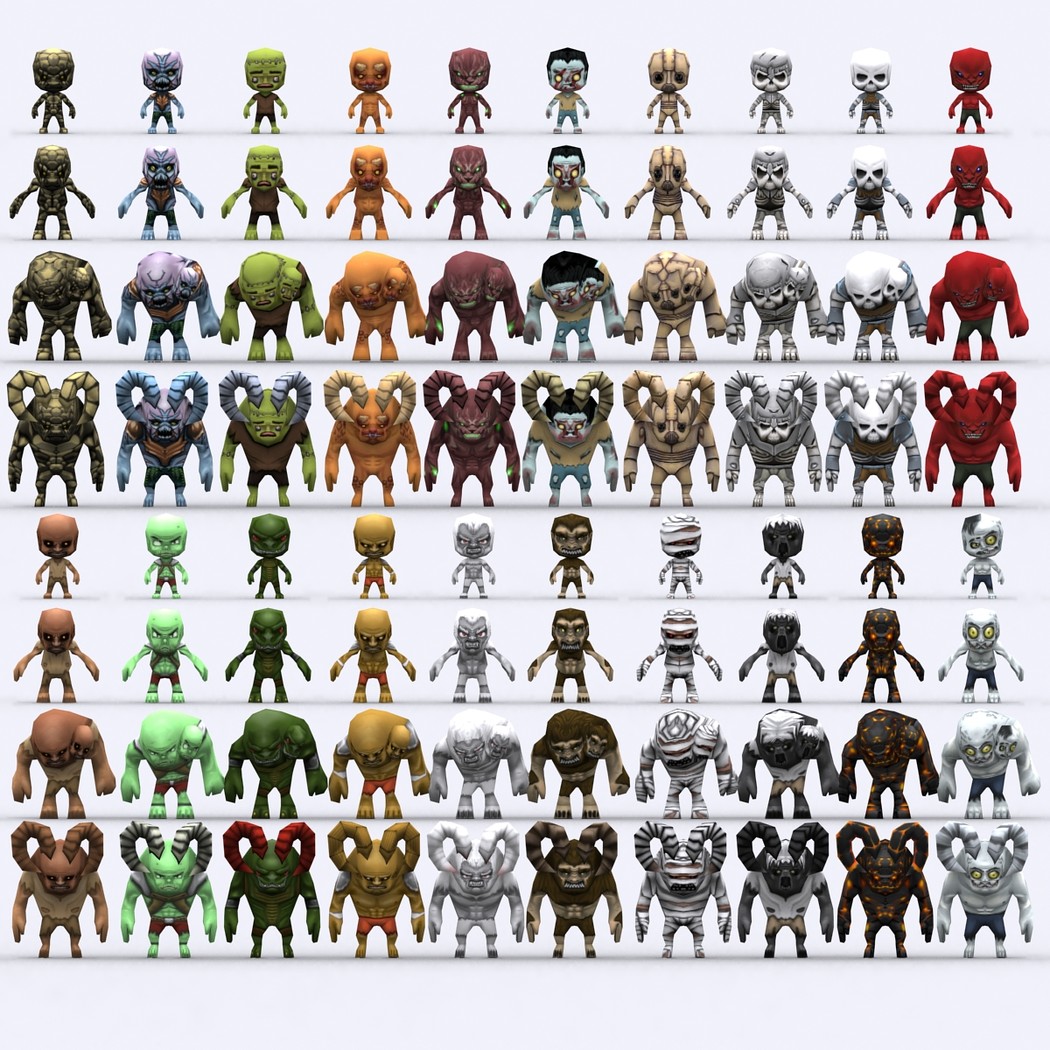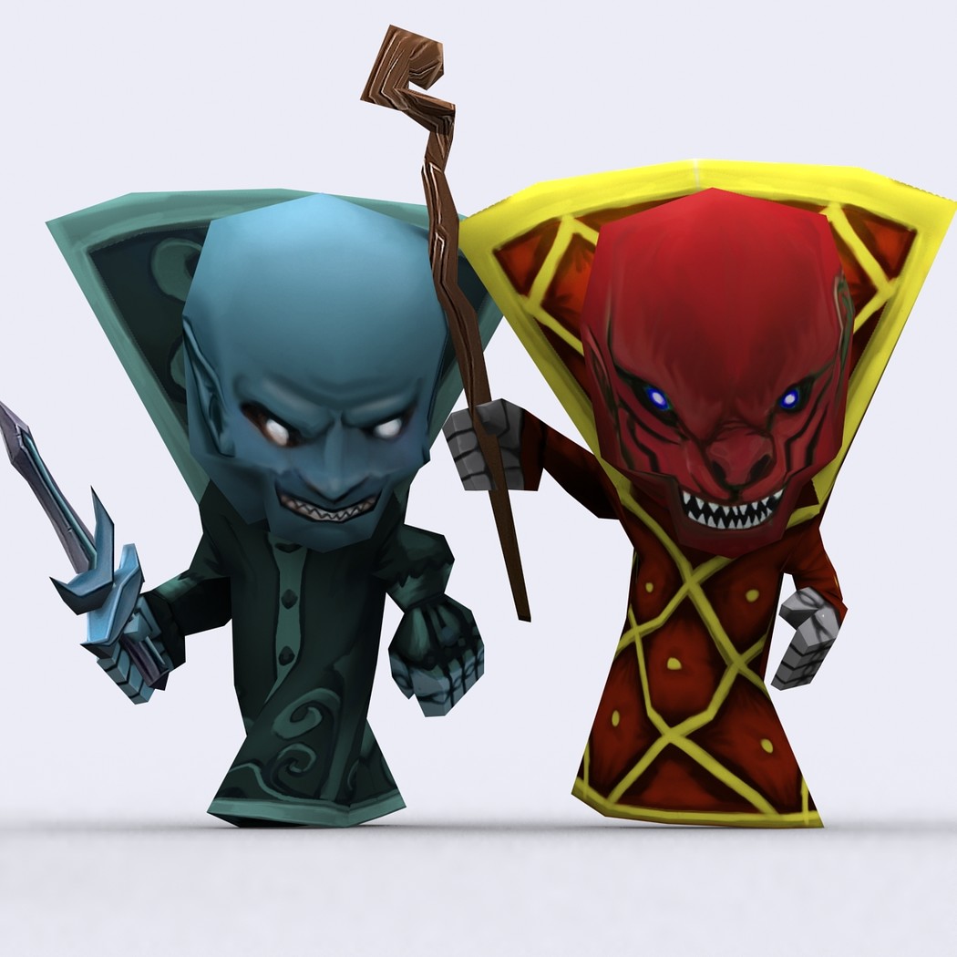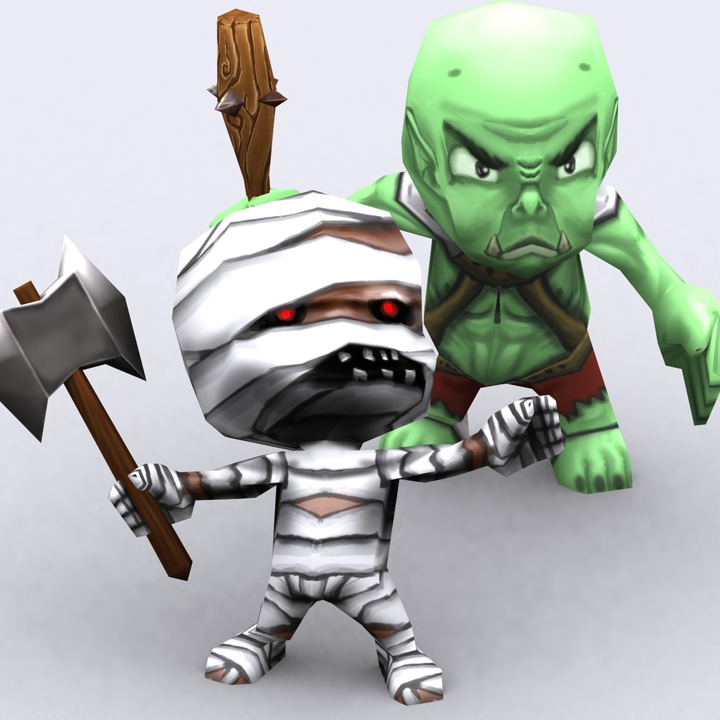 Chibii monsters: mages and demons. 4 mages meshes + 12 texture skins for each 4 demons meshes + 21 texture skins for each just 300-400 tris per mesh. 26 custom items: staves, swords magical items. 2048x2048 .tga textures